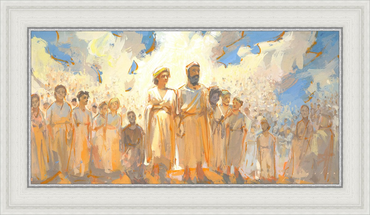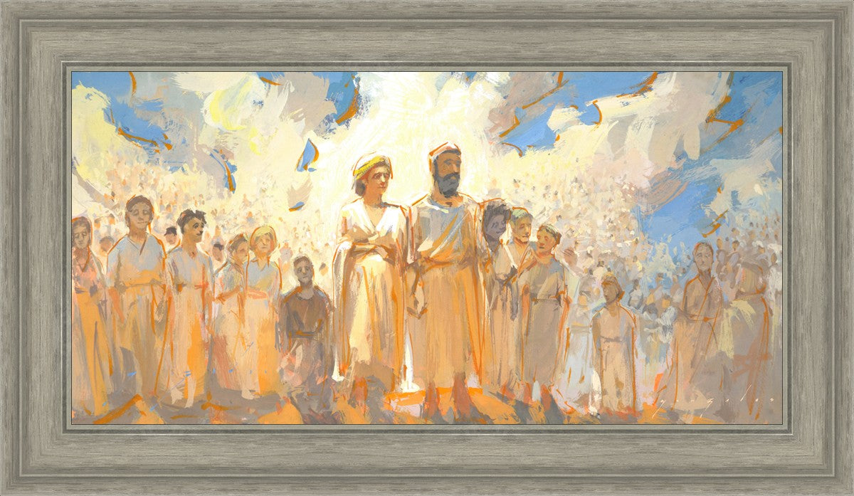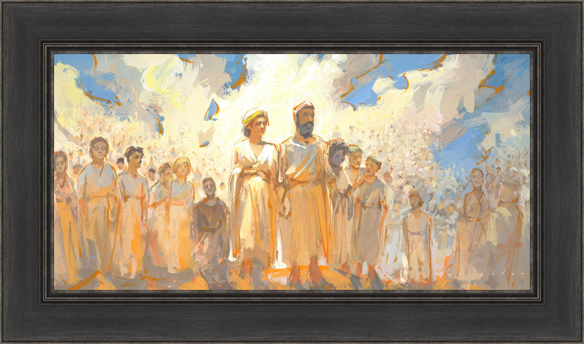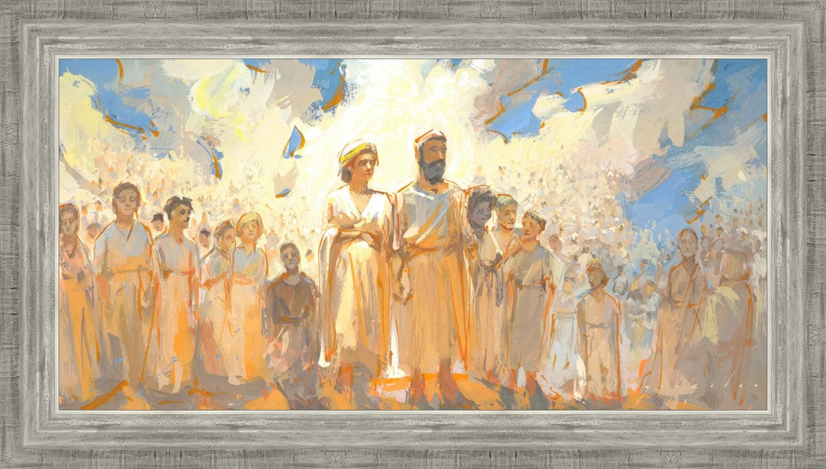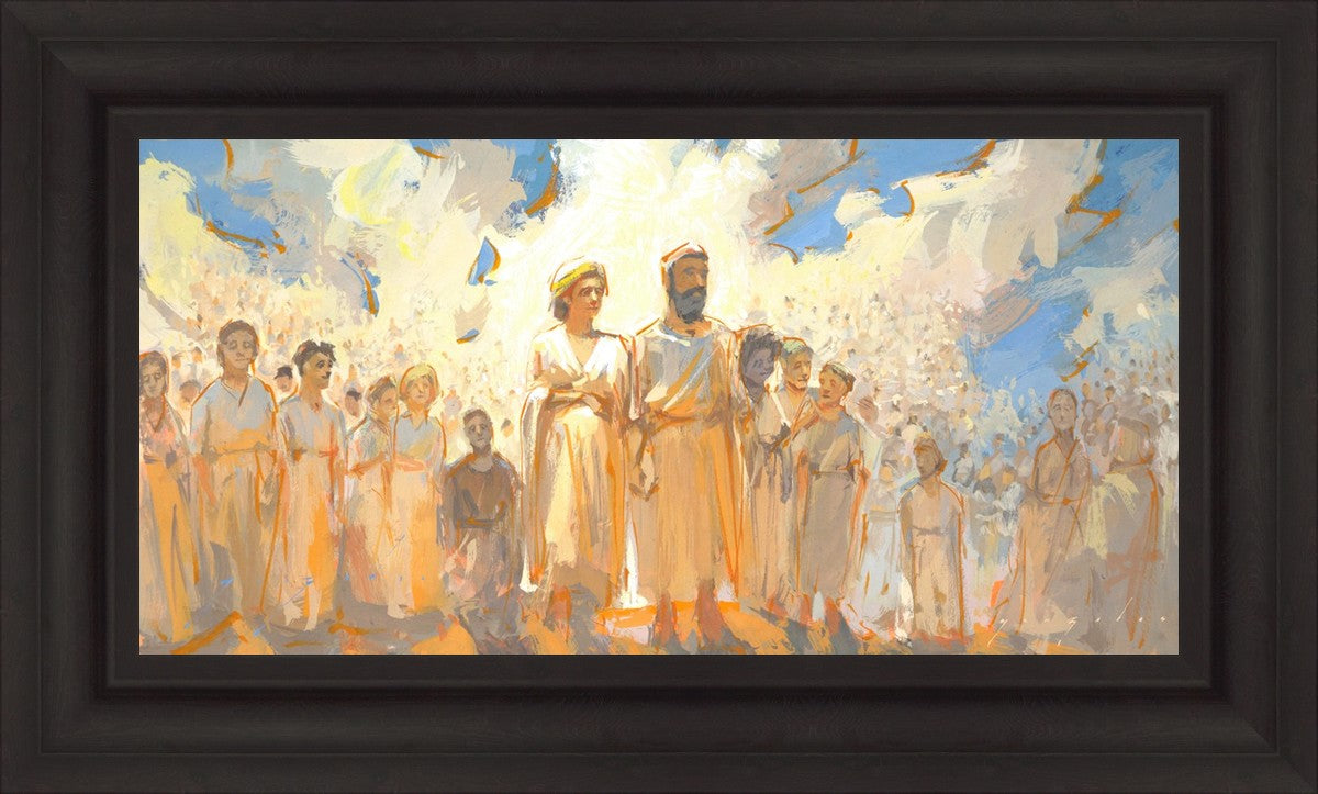 This is an eternal heavenly family. Their heavenly parents are surrounded by their posterity of children that seems to go on forever. These figures continue on into the background and appear to blend into the clouds. This particular moment seems to have a sense of rejoicing in all that has been accomplished to this point.