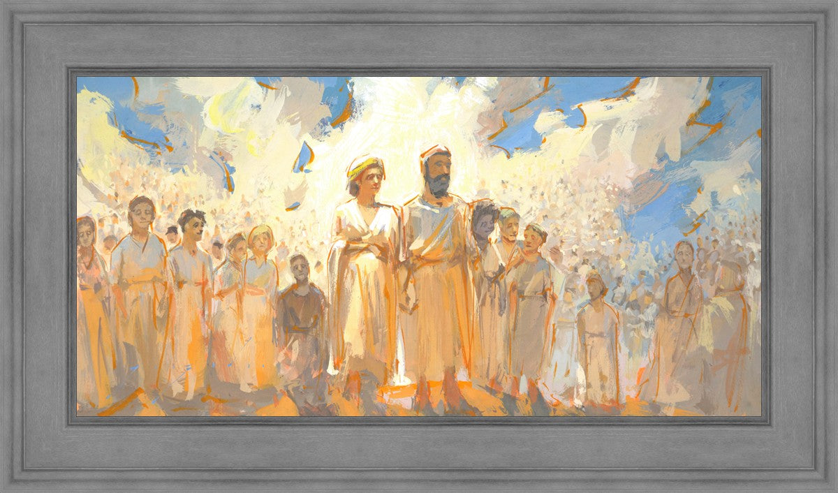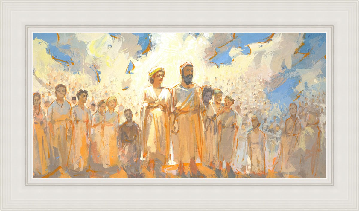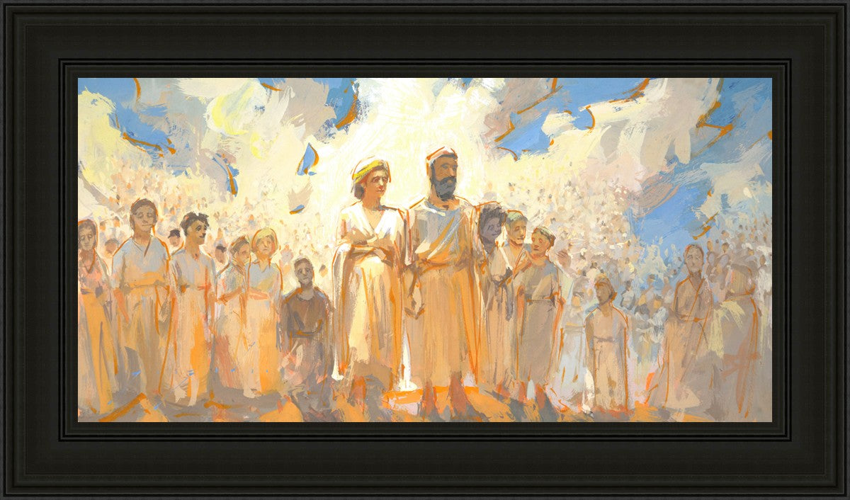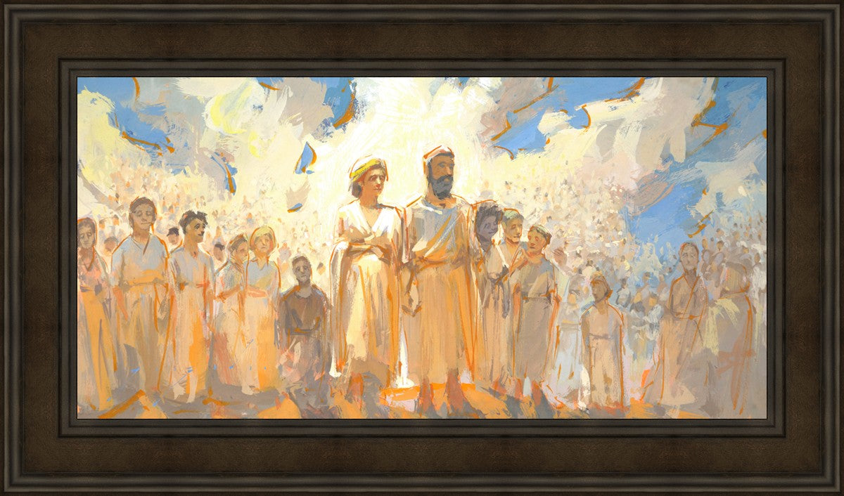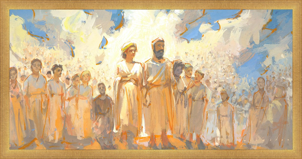 This is an eternal heavenly family. Their heavenly parents are surrounded by their posterity of children that seems to go on forever. These figures continue on into the background and appear to blend into the clouds. This particular moment seems to have a sense of rejoicing in all that has been accomplished to this point.