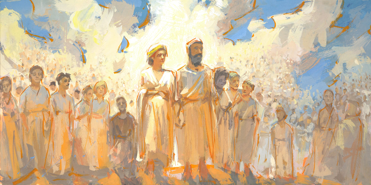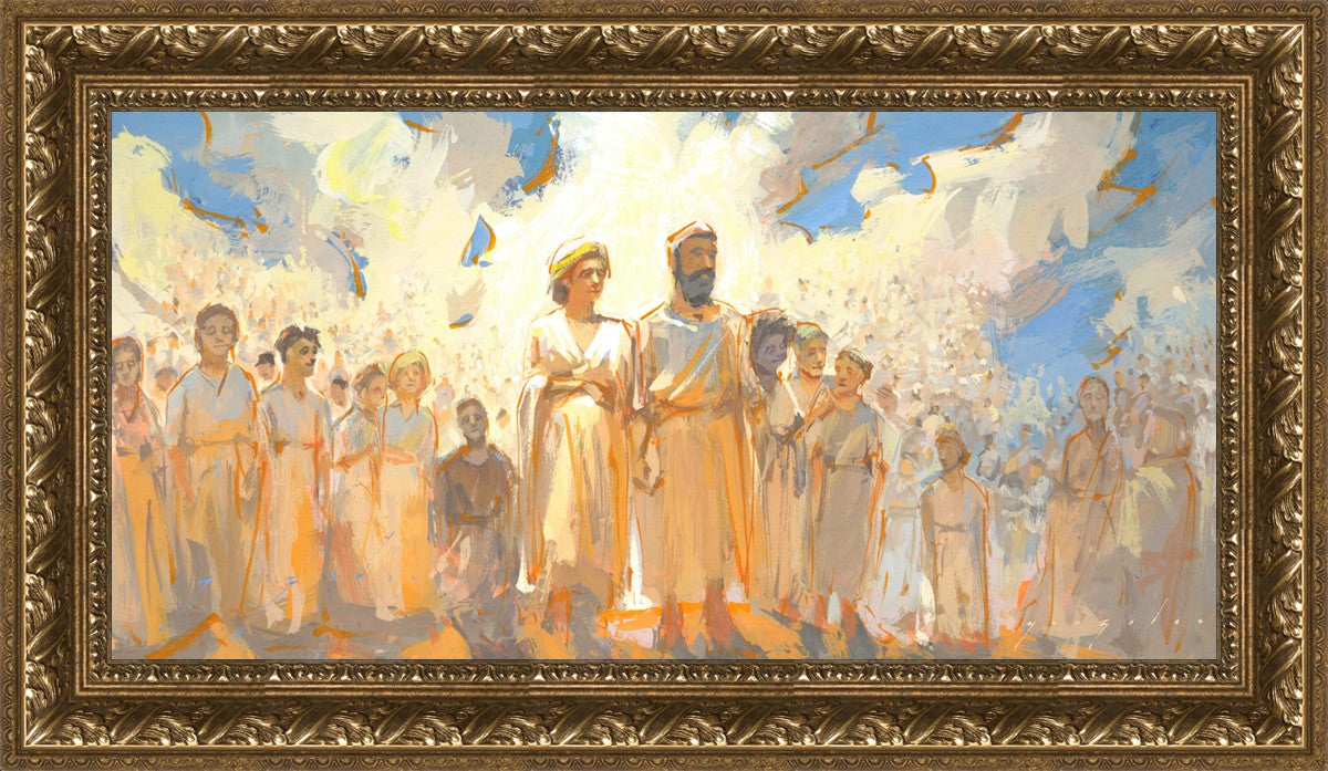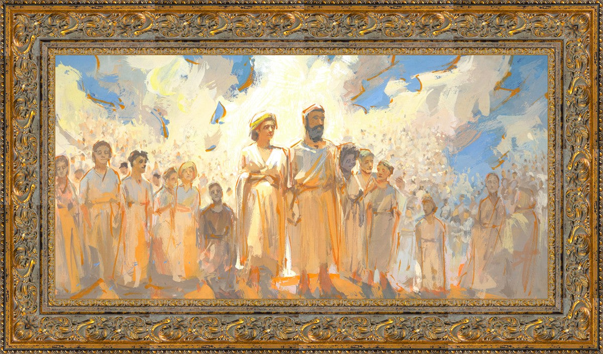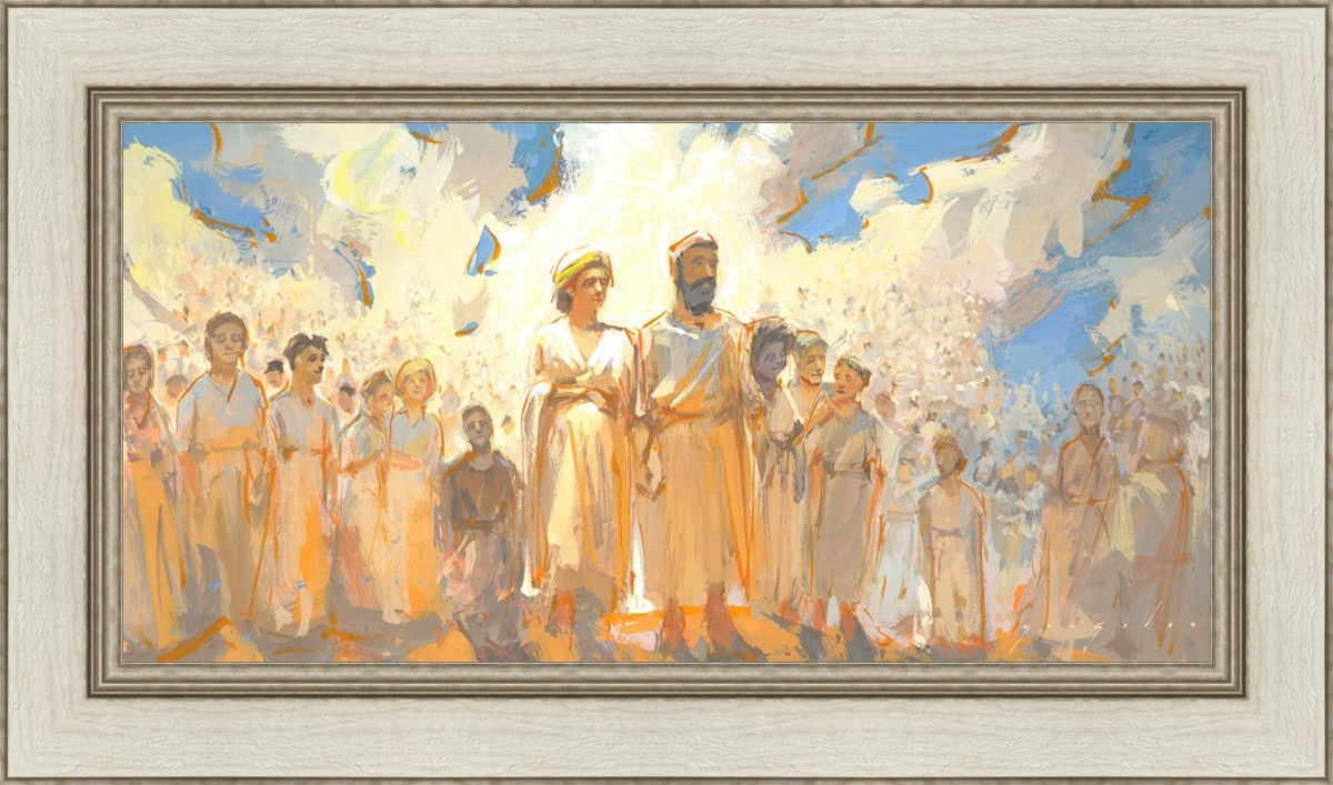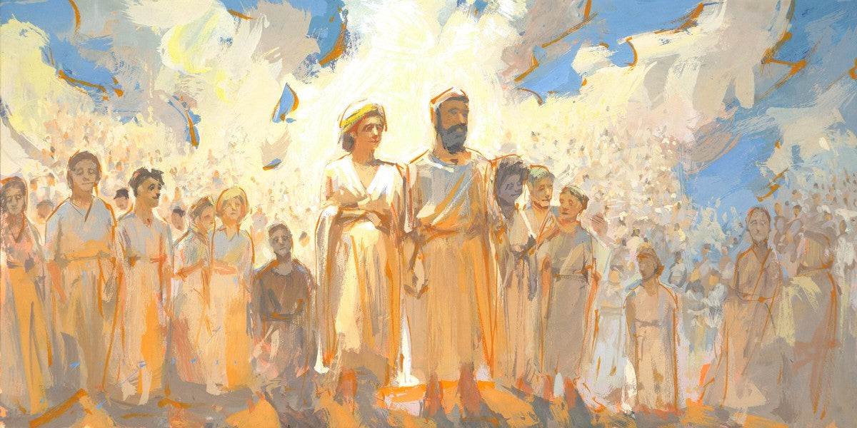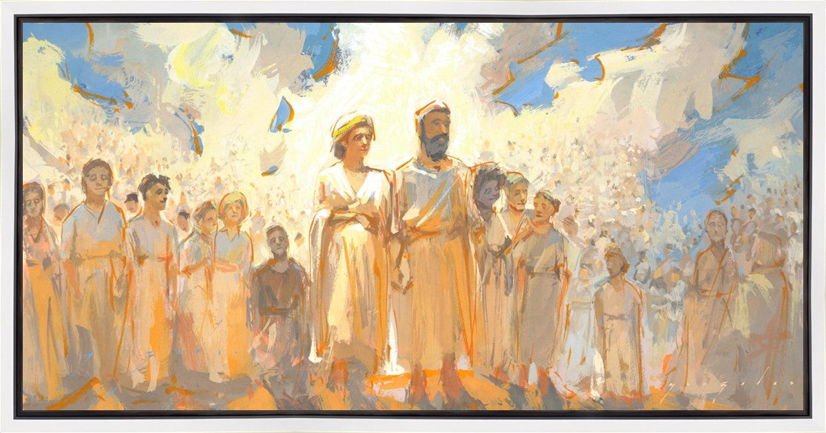 This is an eternal heavenly family. Their heavenly parents are surrounded by their posterity of children that seems to go on forever. These figures continue on into the background and appear to blend into the clouds. This particular moment seems to have a sense of rejoicing in all that has been accomplished to this point.