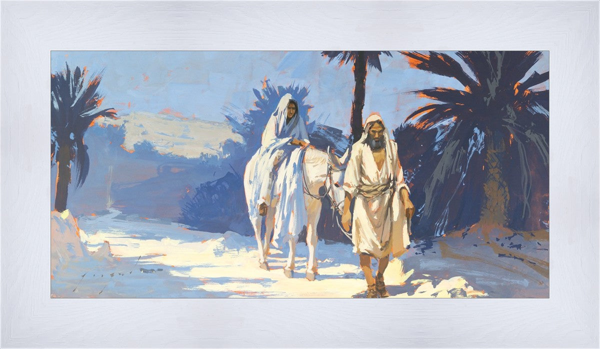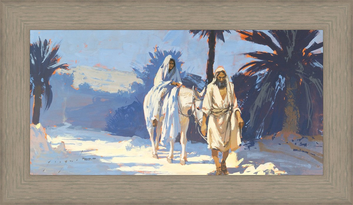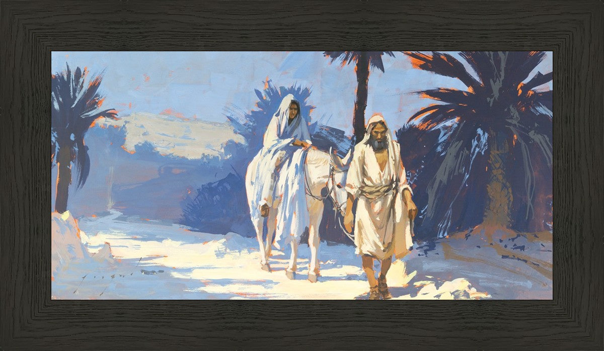 This is a depiction of Mary and Joseph as they are traveling to Bethlehem. Mary, having been pregnant for nearly nine months, is full term and is expecting her long awaited baby boy anytime. The arduous travel they have undergone is also coming to an end.