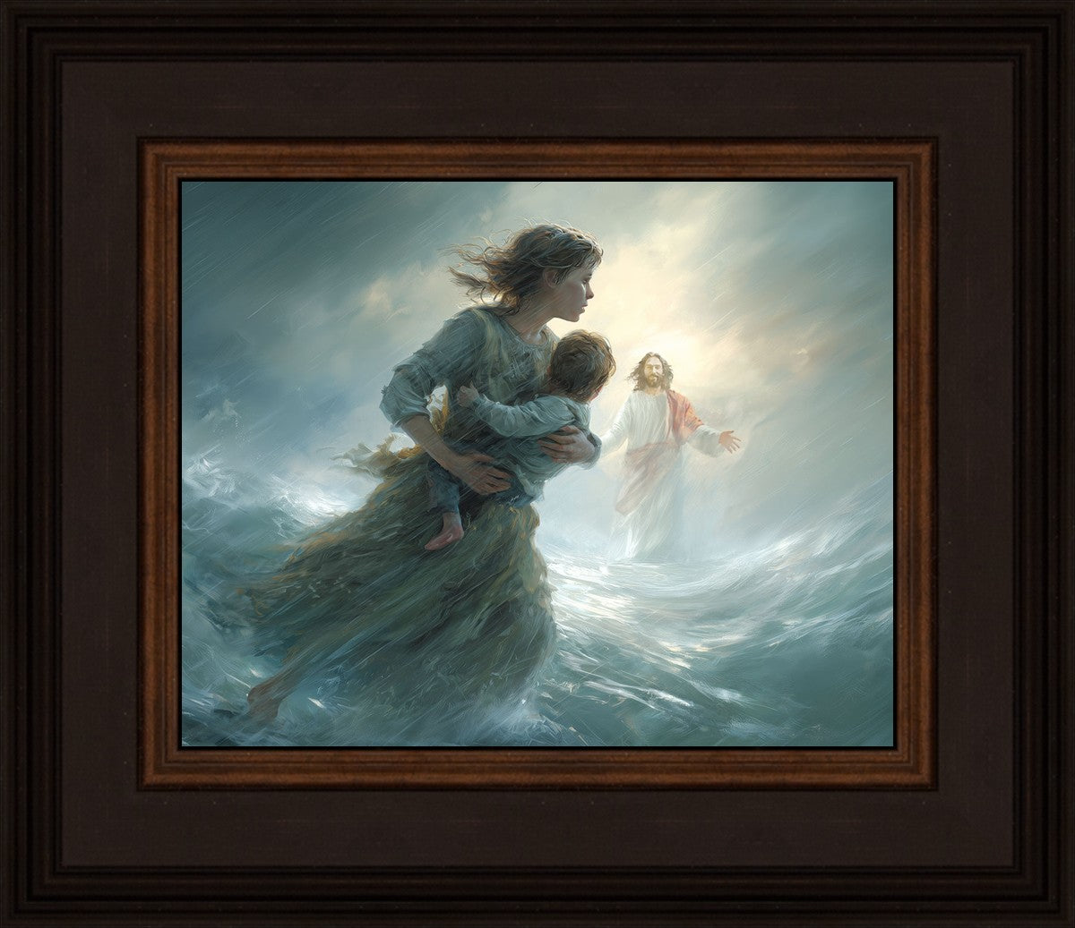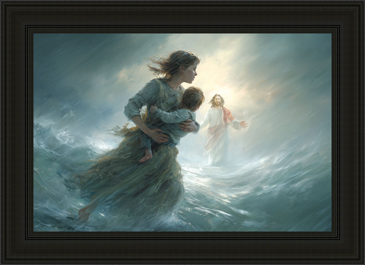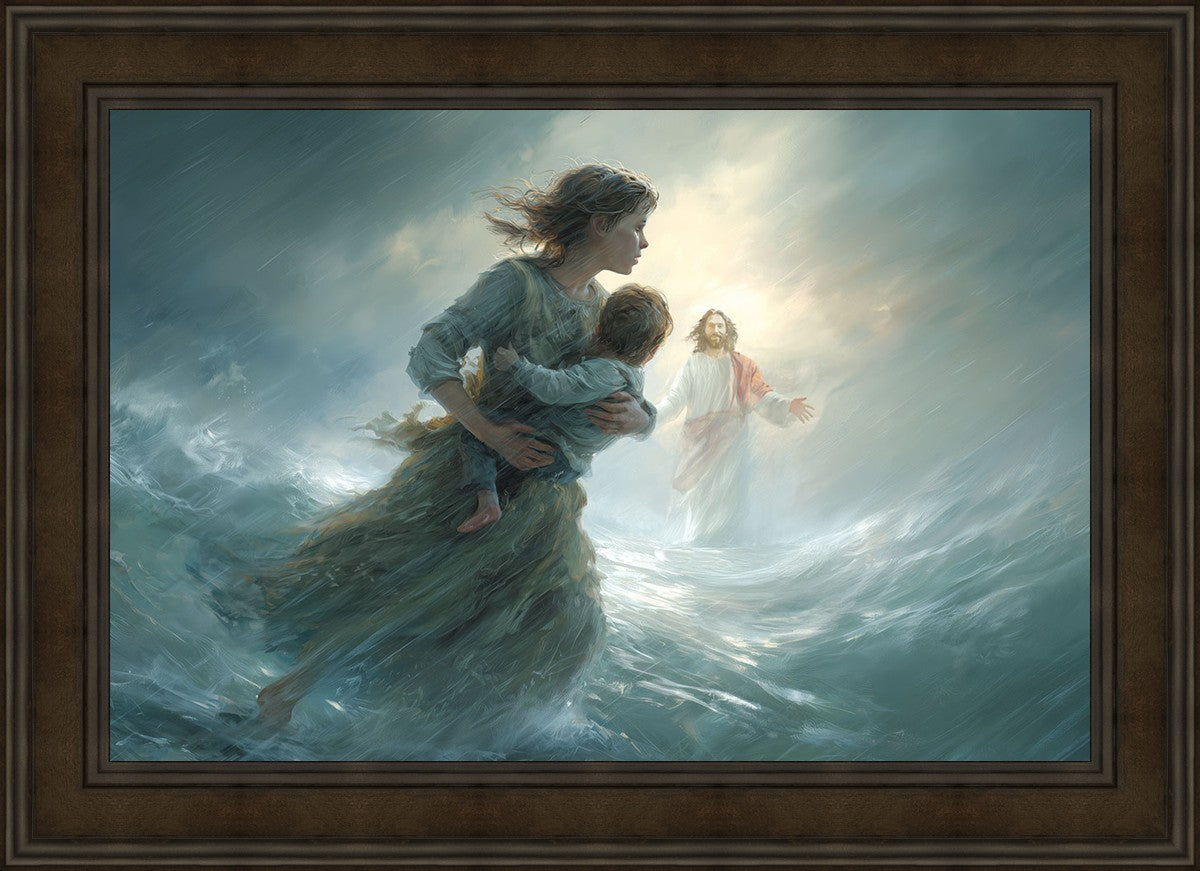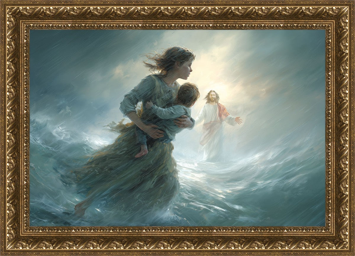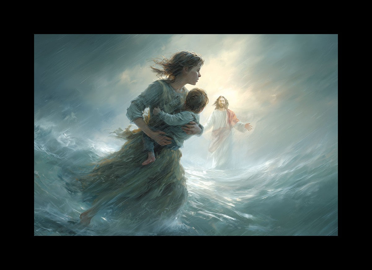 A mother carries her child through an impossible storm, while the Lord supports and calls to her.