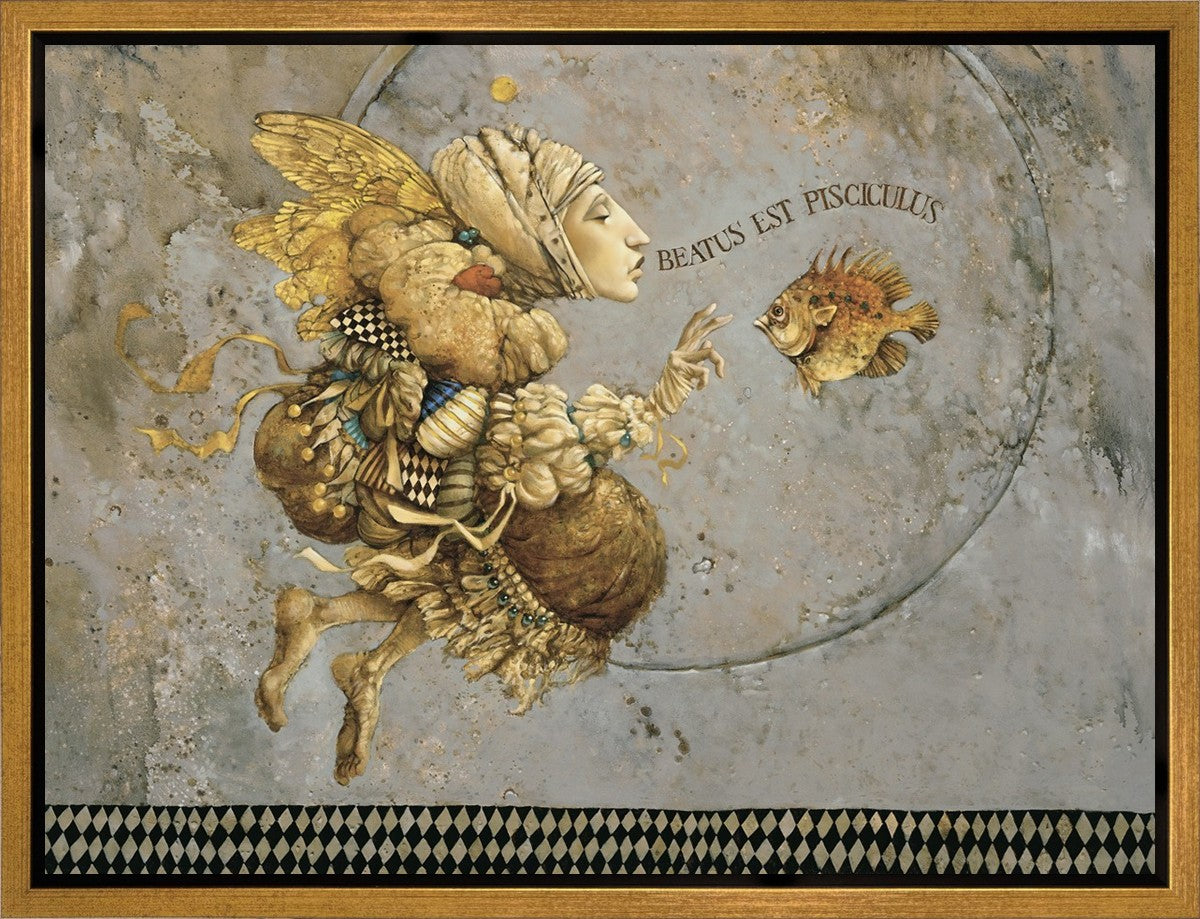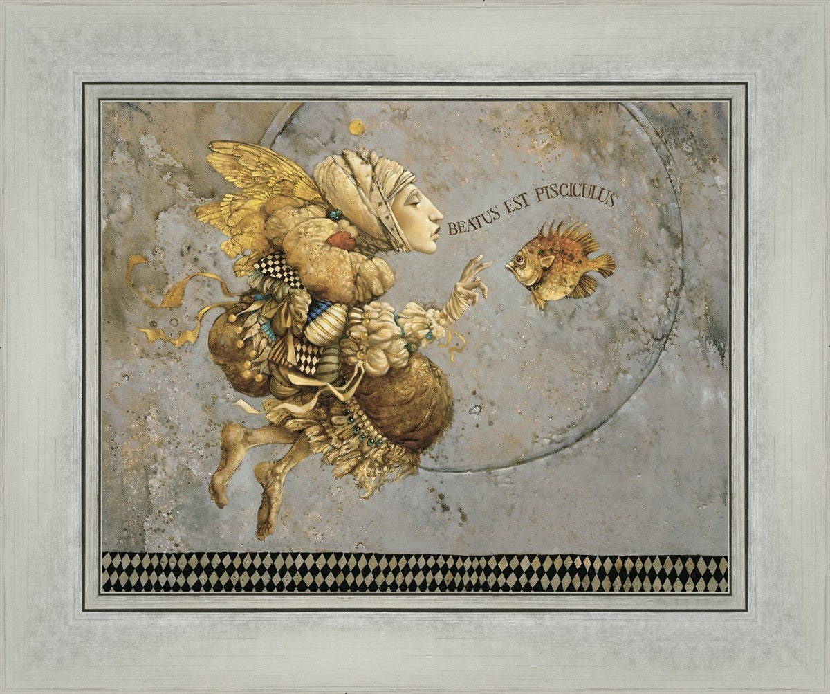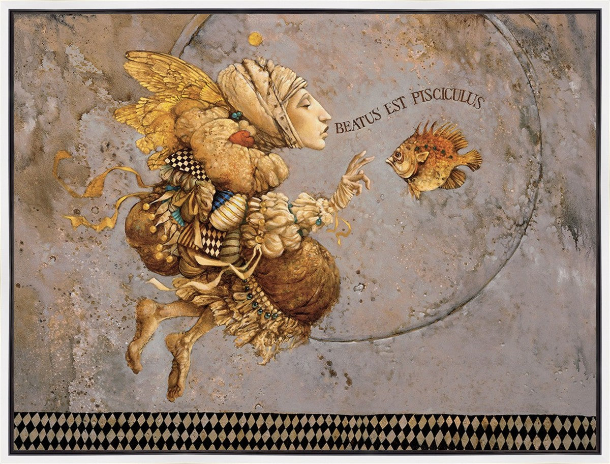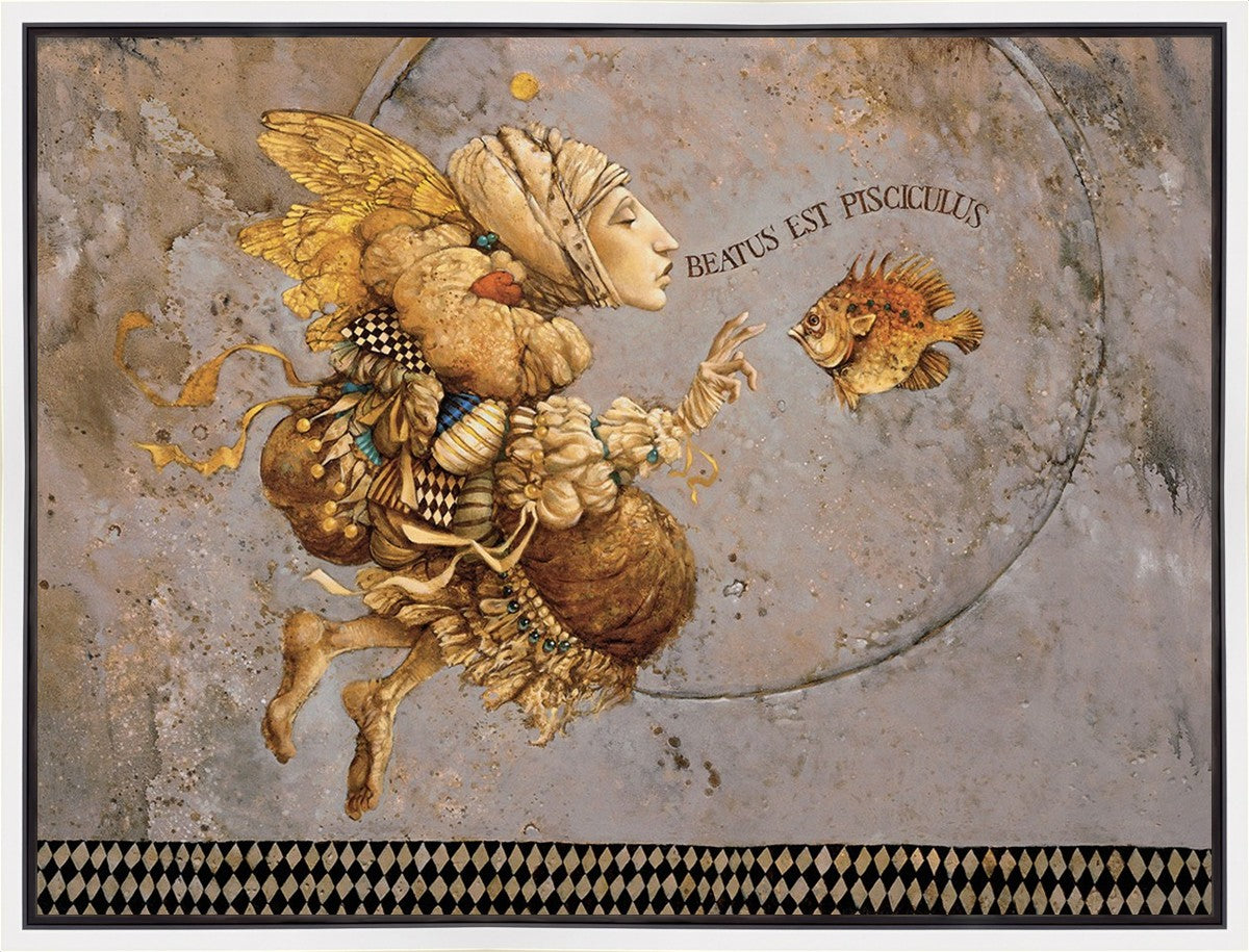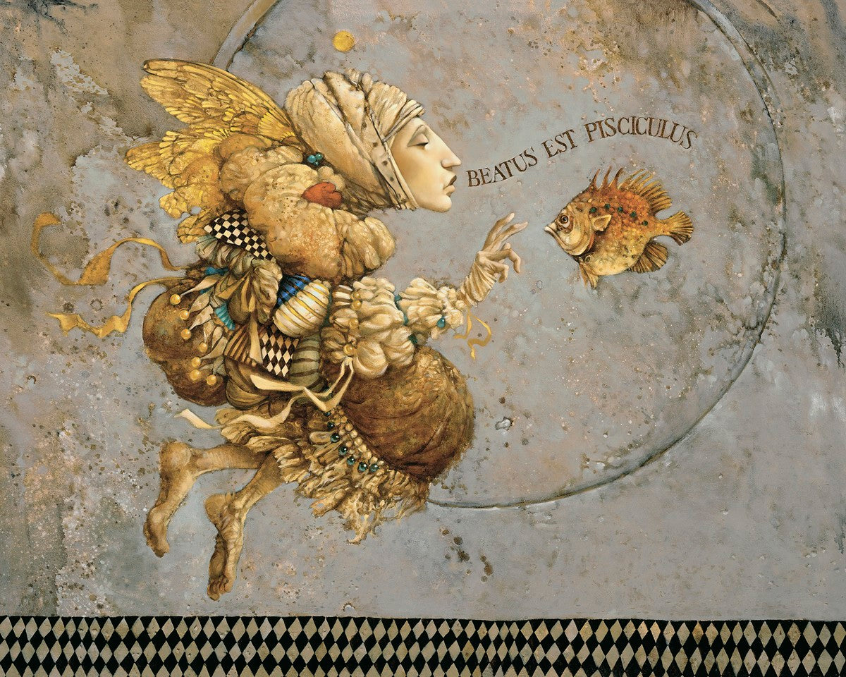 "The words coming out of this angel’s mouth are purposely provocative and designed to make you wonder 'What does that mean?' They are in Latin, "beatus est pisciculus," meaning 'Blessed is the little fish.' Floating fish symbolize the magic all around us and and in Jim's world they are blessed little things unto themselves, bringing this magic into our lives. Is the angel blessing the fish or the fish blessing the angel? The fish is a symbol I frequently use and this painting was meant as my 'thank-you' for a lot of the magic in my life."