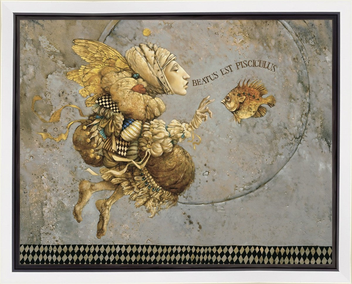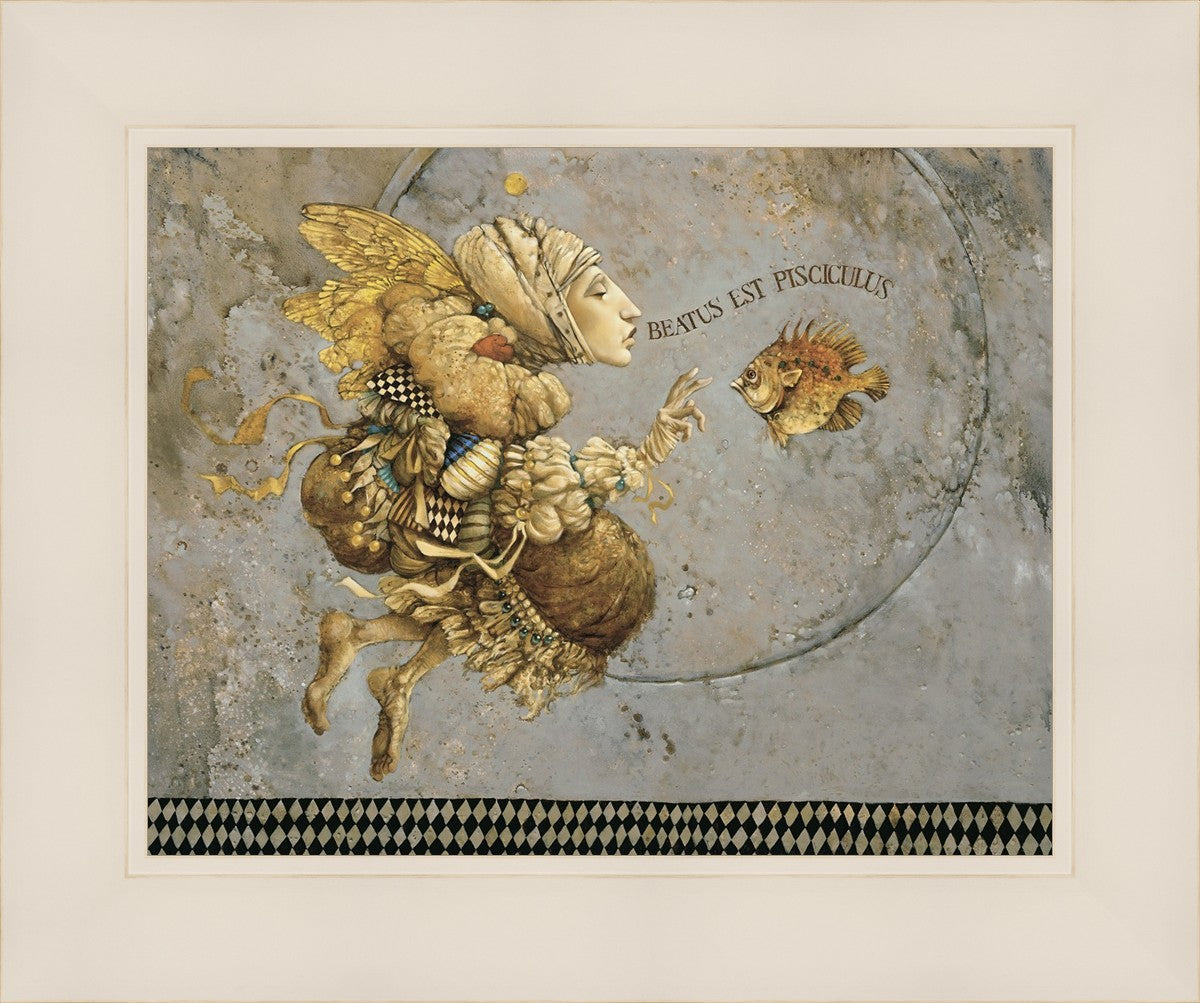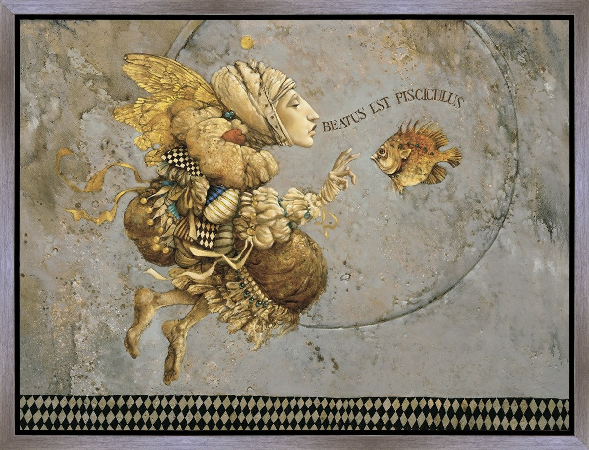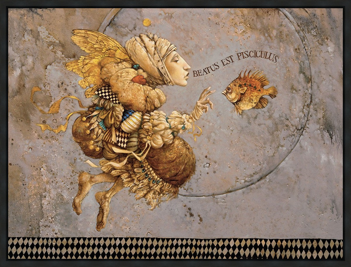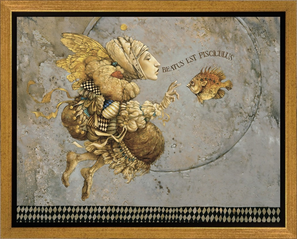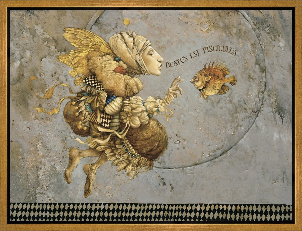 "The words coming out of this angel’s mouth are purposely provocative and designed to make you wonder 'What does that mean?' They are in Latin, "beatus est pisciculus," meaning 'Blessed is the little fish.' Floating fish symbolize the magic all around us and and in Jim's world they are blessed little things unto themselves, bringing this magic into our lives. Is the angel blessing the fish or the fish blessing the angel? The fish is a symbol I frequently use and this painting was meant as my 'thank-you' for a lot of the magic in my life."