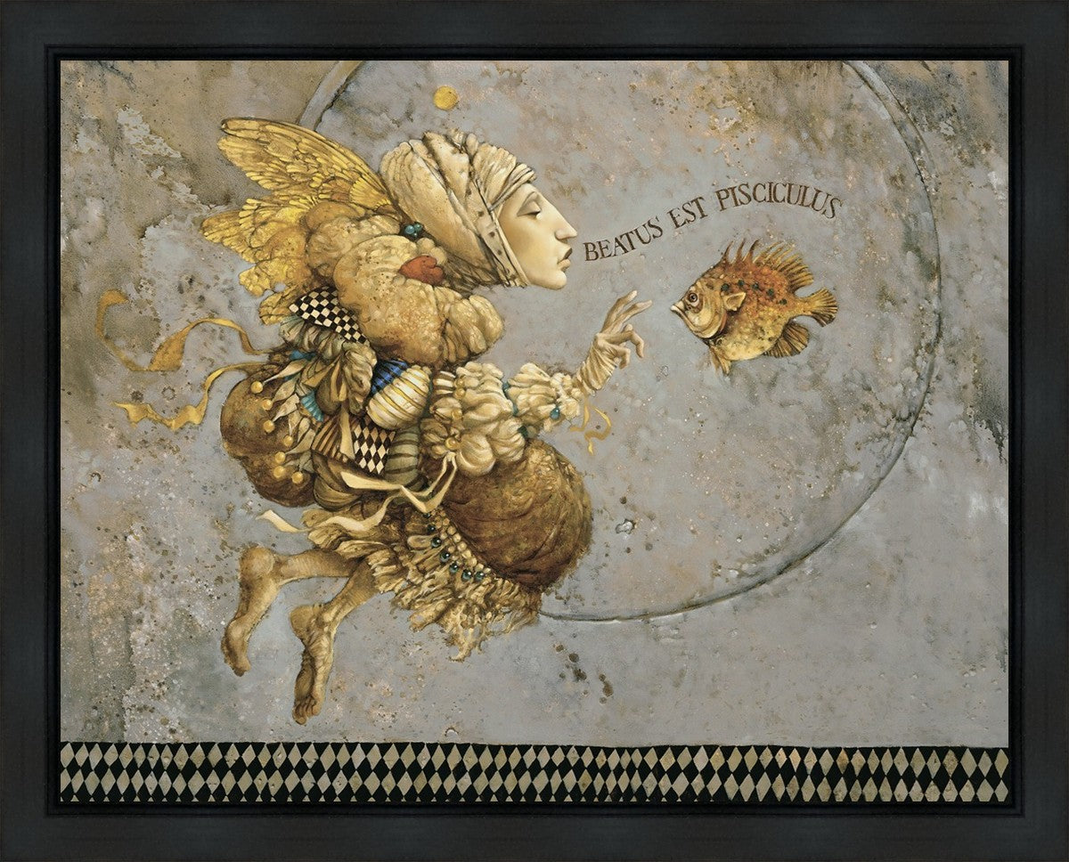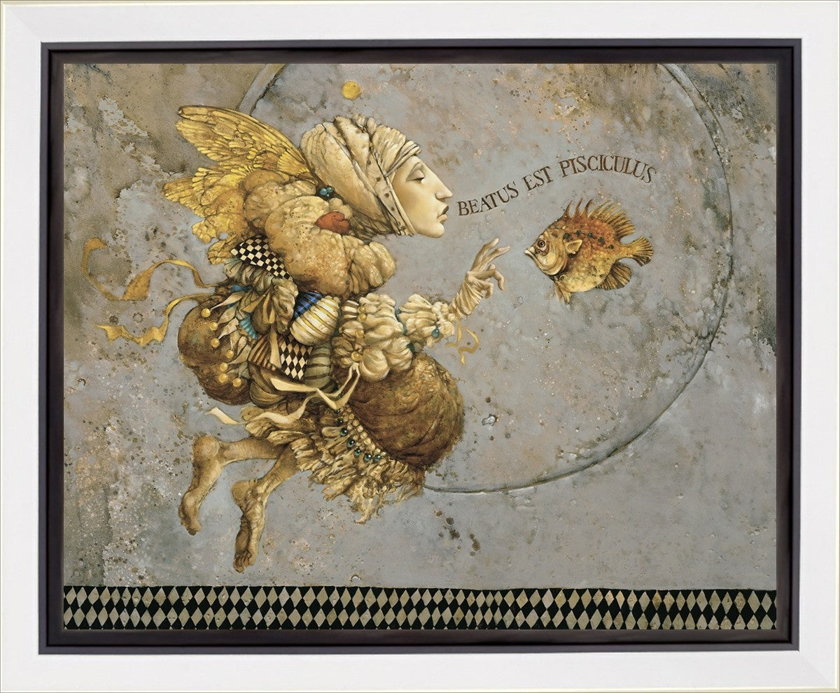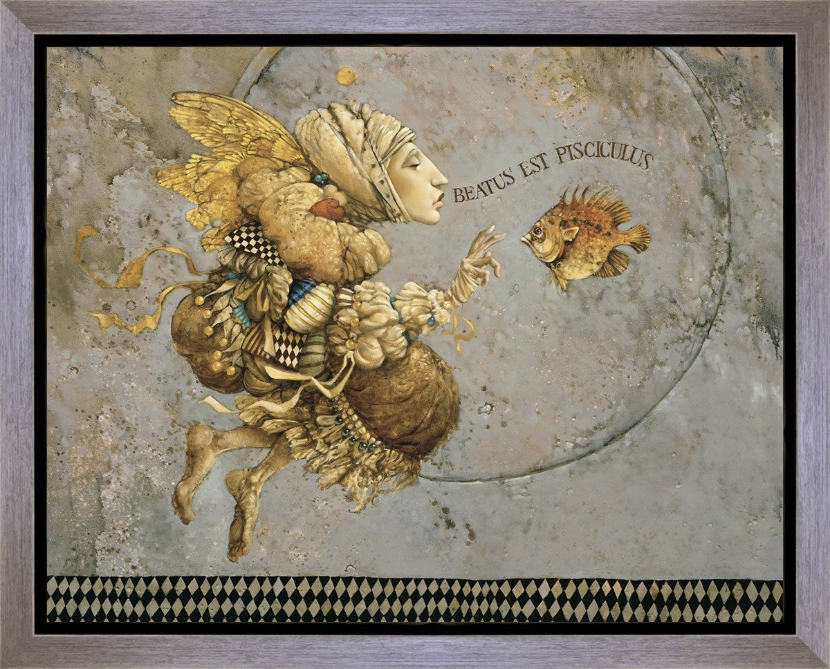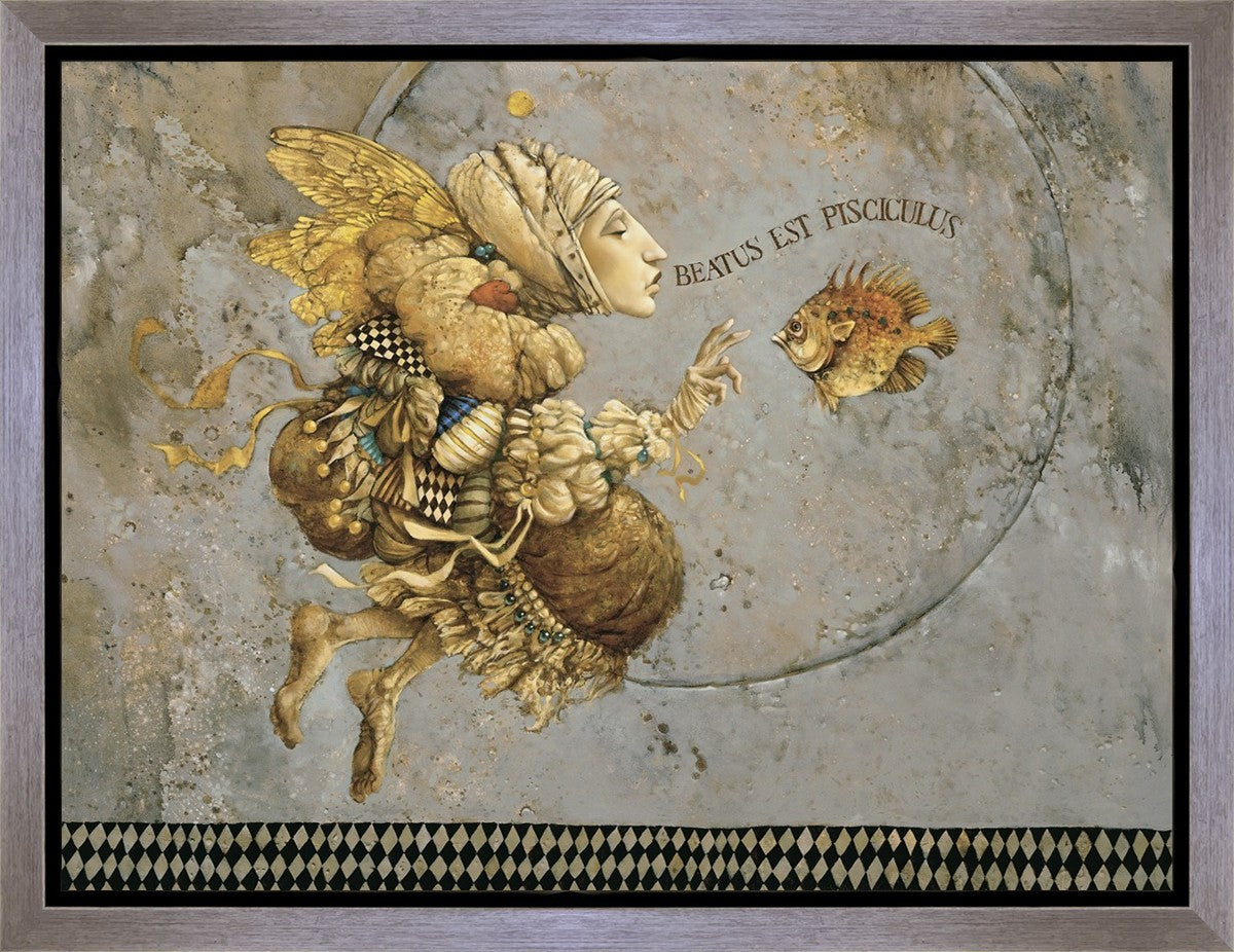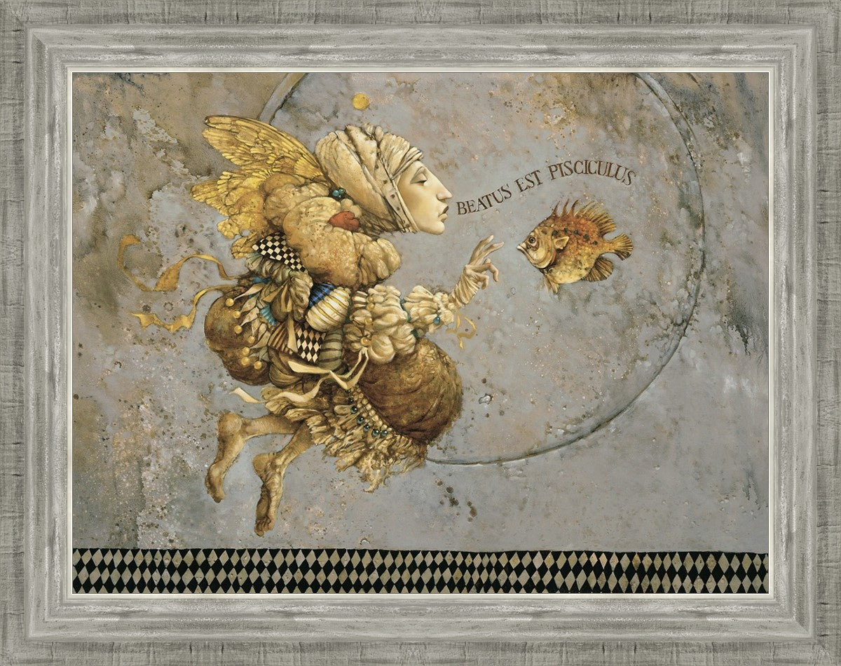 "The words coming out of this angel’s mouth are purposely provocative and designed to make you wonder 'What does that mean?' They are in Latin, "beatus est pisciculus," meaning 'Blessed is the little fish.' Floating fish symbolize the magic all around us and and in Jim's world they are blessed little things unto themselves, bringing this magic into our lives. Is the angel blessing the fish or the fish blessing the angel? The fish is a symbol I frequently use and this painting was meant as my 'thank-you' for a lot of the magic in my life."