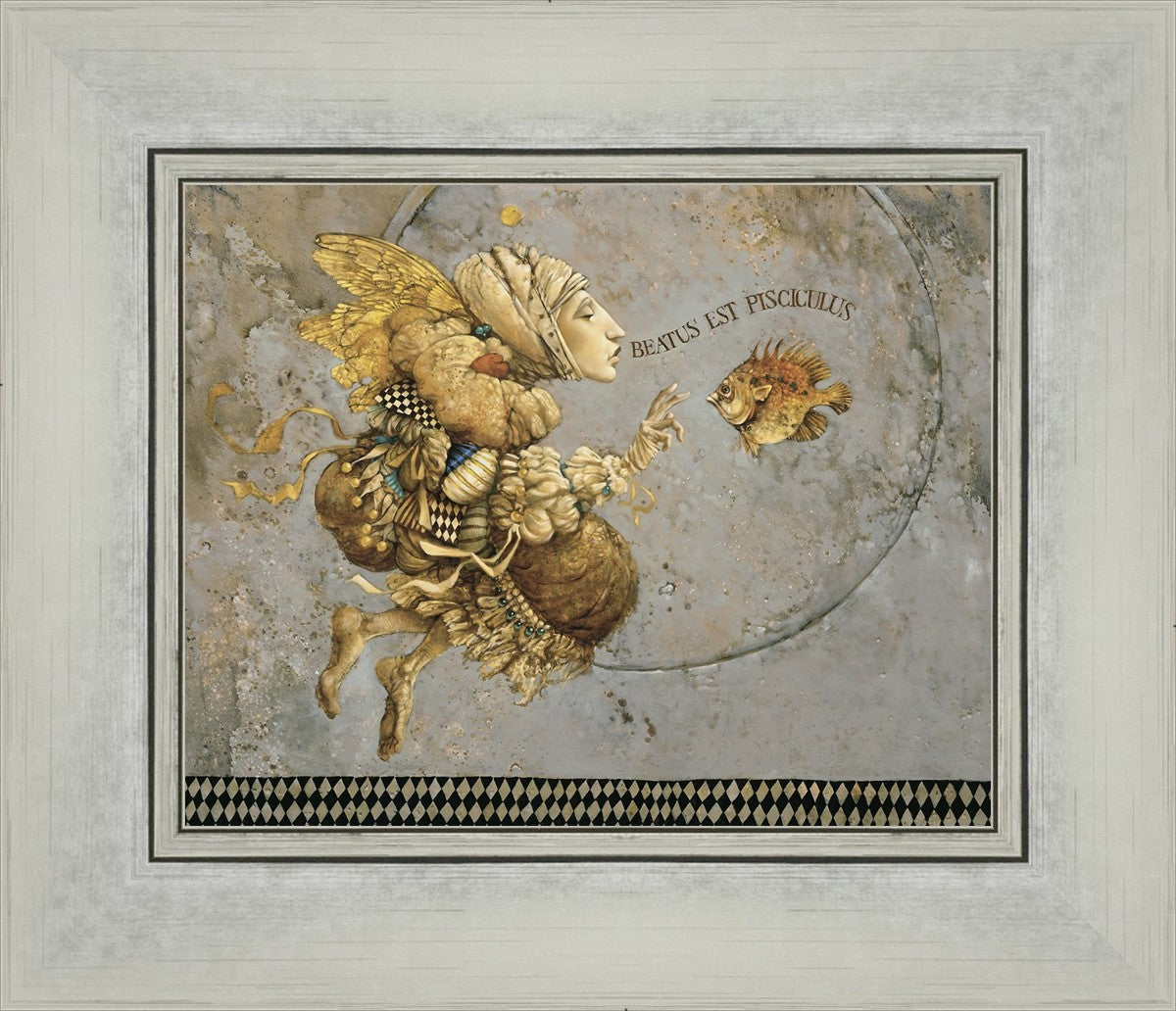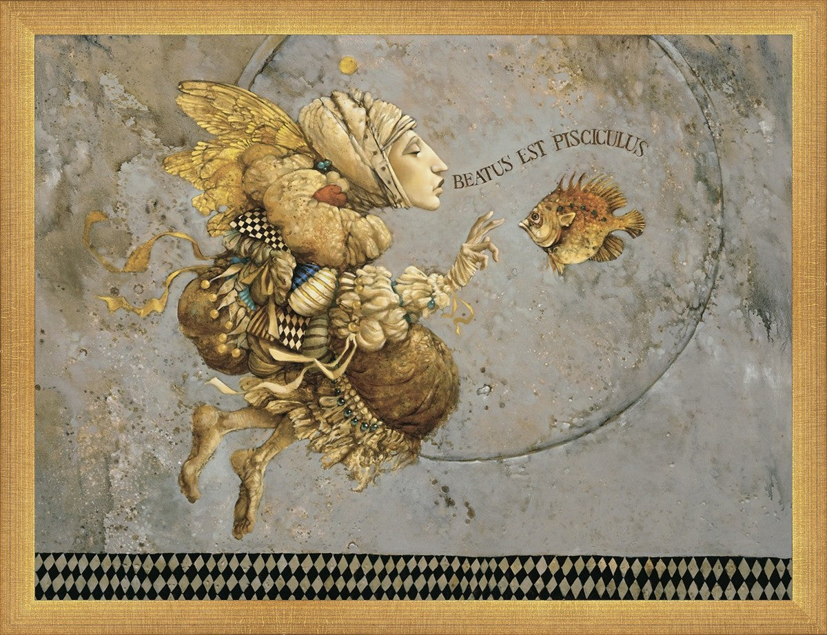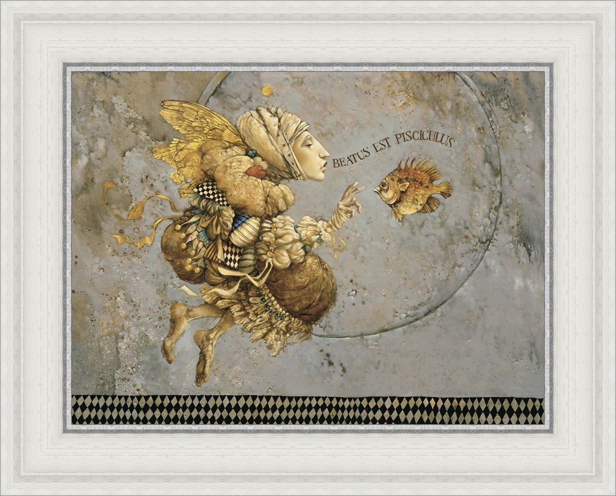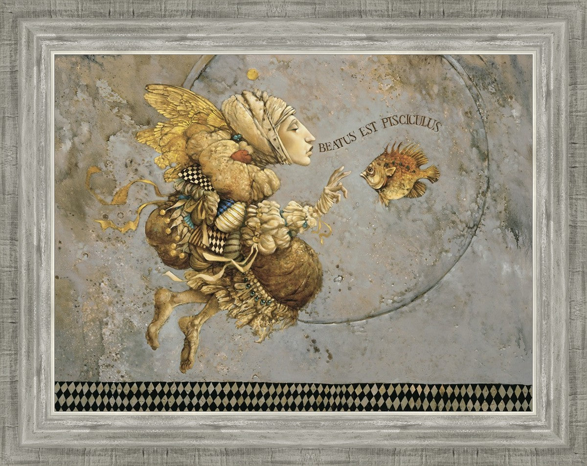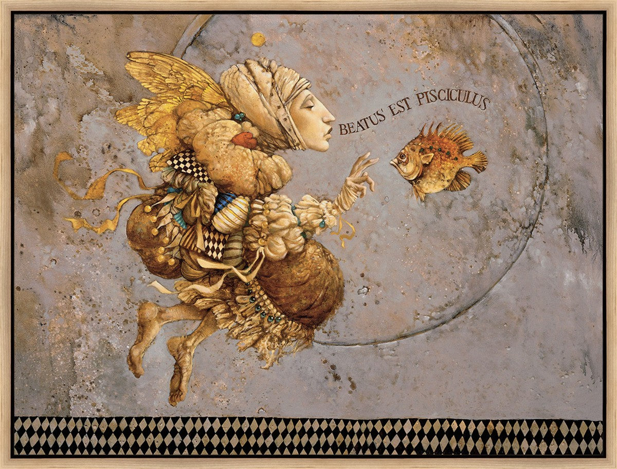 "The words coming out of this angel’s mouth are purposely provocative and designed to make you wonder 'What does that mean?' They are in Latin, "beatus est pisciculus," meaning 'Blessed is the little fish.' Floating fish symbolize the magic all around us and and in Jim's world they are blessed little things unto themselves, bringing this magic into our lives. Is the angel blessing the fish or the fish blessing the angel? The fish is a symbol I frequently use and this painting was meant as my 'thank-you' for a lot of the magic in my life."