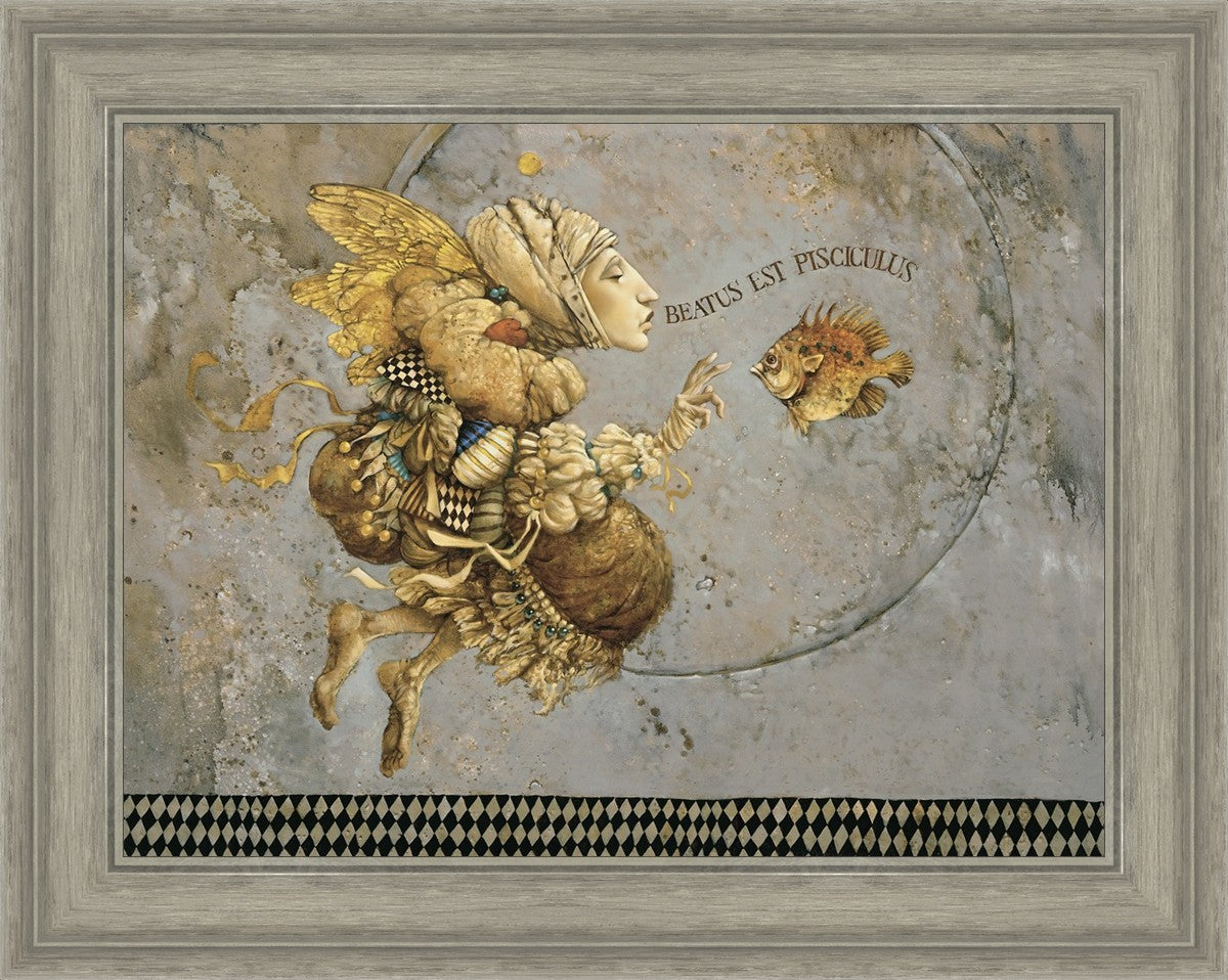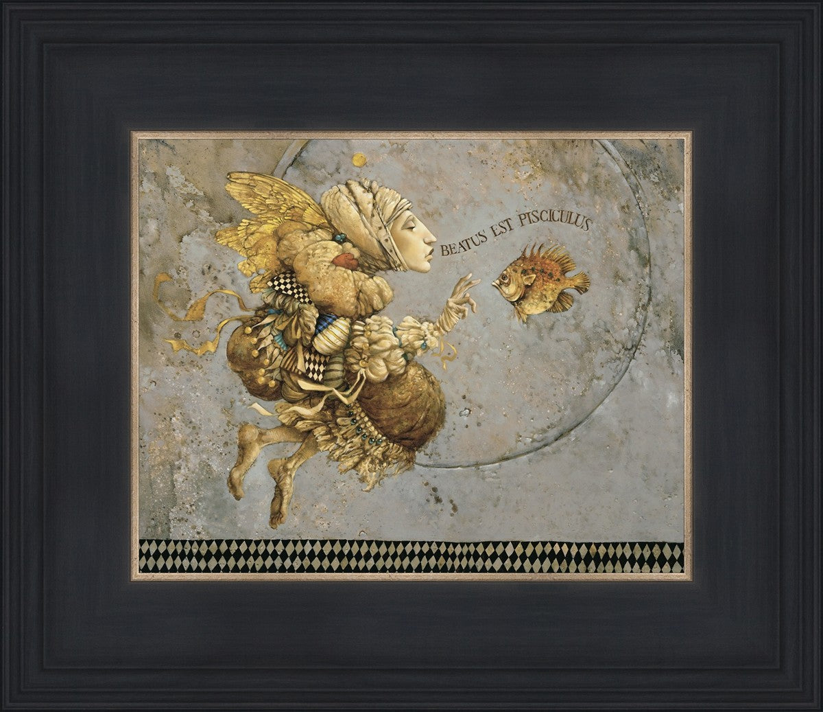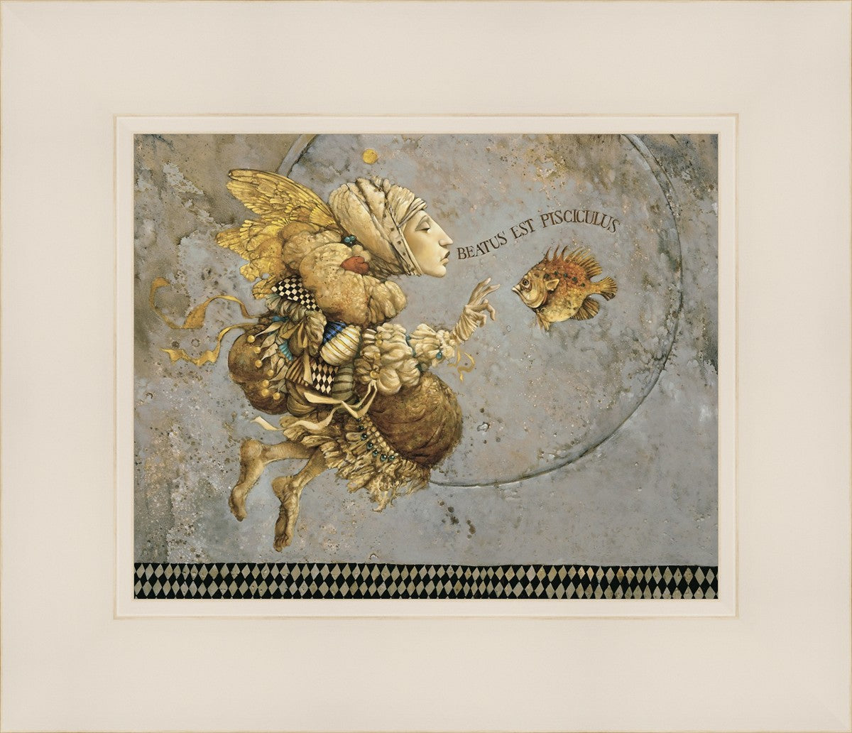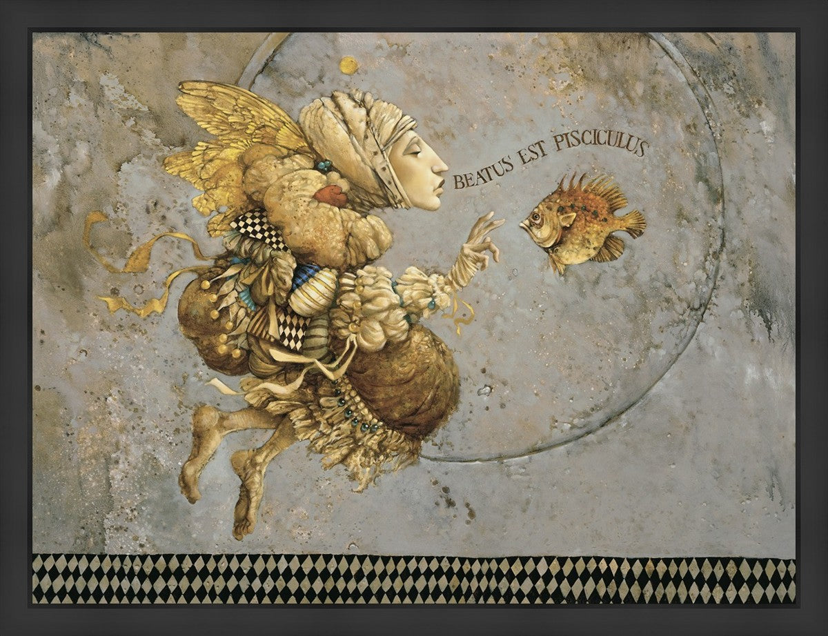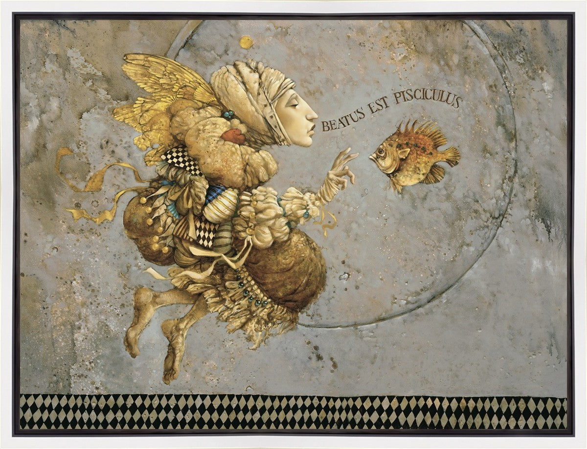 "The words coming out of this angel’s mouth are purposely provocative and designed to make you wonder 'What does that mean?' They are in Latin, "beatus est pisciculus," meaning 'Blessed is the little fish.' Floating fish symbolize the magic all around us and and in Jim's world they are blessed little things unto themselves, bringing this magic into our lives. Is the angel blessing the fish or the fish blessing the angel? The fish is a symbol I frequently use and this painting was meant as my 'thank-you' for a lot of the magic in my life."