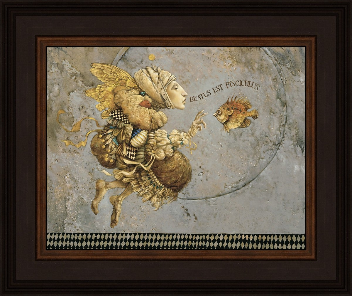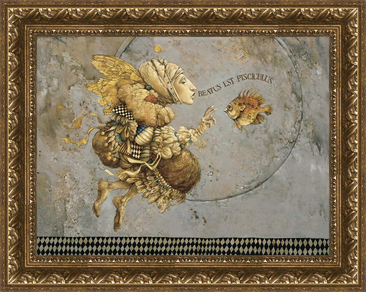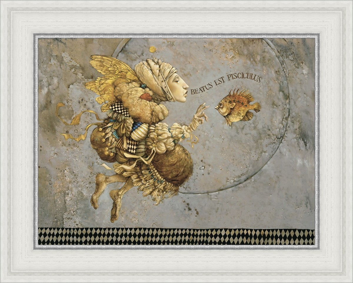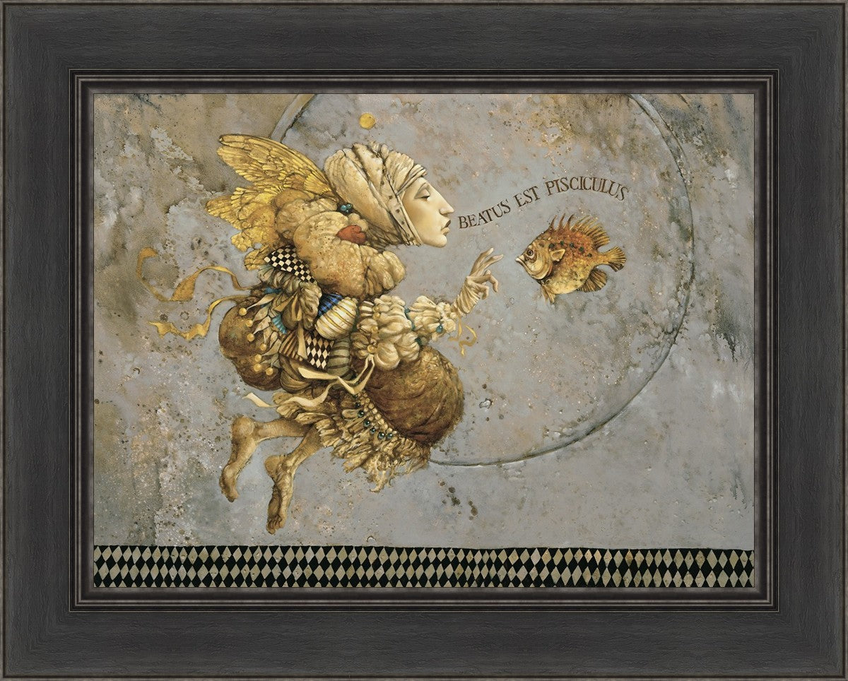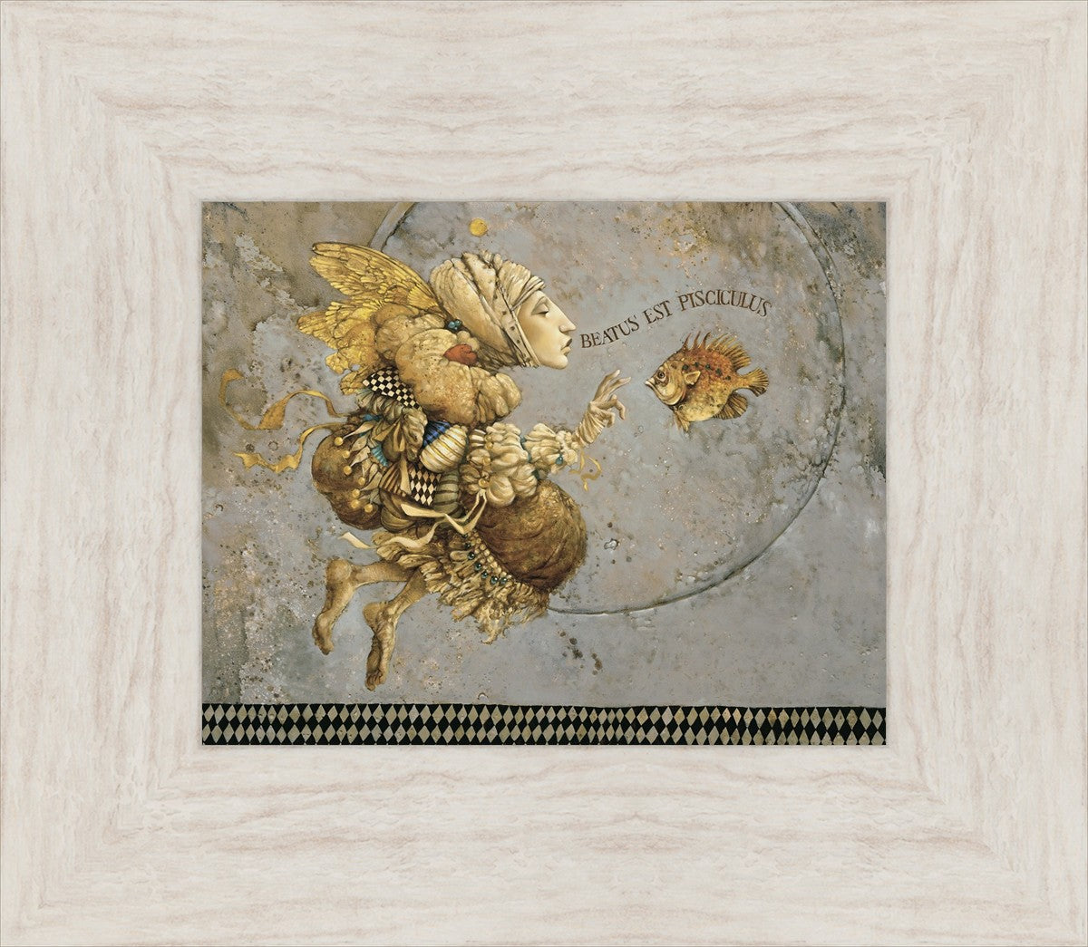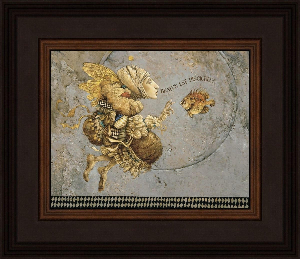 "The words coming out of this angel’s mouth are purposely provocative and designed to make you wonder 'What does that mean?' They are in Latin, "beatus est pisciculus," meaning 'Blessed is the little fish.' Floating fish symbolize the magic all around us and and in Jim's world they are blessed little things unto themselves, bringing this magic into our lives. Is the angel blessing the fish or the fish blessing the angel? The fish is a symbol I frequently use and this painting was meant as my 'thank-you' for a lot of the magic in my life."
