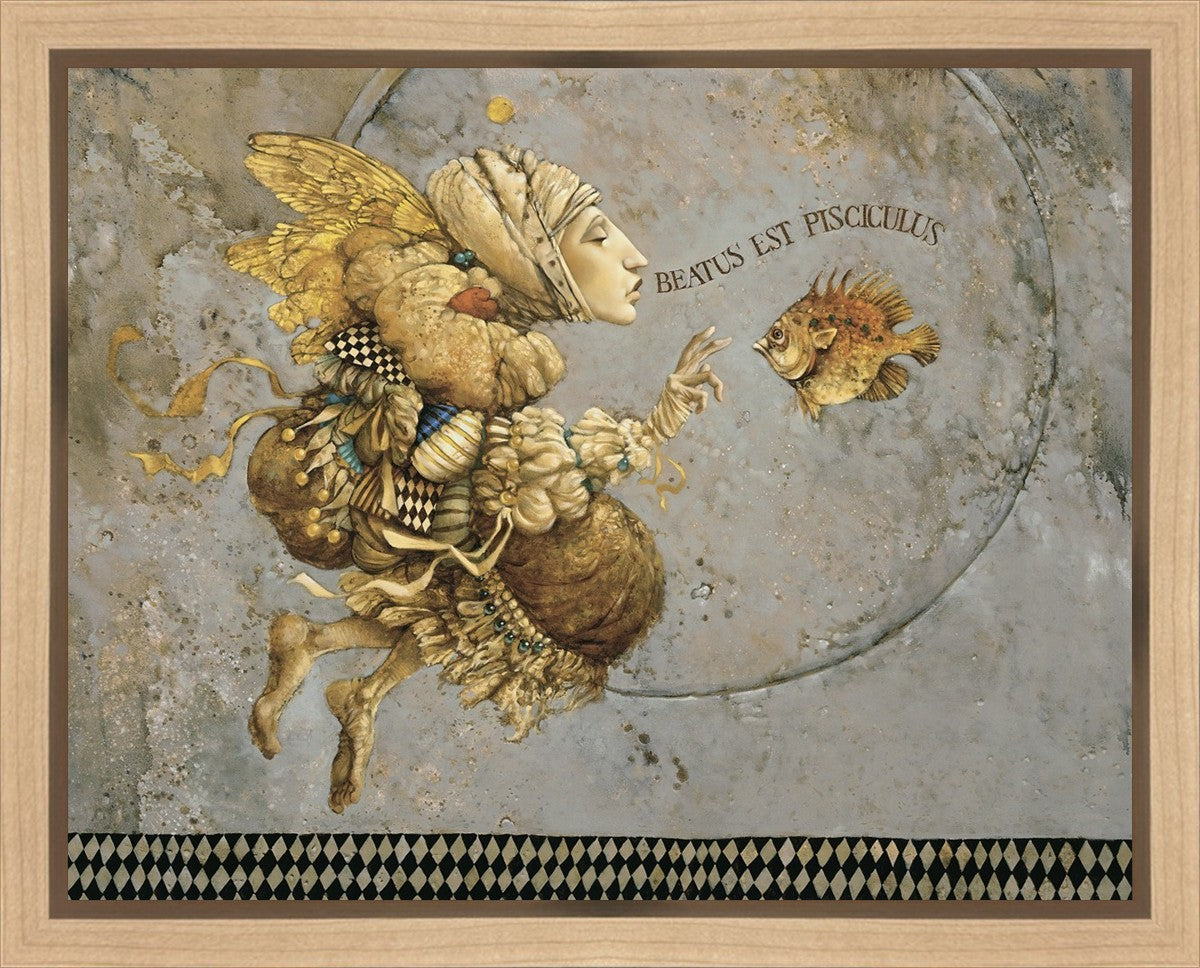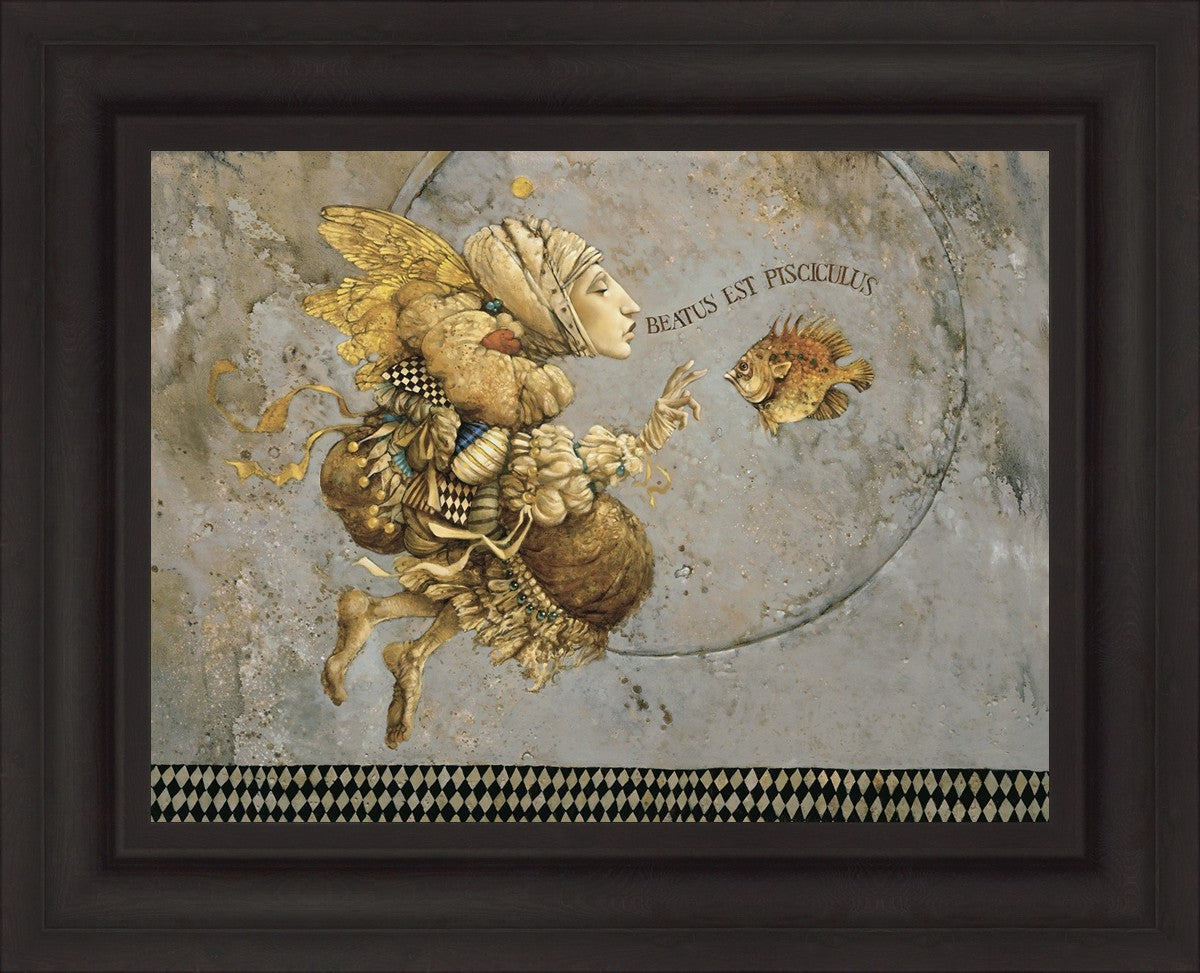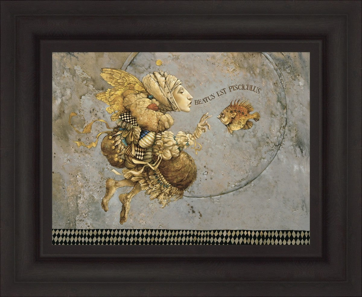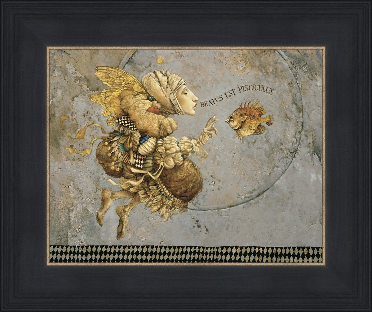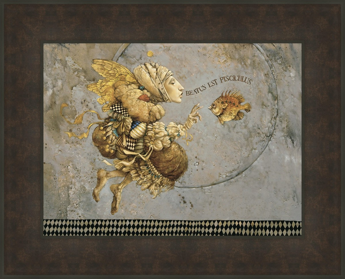 "The words coming out of this angel’s mouth are purposely provocative and designed to make you wonder 'What does that mean?' They are in Latin, "beatus est pisciculus," meaning 'Blessed is the little fish.' Floating fish symbolize the magic all around us and and in Jim's world they are blessed little things unto themselves, bringing this magic into our lives. Is the angel blessing the fish or the fish blessing the angel? The fish is a symbol I frequently use and this painting was meant as my 'thank-you' for a lot of the magic in my life."