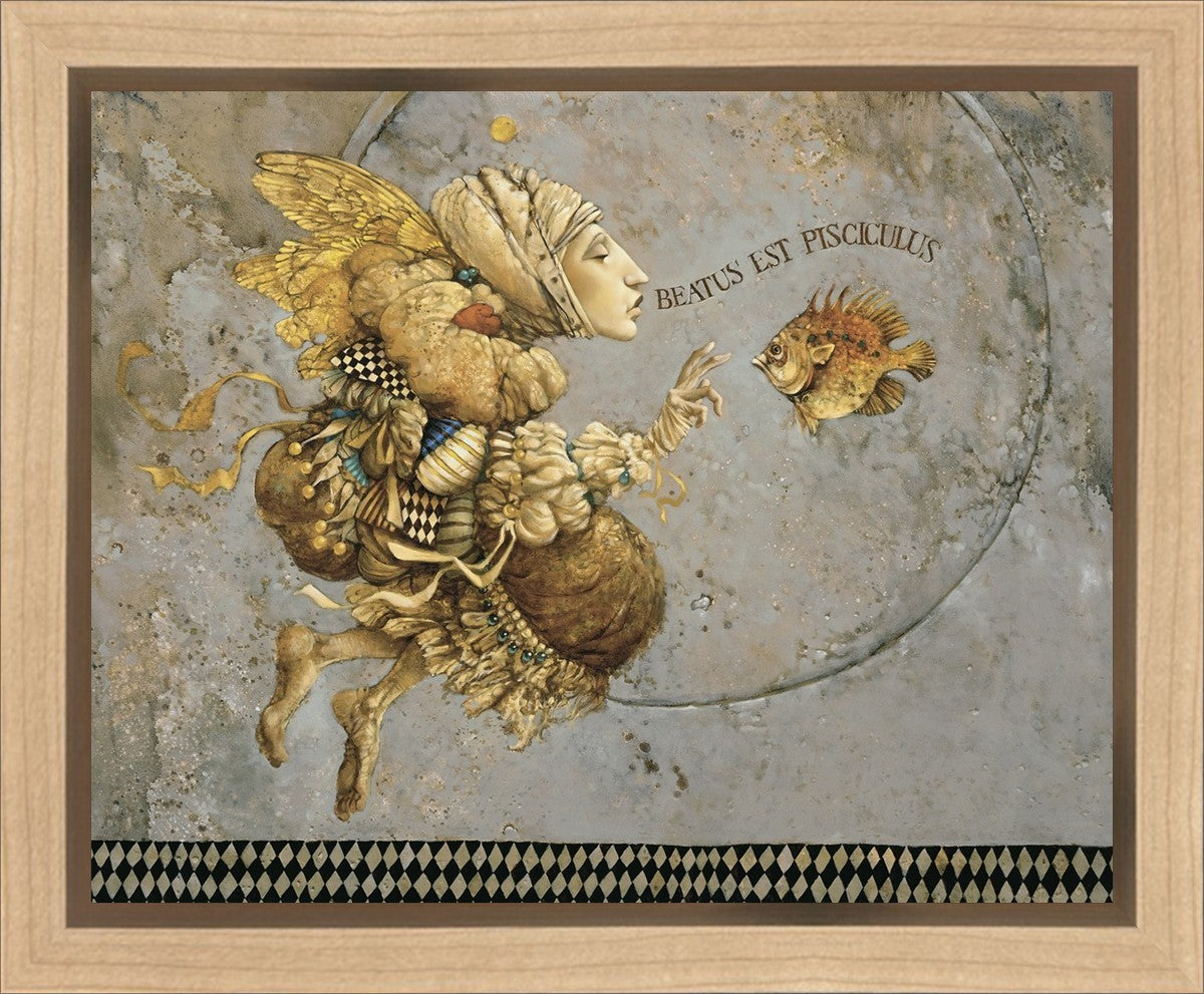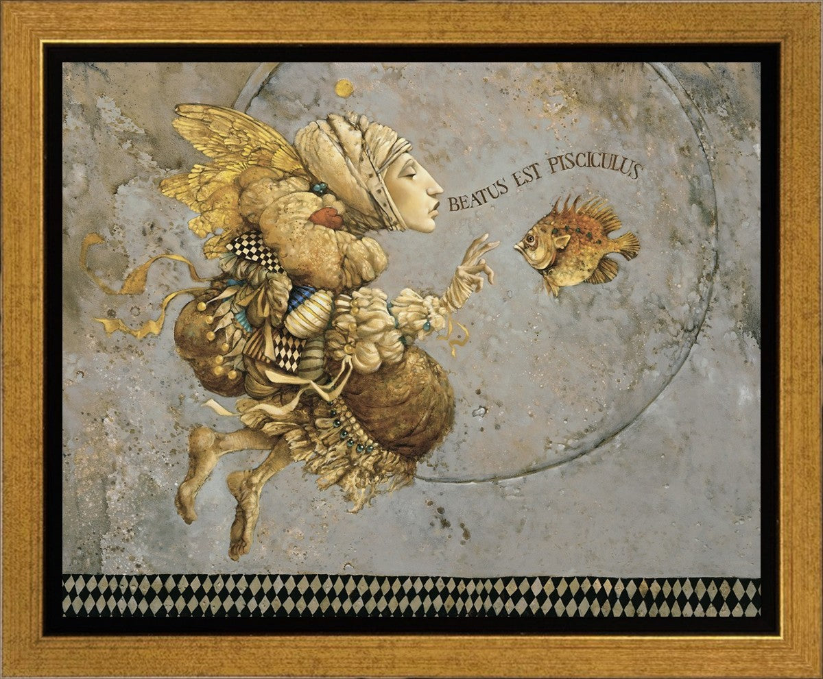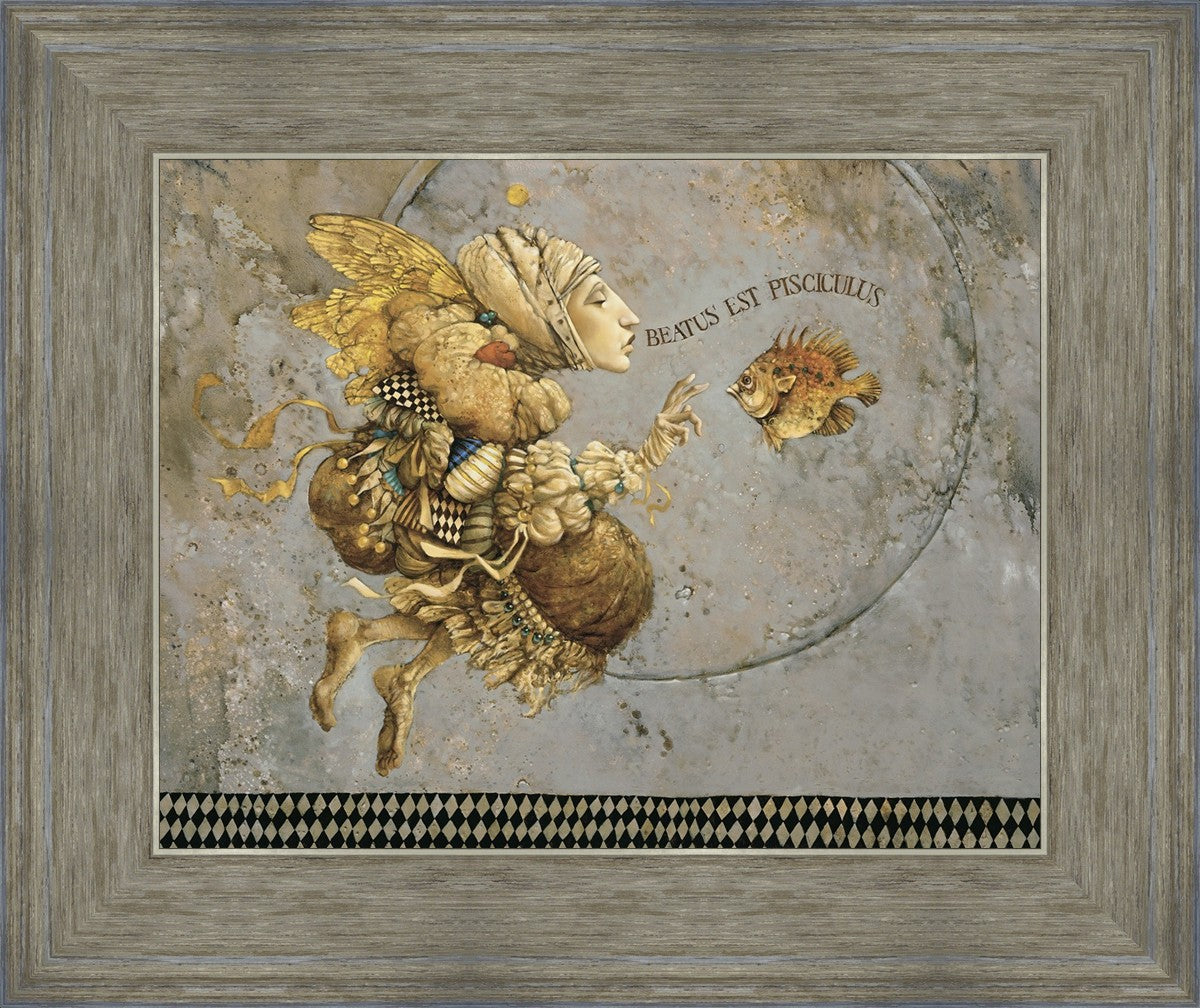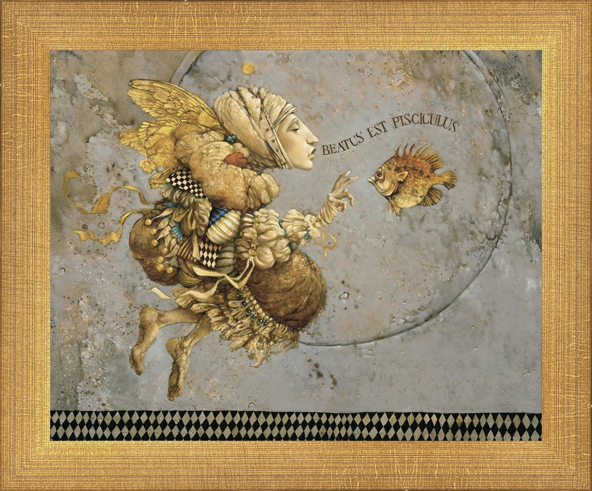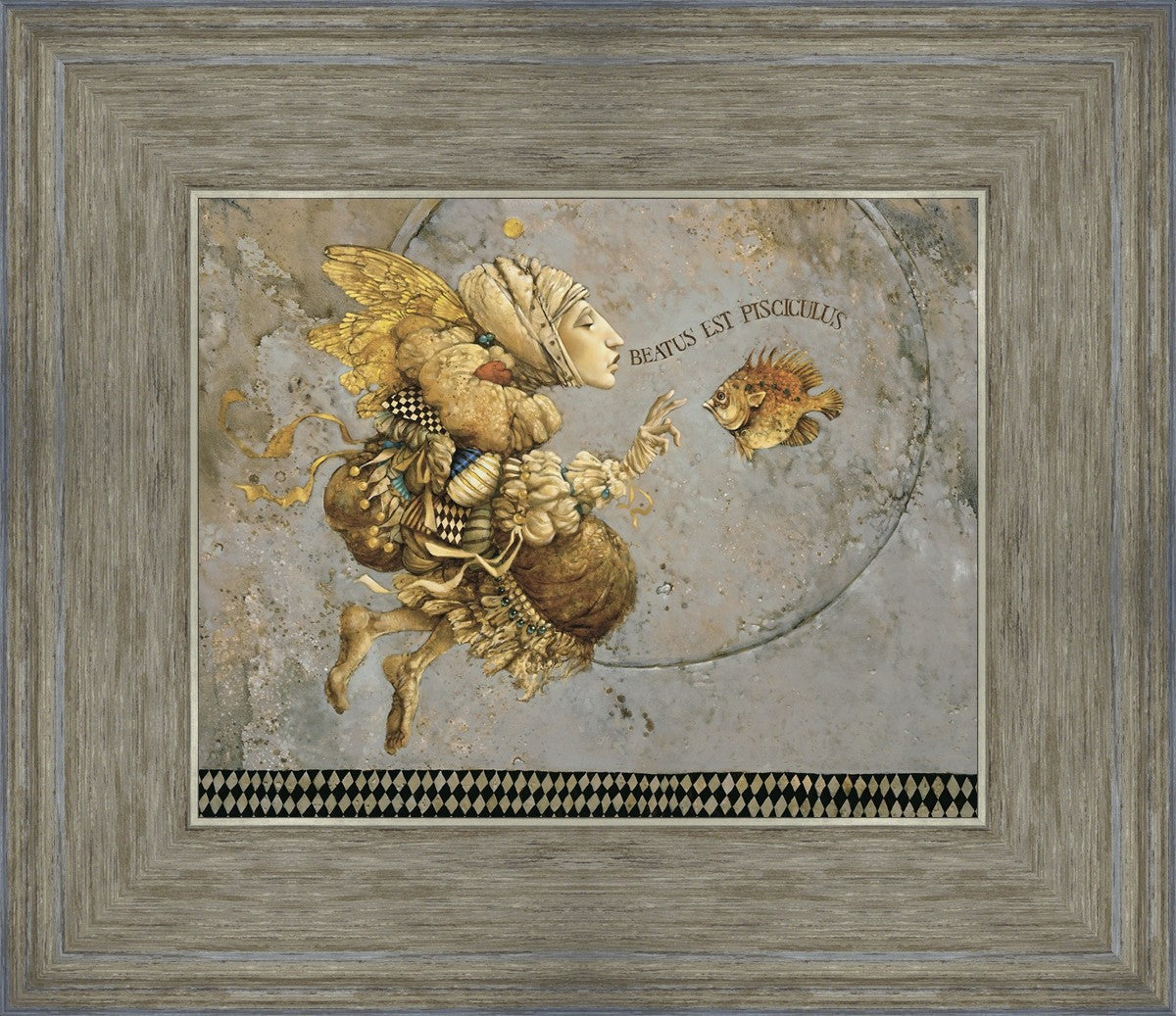 "The words coming out of this angel’s mouth are purposely provocative and designed to make you wonder 'What does that mean?' They are in Latin, "beatus est pisciculus," meaning 'Blessed is the little fish.' Floating fish symbolize the magic all around us and and in Jim's world they are blessed little things unto themselves, bringing this magic into our lives. Is the angel blessing the fish or the fish blessing the angel? The fish is a symbol I frequently use and this painting was meant as my 'thank-you' for a lot of the magic in my life."