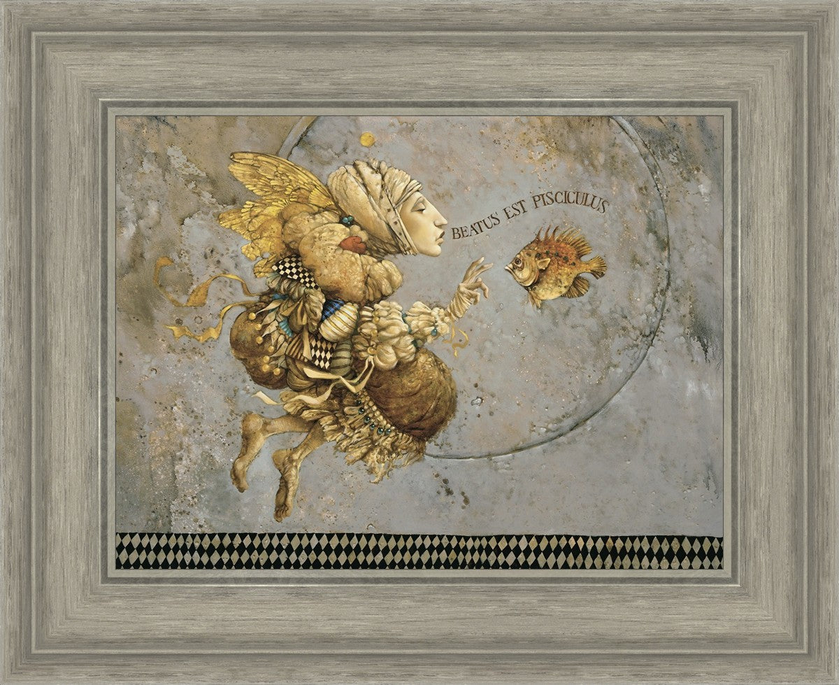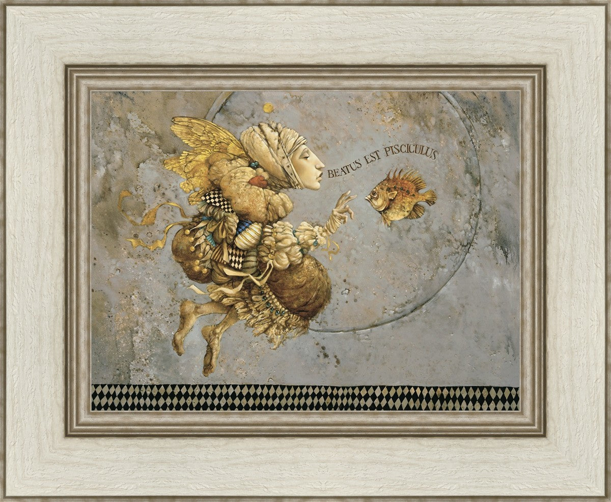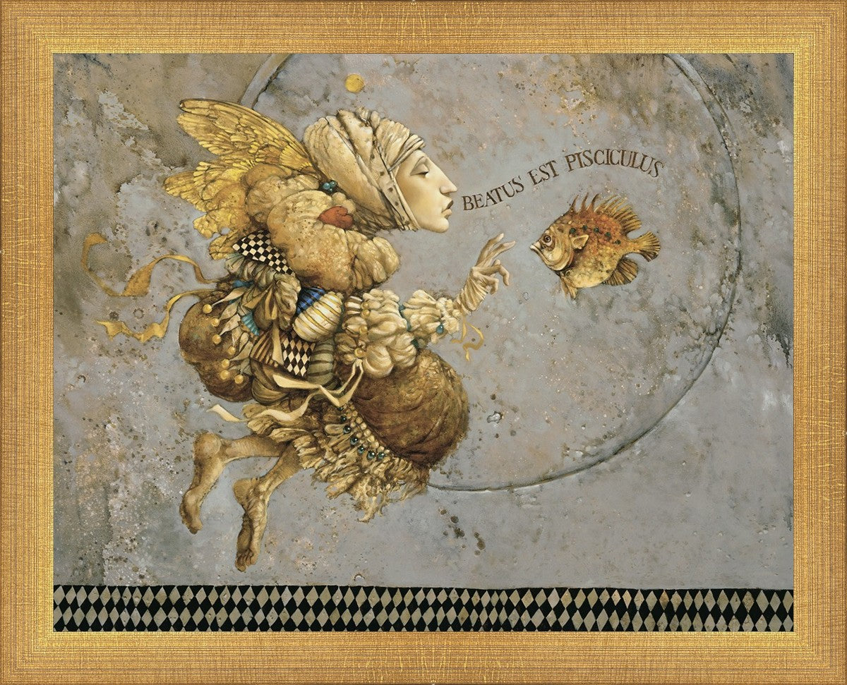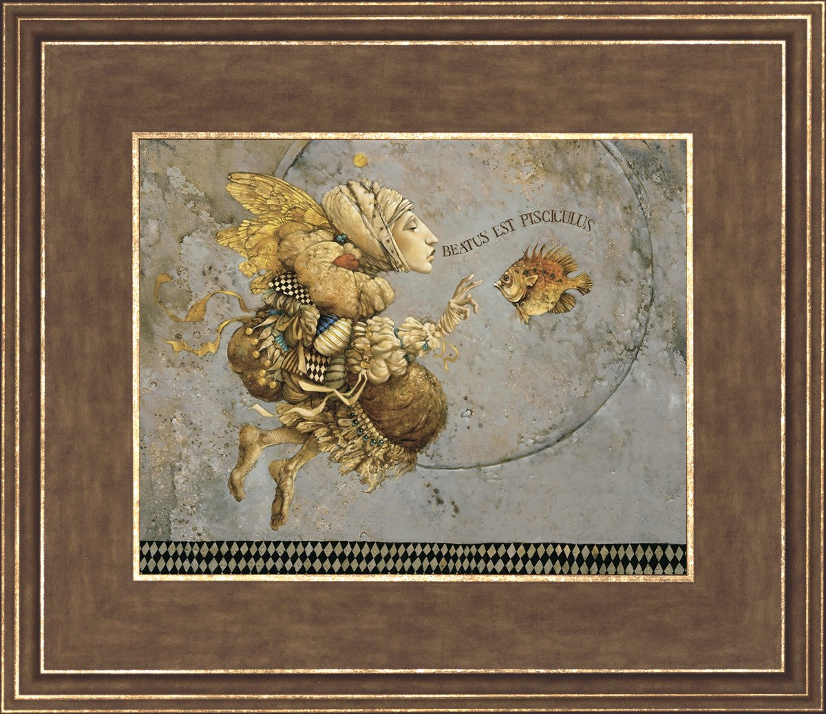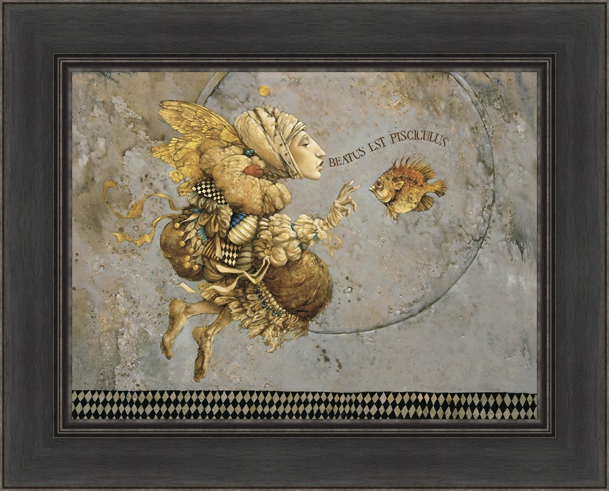 "The words coming out of this angel’s mouth are purposely provocative and designed to make you wonder 'What does that mean?' They are in Latin, "beatus est pisciculus," meaning 'Blessed is the little fish.' Floating fish symbolize the magic all around us and and in Jim's world they are blessed little things unto themselves, bringing this magic into our lives. Is the angel blessing the fish or the fish blessing the angel? The fish is a symbol I frequently use and this painting was meant as my 'thank-you' for a lot of the magic in my life."