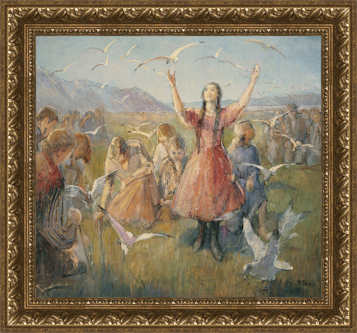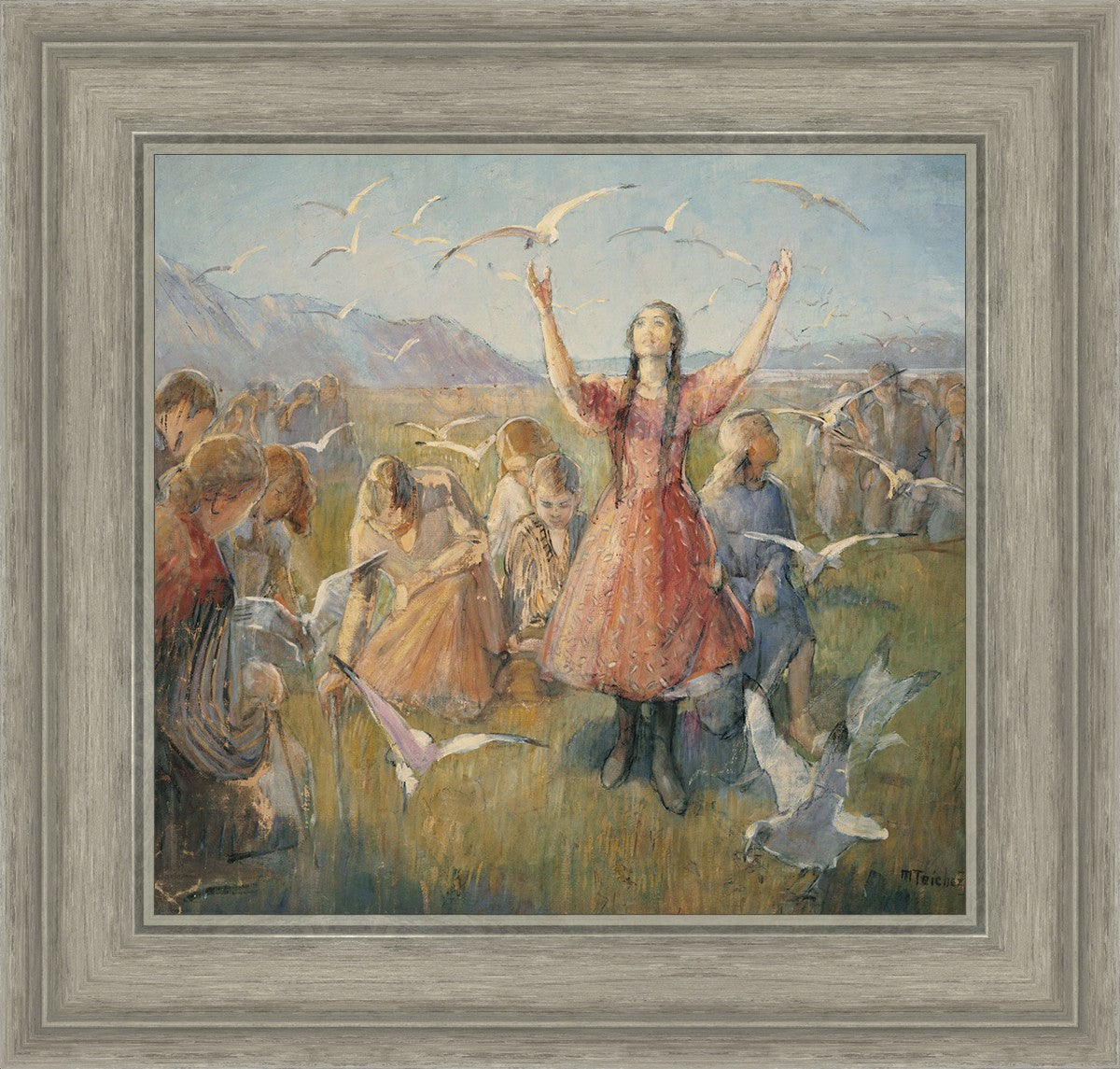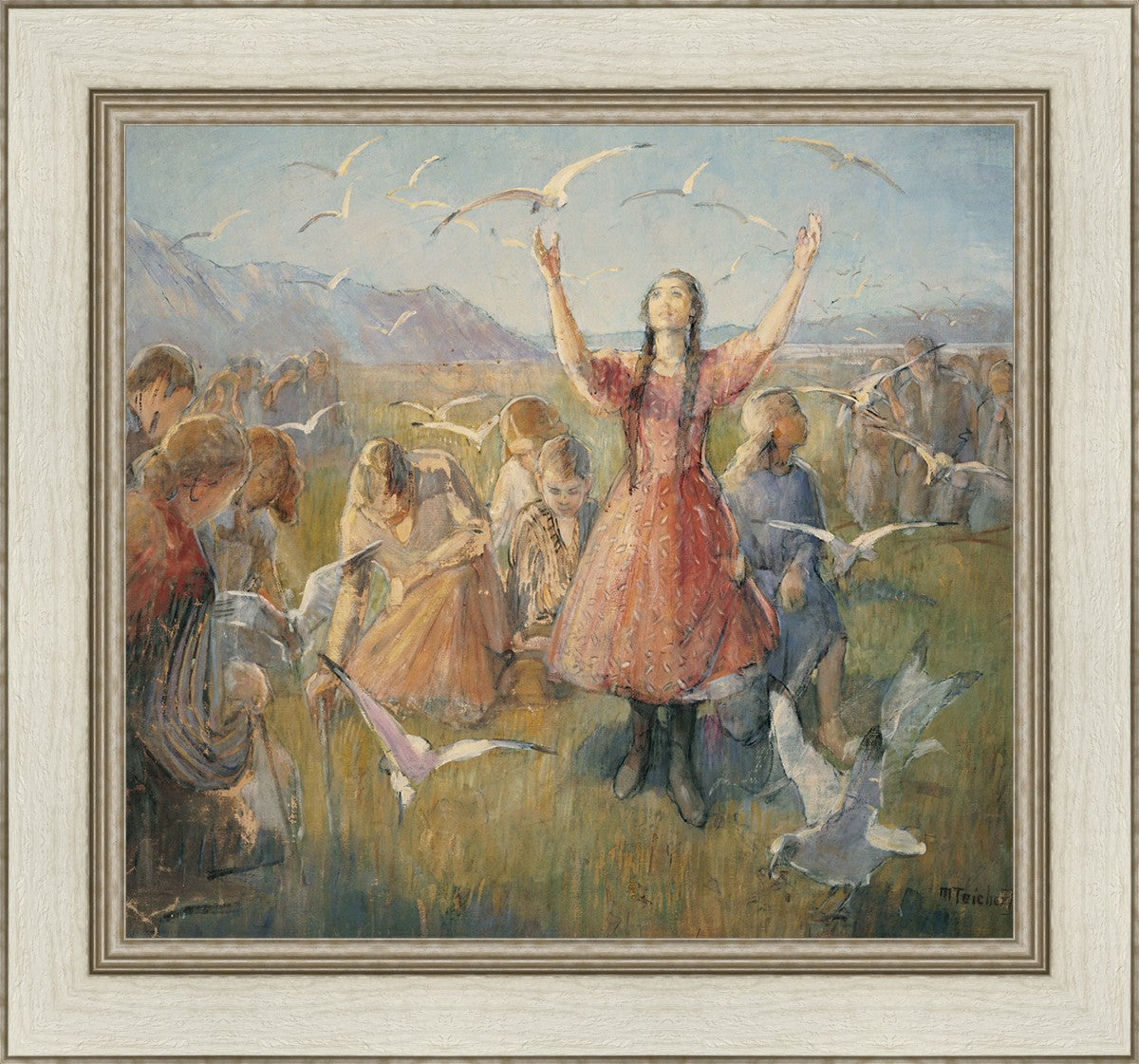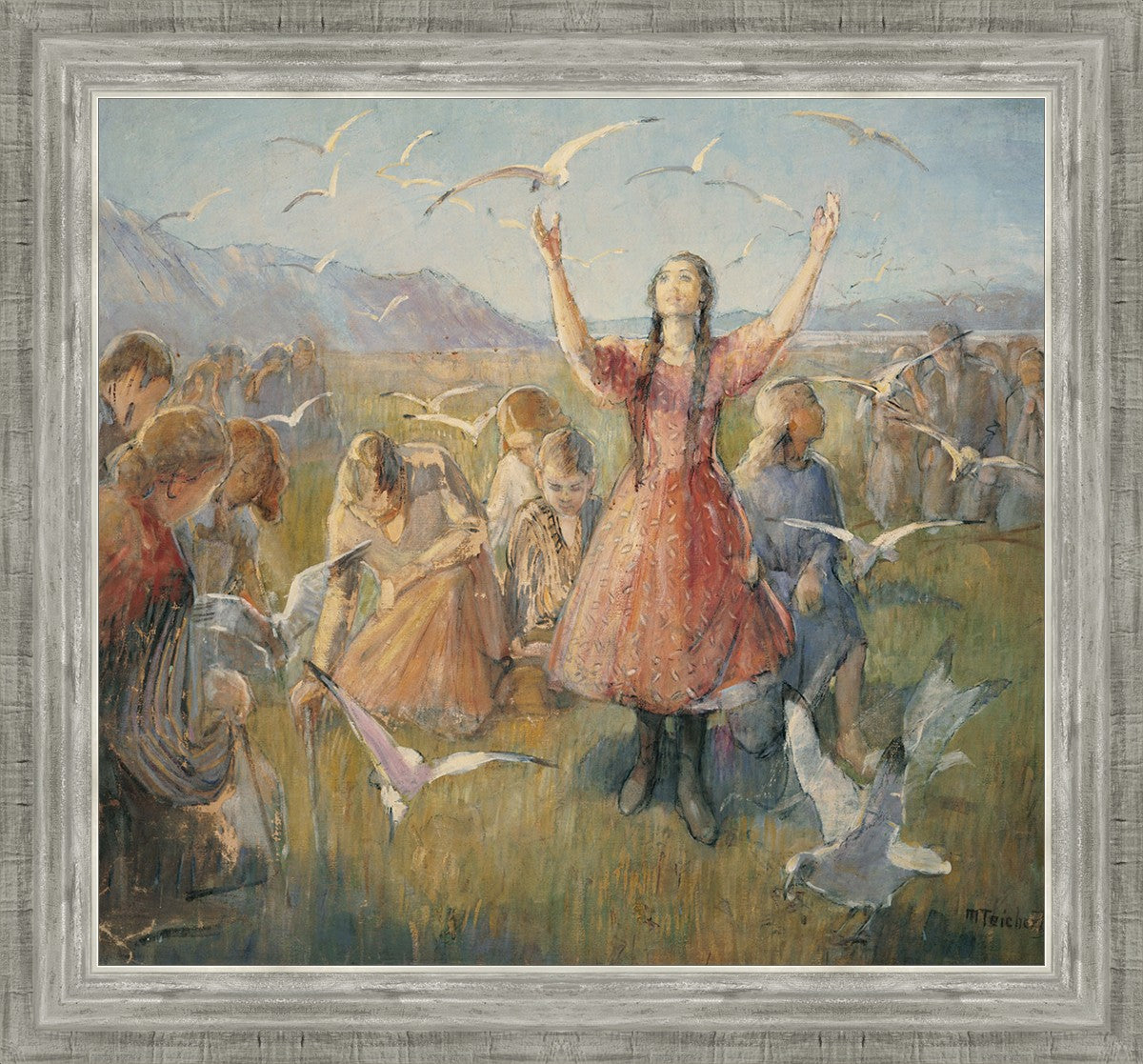 Betty and the Gulls is a second piece by Minerva Teichert to celebrate the miracle of the seagulls coming to eat the crickets and save the first crops of the Salt Lake valley. She loved the story of how the seagulls swooped in after much prayer and saved the crops of the early Salt Lake pioneers. Minerva not only recounted the story often, but she learned of the details of the entire event directly from her grandmother Minerva Wade Hickman, who was present at the miracle.