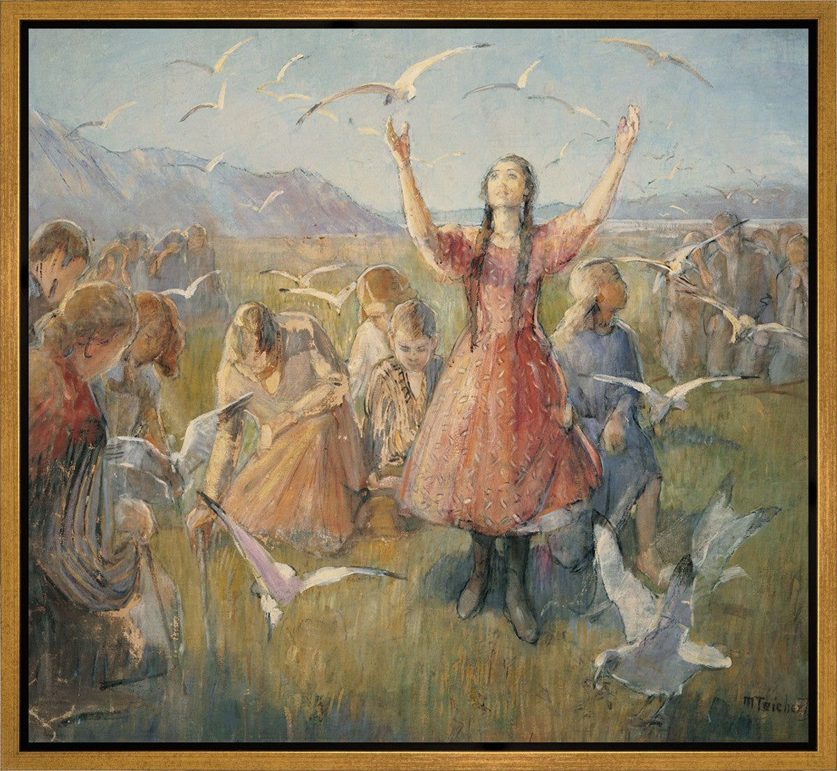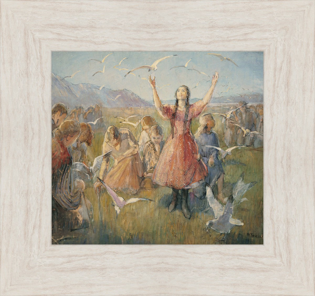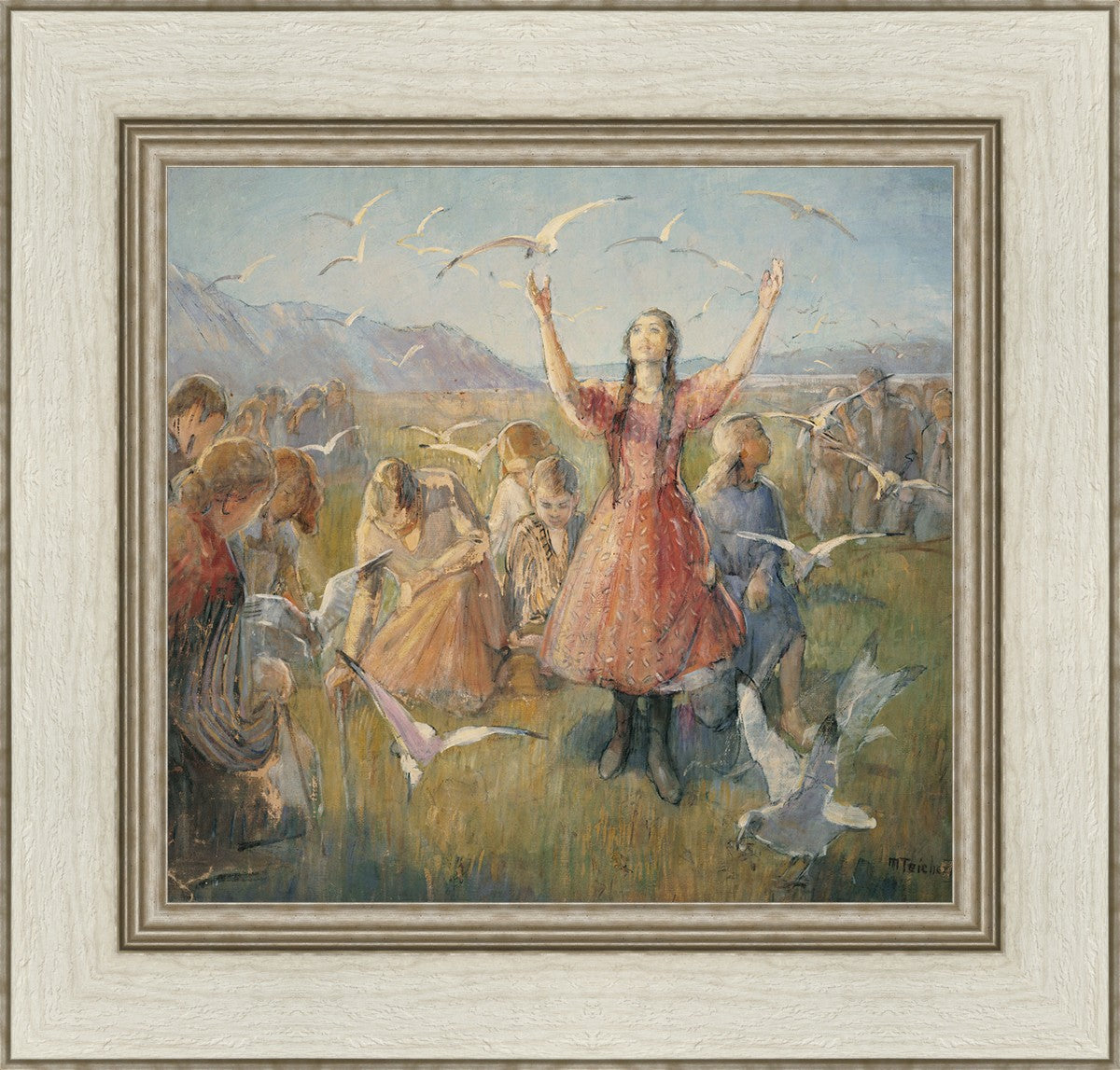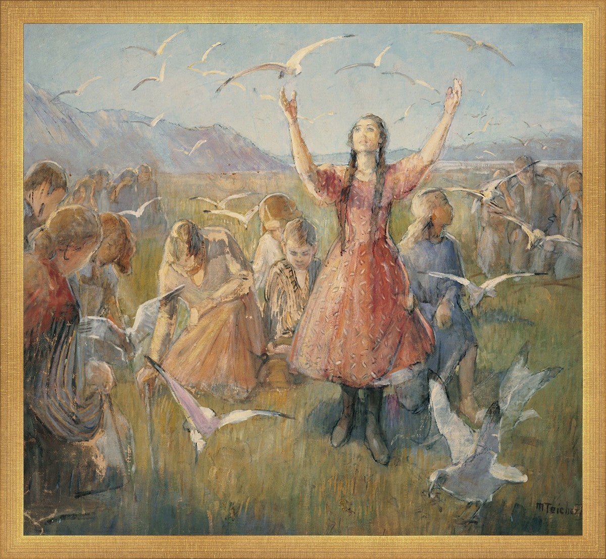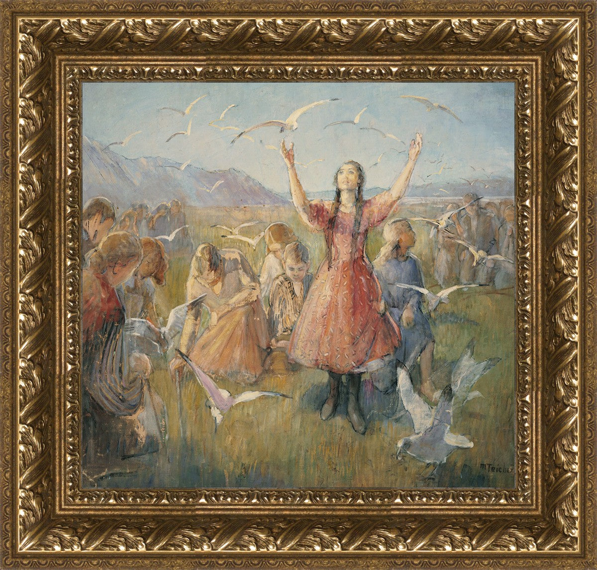 Betty and the Gulls is a second piece by Minerva Teichert to celebrate the miracle of the seagulls coming to eat the crickets and save the first crops of the Salt Lake valley. She loved the story of how the seagulls swooped in after much prayer and saved the crops of the early Salt Lake pioneers. Minerva not only recounted the story often, but she learned of the details of the entire event directly from her grandmother Minerva Wade Hickman, who was present at the miracle.