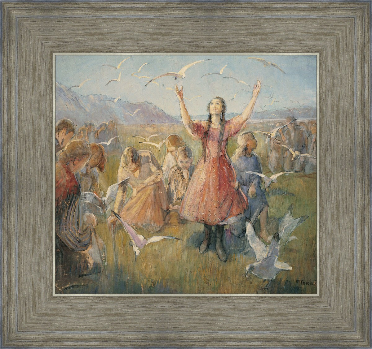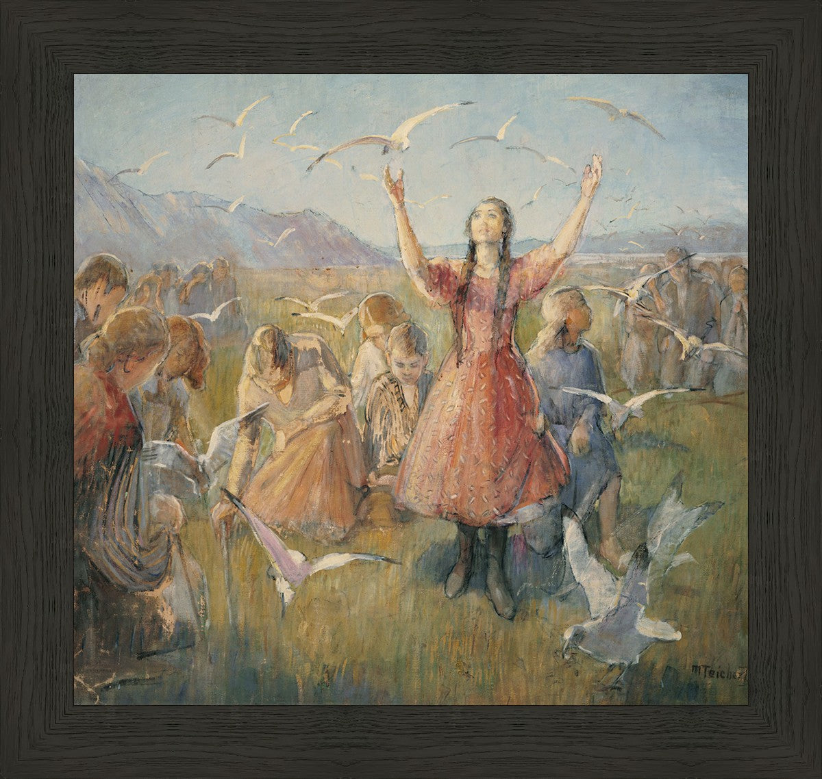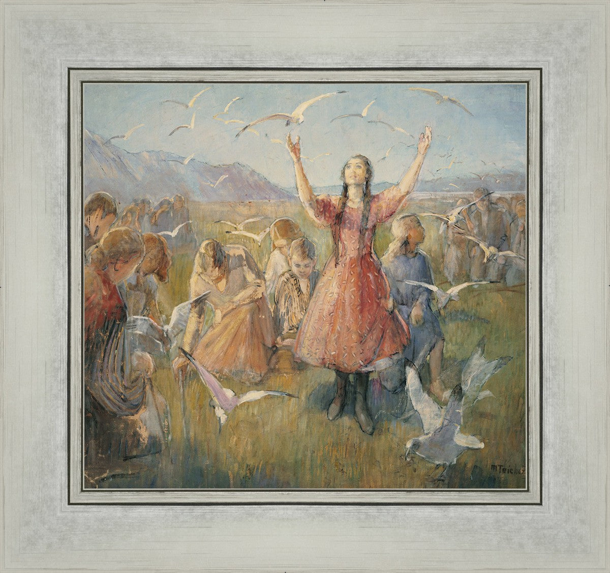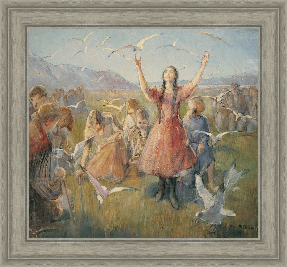 Betty and the Gulls is a second piece by Minerva Teichert to celebrate the miracle of the seagulls coming to eat the crickets and save the first crops of the Salt Lake valley. She loved the story of how the seagulls swooped in after much prayer and saved the crops of the early Salt Lake pioneers. Minerva not only recounted the story often, but she learned of the details of the entire event directly from her grandmother Minerva Wade Hickman, who was present at the miracle.