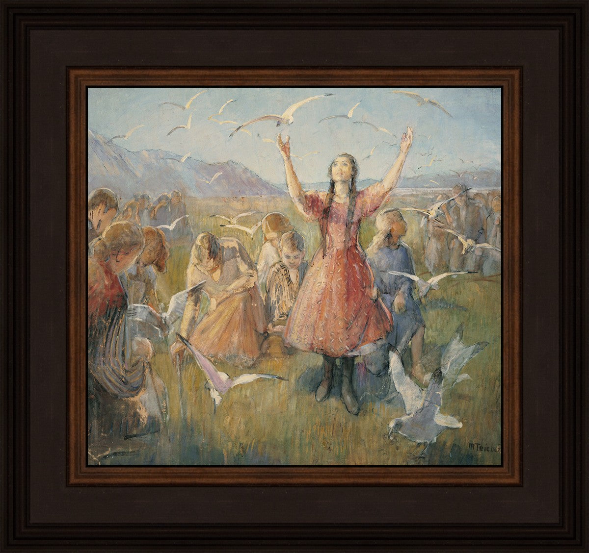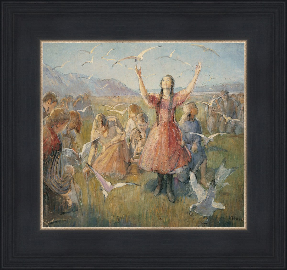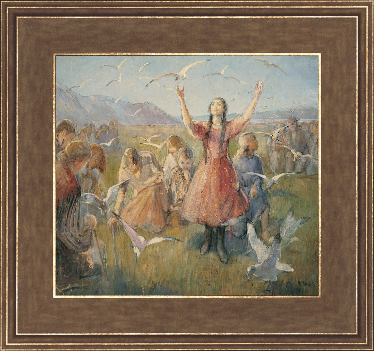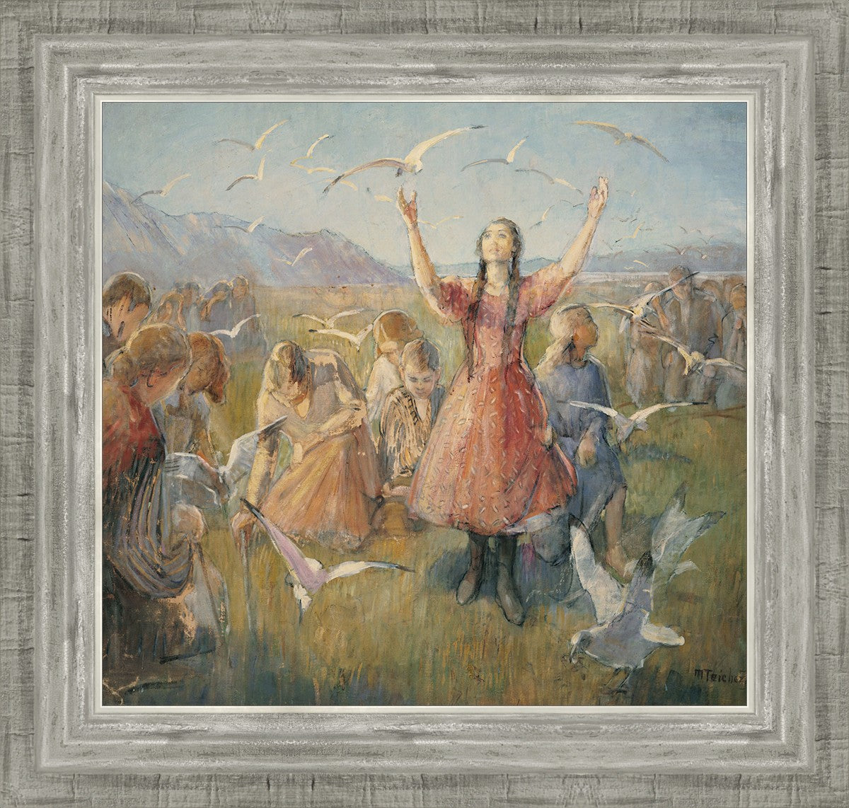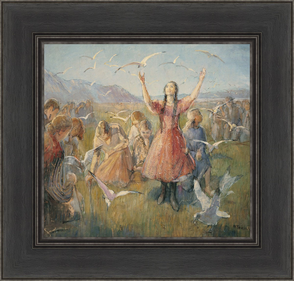 Betty and the Gulls is a second piece by Minerva Teichert to celebrate the miracle of the seagulls coming to eat the crickets and save the first crops of the Salt Lake valley. She loved the story of how the seagulls swooped in after much prayer and saved the crops of the early Salt Lake pioneers. Minerva not only recounted the story often, but she learned of the details of the entire event directly from her grandmother Minerva Wade Hickman, who was present at the miracle.