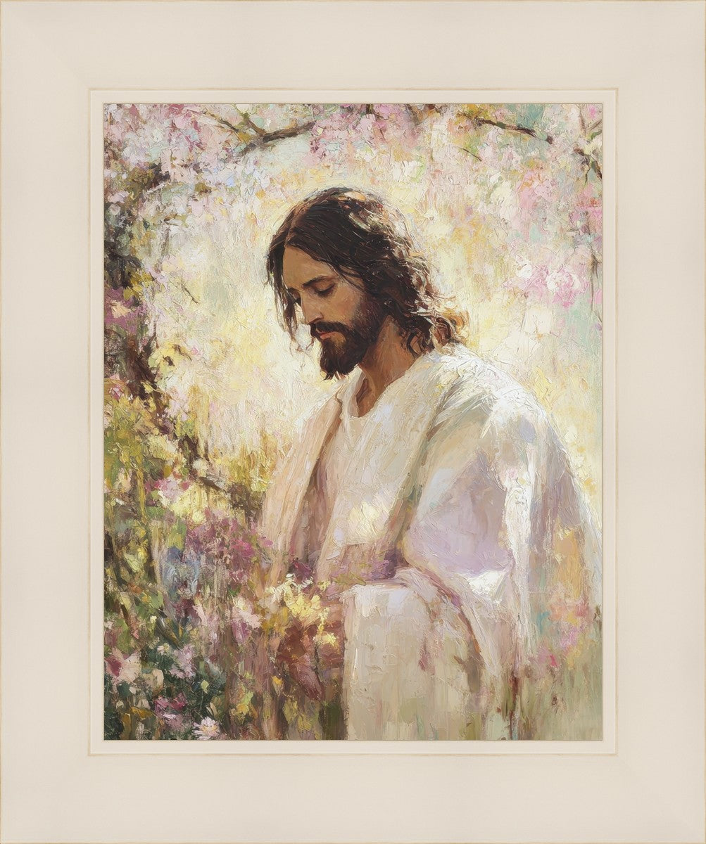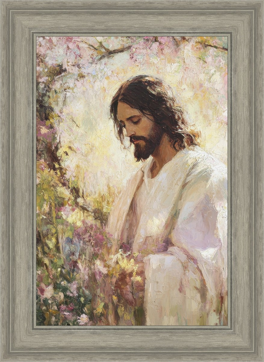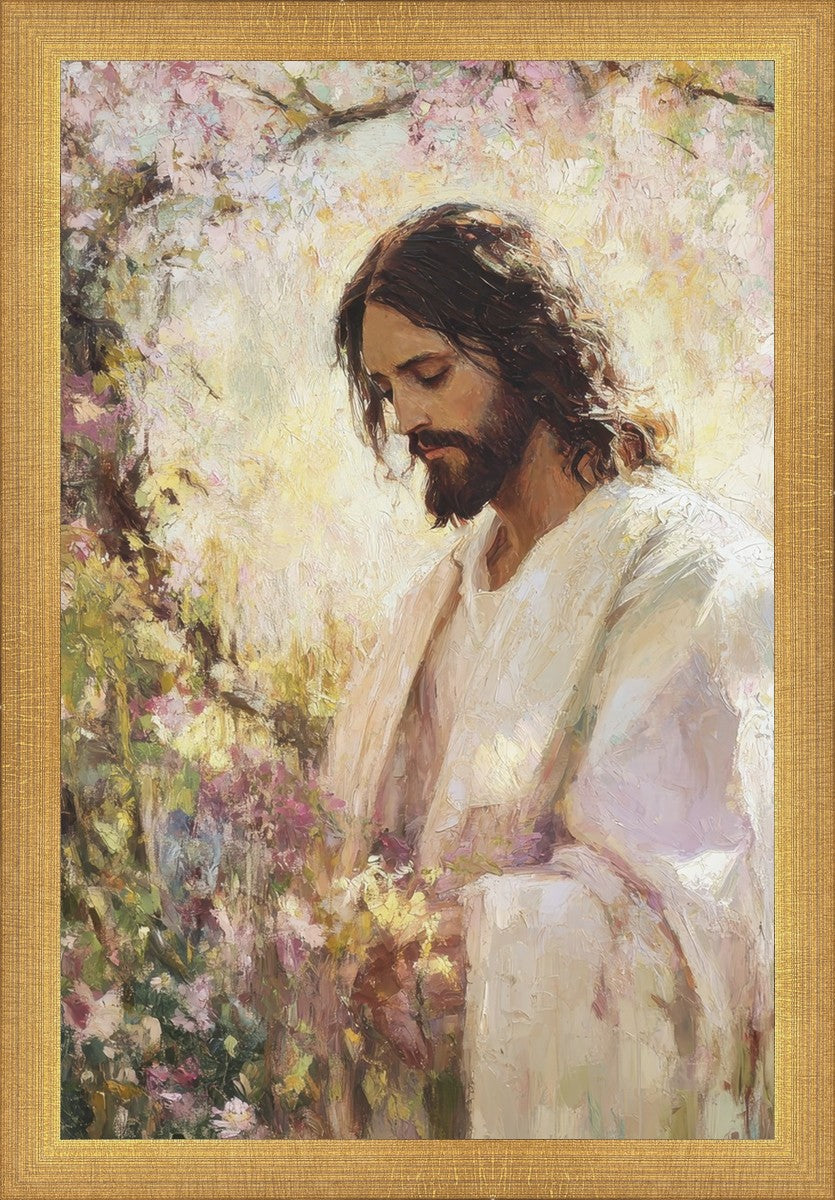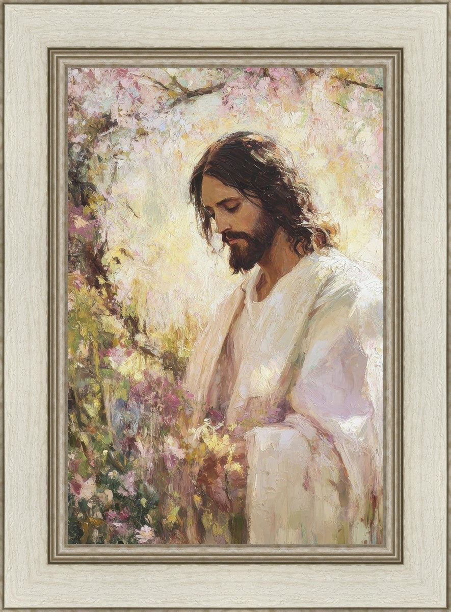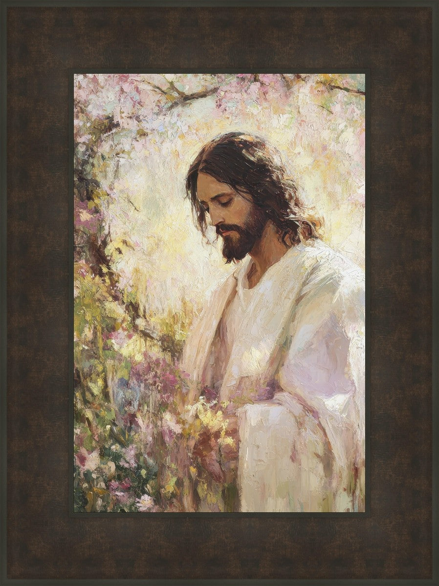 We wanted to capture the simple yet profound truth that we are all divinely created with love and purpose. Jesus stands among delicate flower blossoms, a reminder that just as God carefully forms each petal. He has created each of us with the same beauty and intention. This piece is a quiet nod to His infinite care—not just for the world around us, but for every soul.