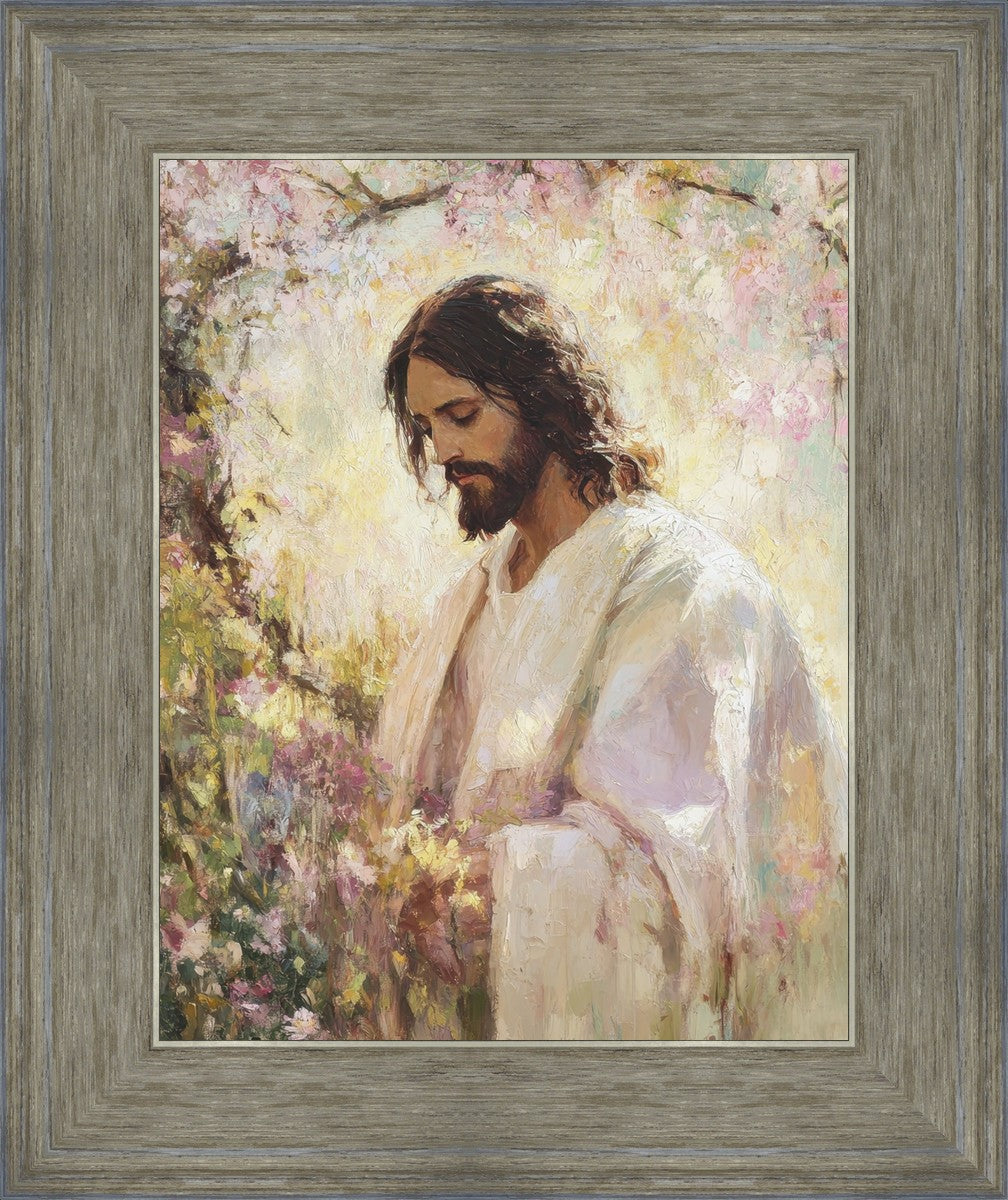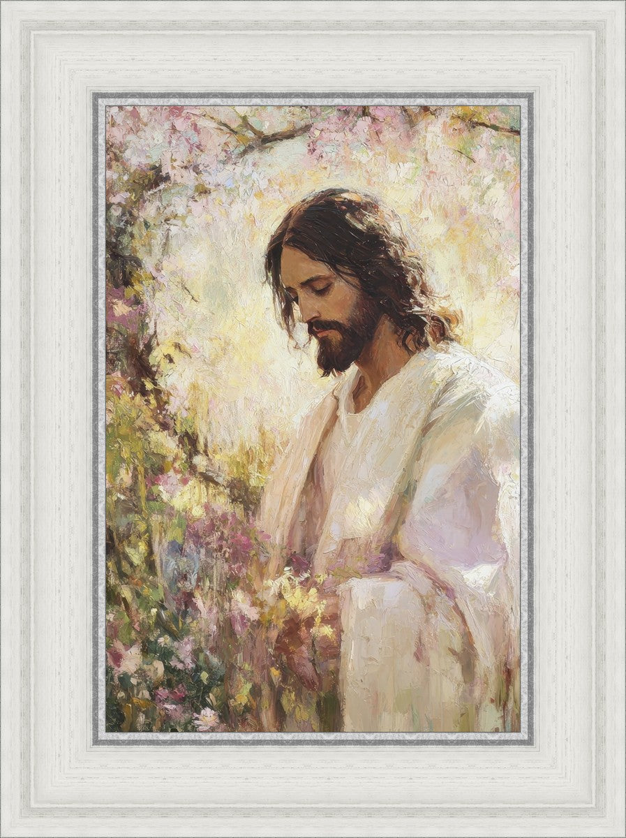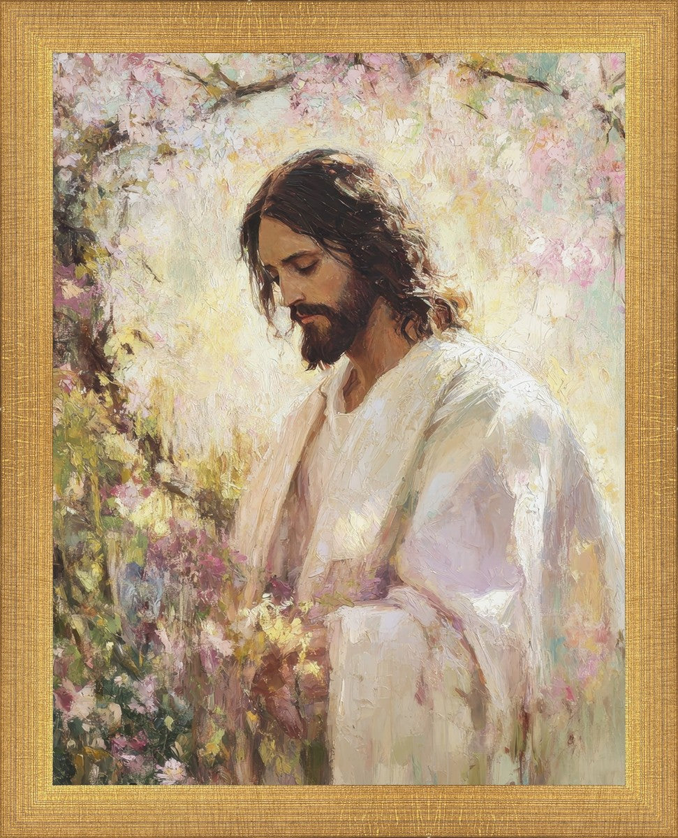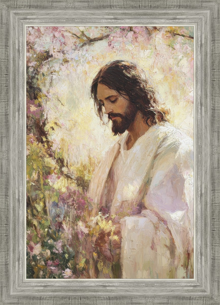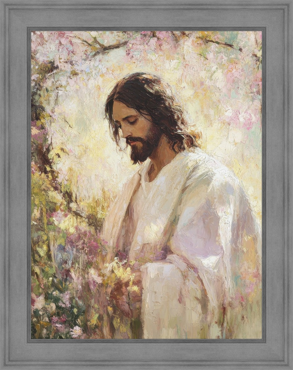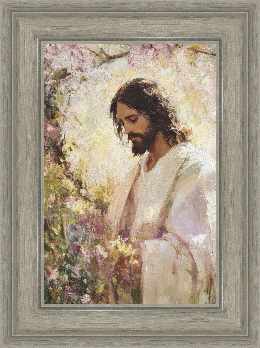 We wanted to capture the simple yet profound truth that we are all divinely created with love and purpose. Jesus stands among delicate flower blossoms, a reminder that just as God carefully forms each petal. He has created each of us with the same beauty and intention. This piece is a quiet nod to His infinite care—not just for the world around us, but for every soul.