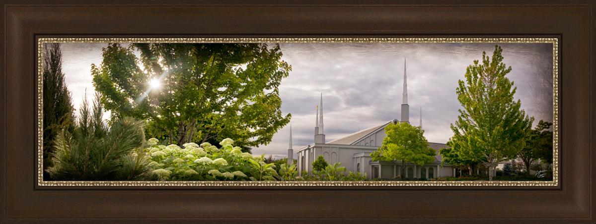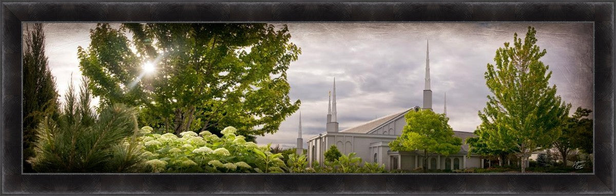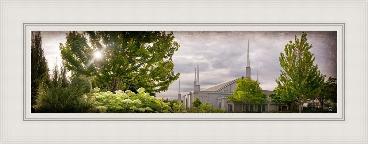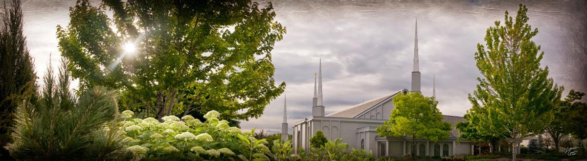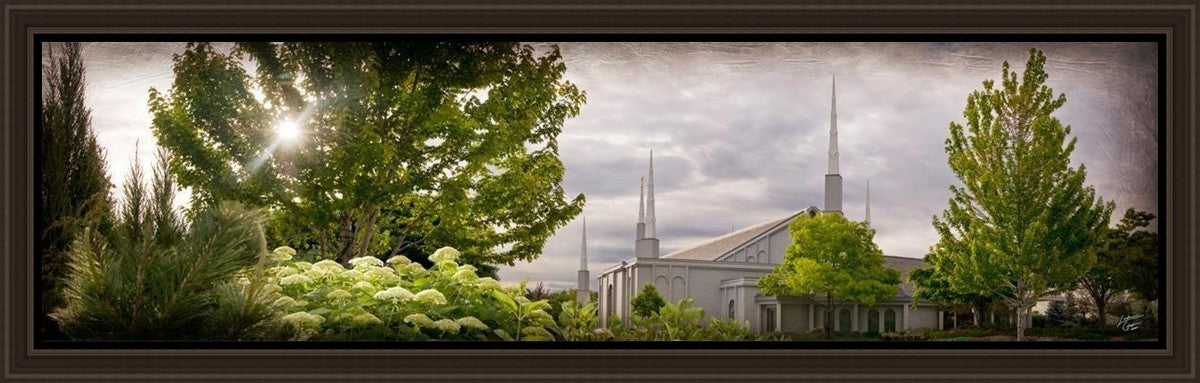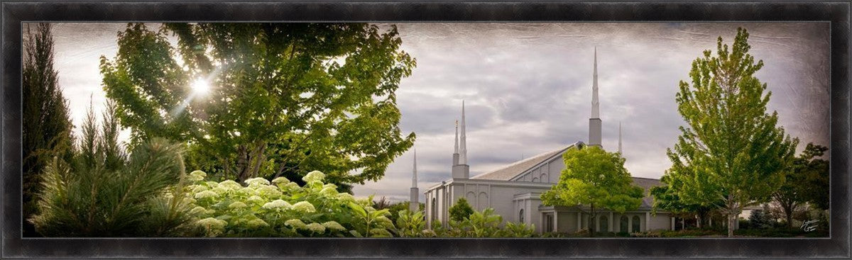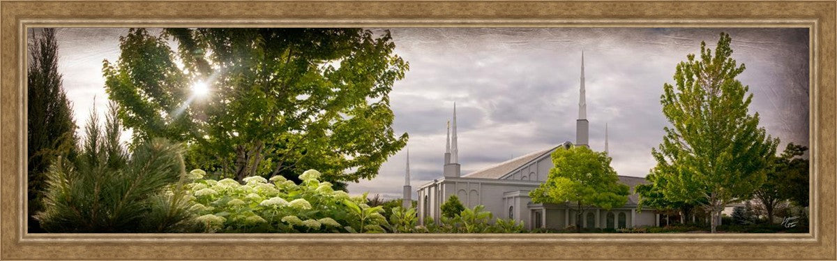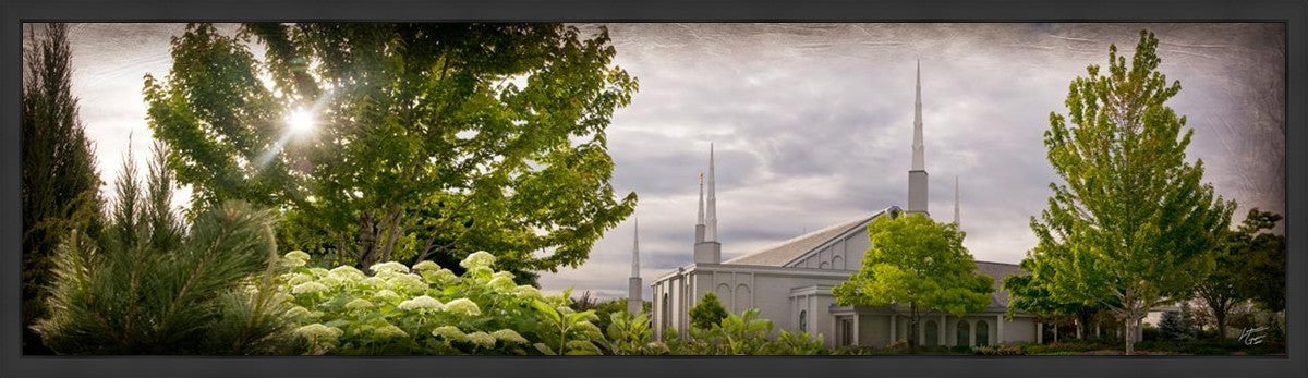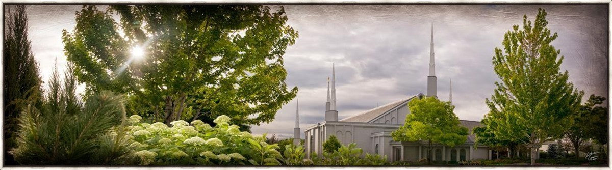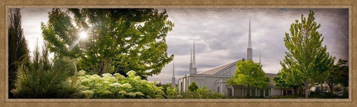 Since 1999 Landon has worked as an artisan in nearly 40 temples doing the decorative paint and gold leaf. He continues to do so as well as wood repair and graining. He was married in 2001 to Jacey Thomas in the Manti Utah temple. When she couldn’t find an image of the temple that she liked enough to purchase for their home, he decided to take one himself. That desire to create something original and different inspired his current series of temple art. They are taken from a panoramic viewpoint and stylized with an artistic border that reflect his paintings. All modern structures apart from the temple have been omitted.