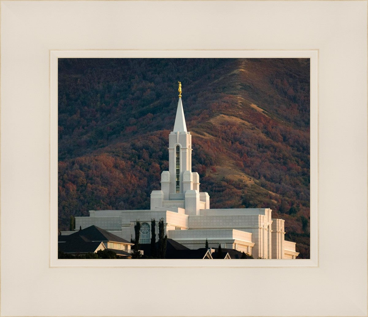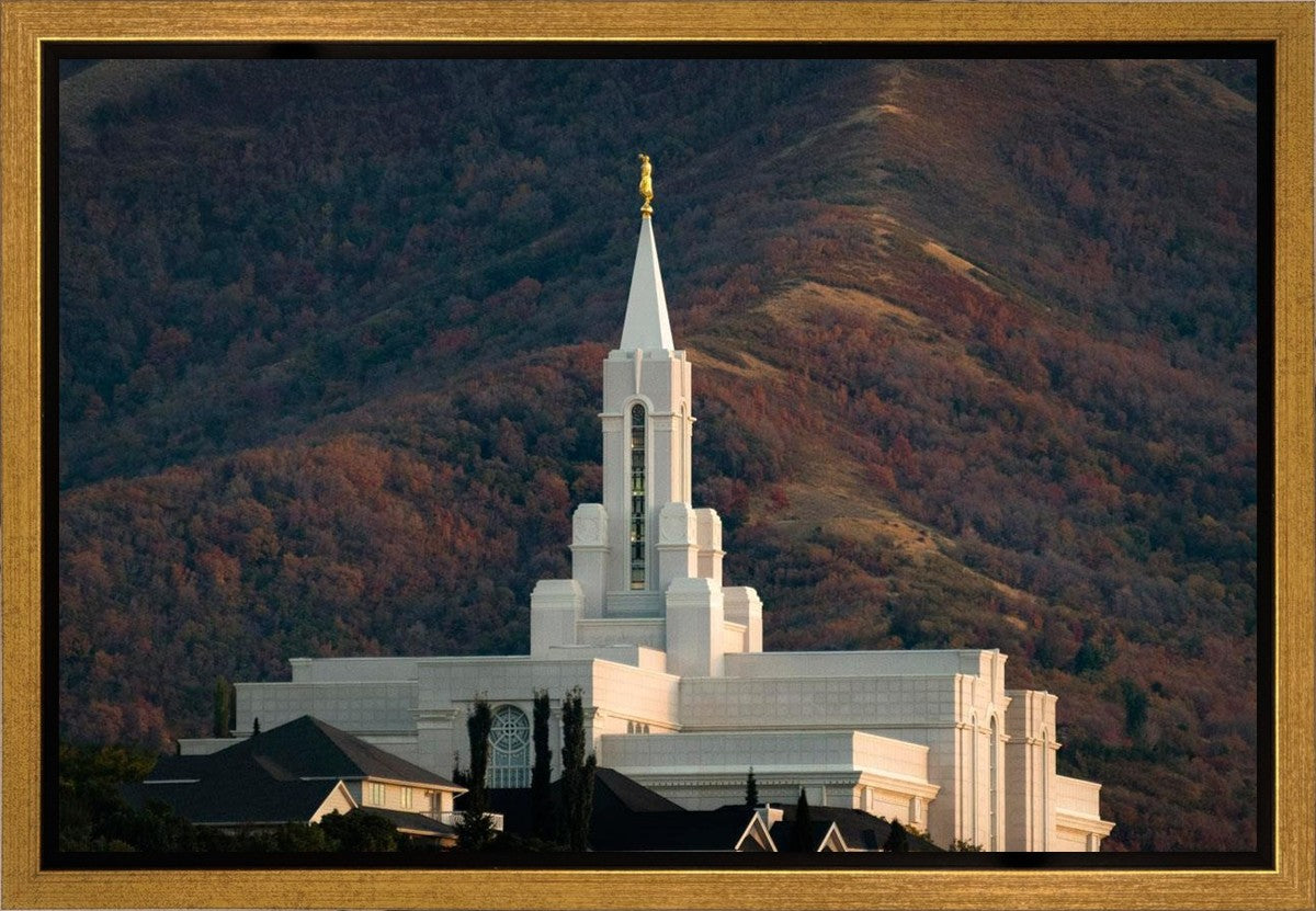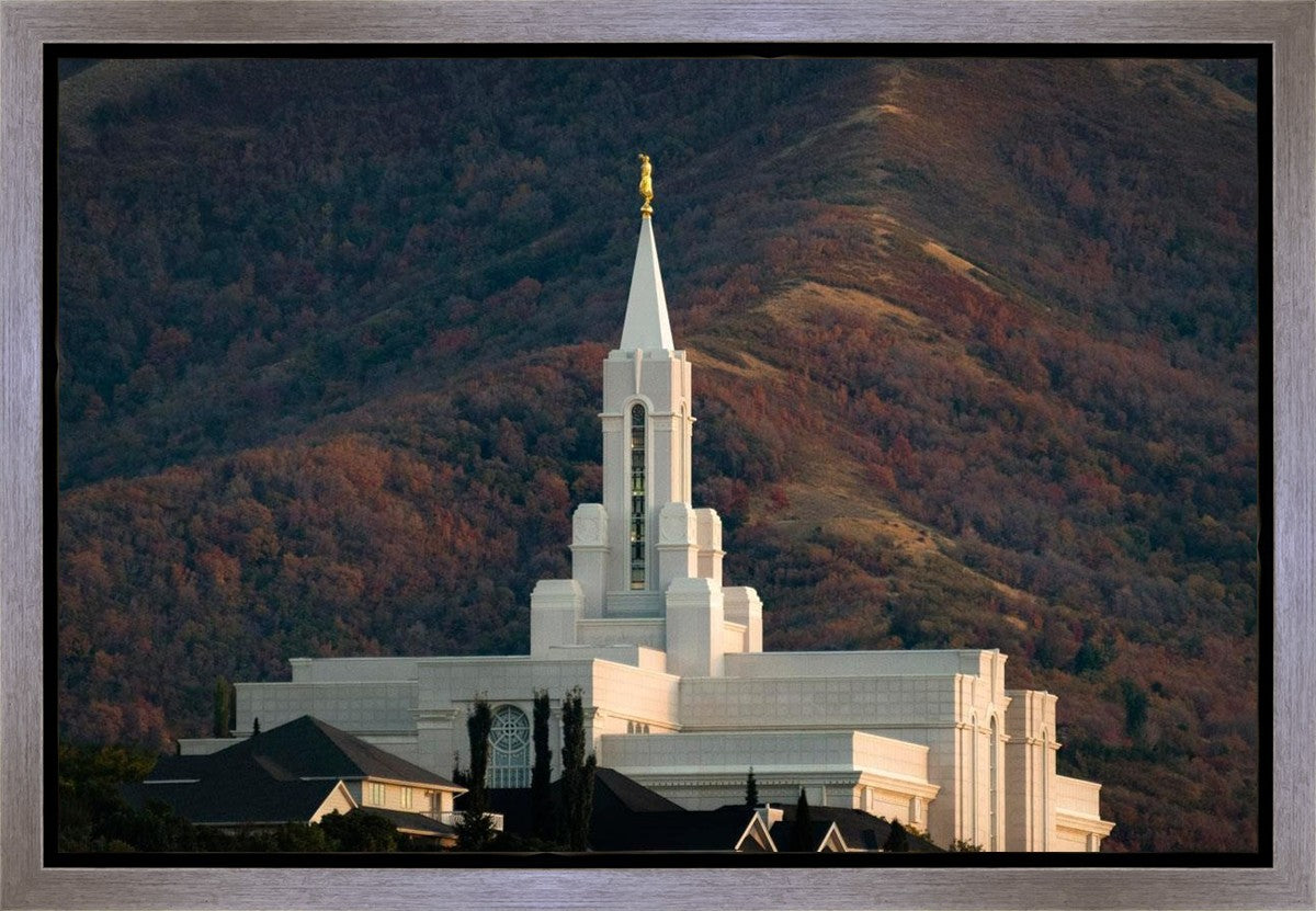 Sun sets at the Bountiful Utah Temple with the Fall foliage in the background.