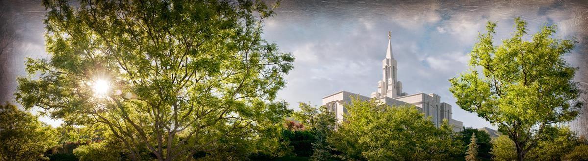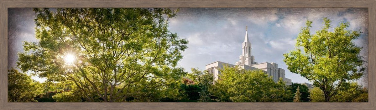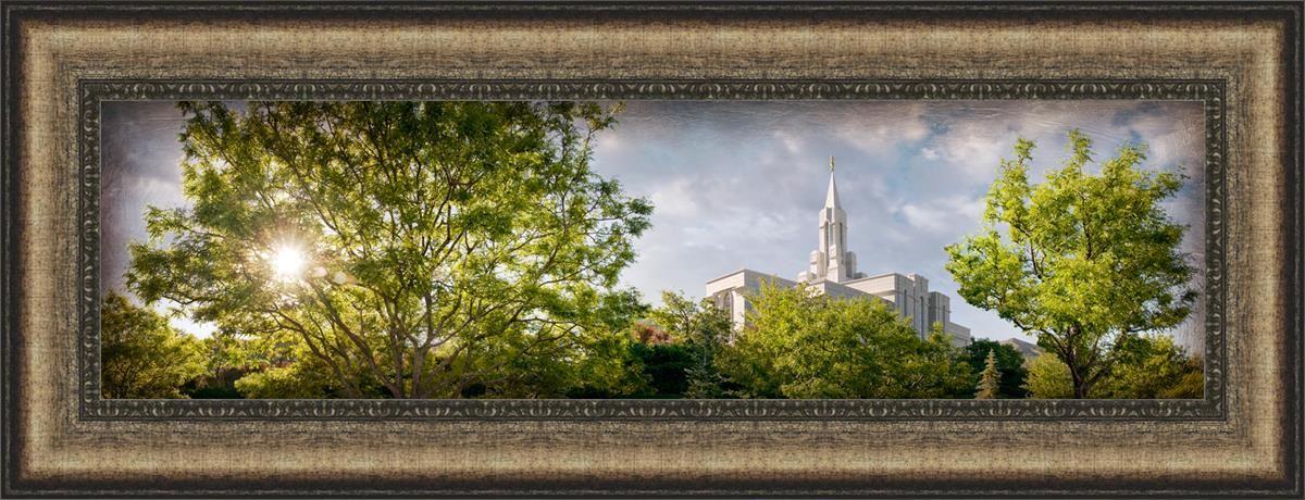 Since 1999 Landon has worked as an artisan in nearly 40 temples doing the decorative paint and gold leaf. He continues to do so as well as wood repair and graining. He was married in 2001 to Jacey Thomas in the Manti Utah temple. When she couldn’t find an image of the temple that she liked enough to purchase for their home, he decided to take one himself. That desire to create something original and different inspired his current series of temple art. They are taken from a panoramic viewpoint and stylized with an artistic border that reflect his paintings. All modern structures apart from the temple have been omitted.