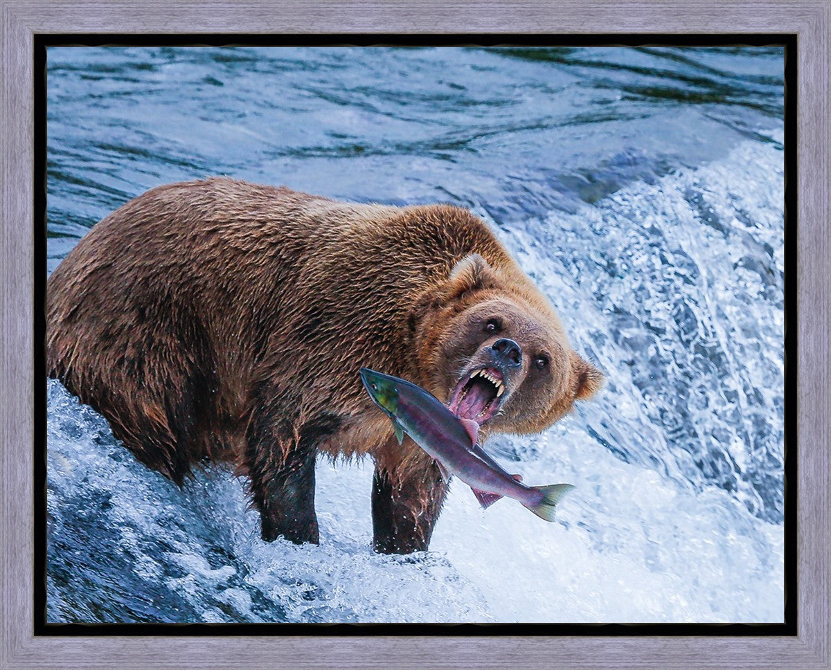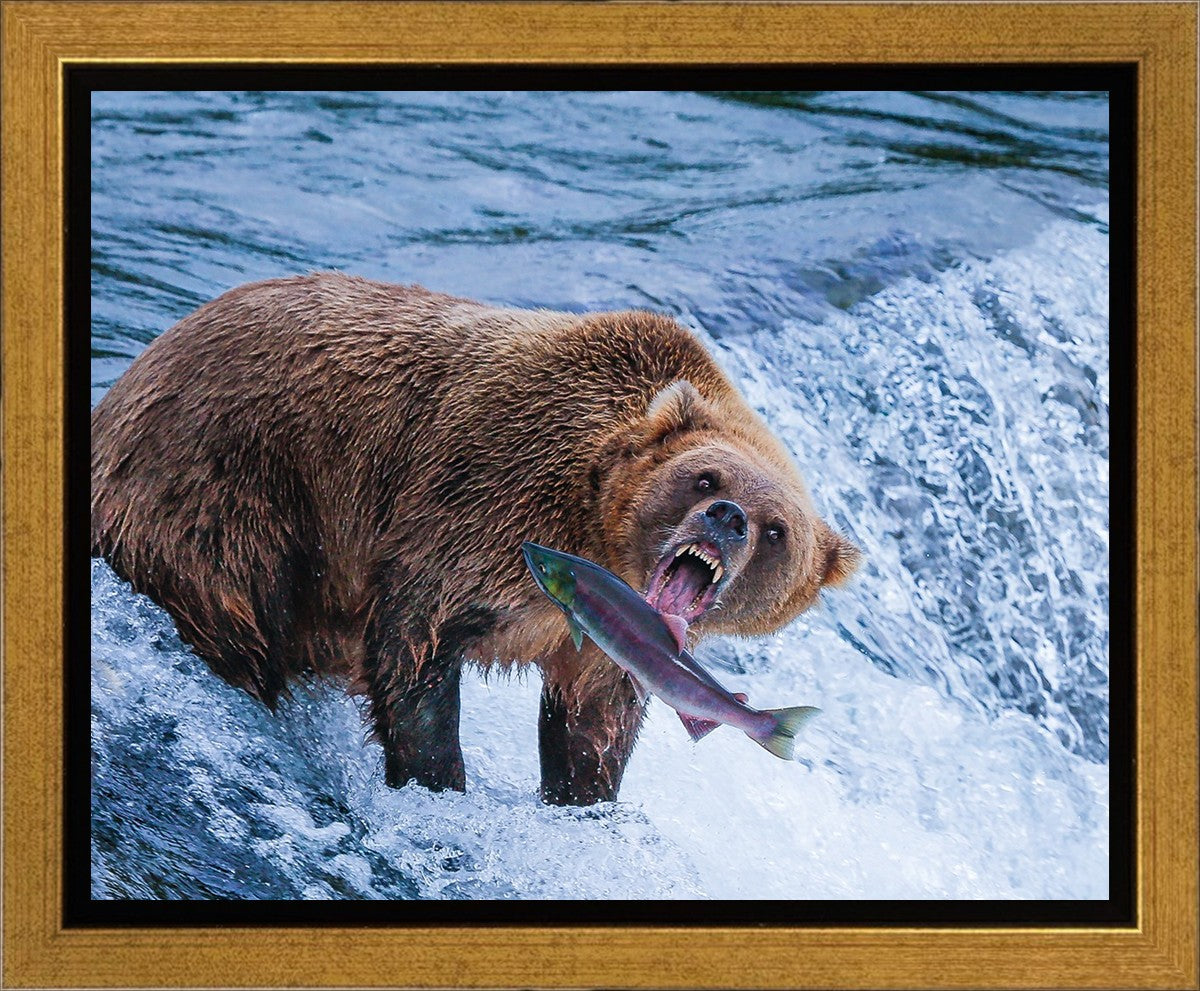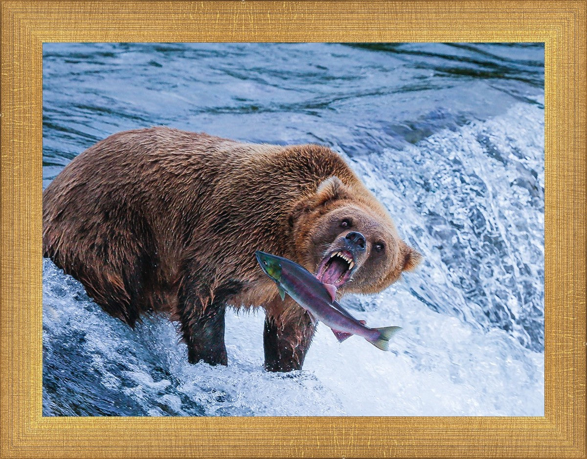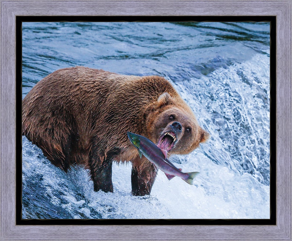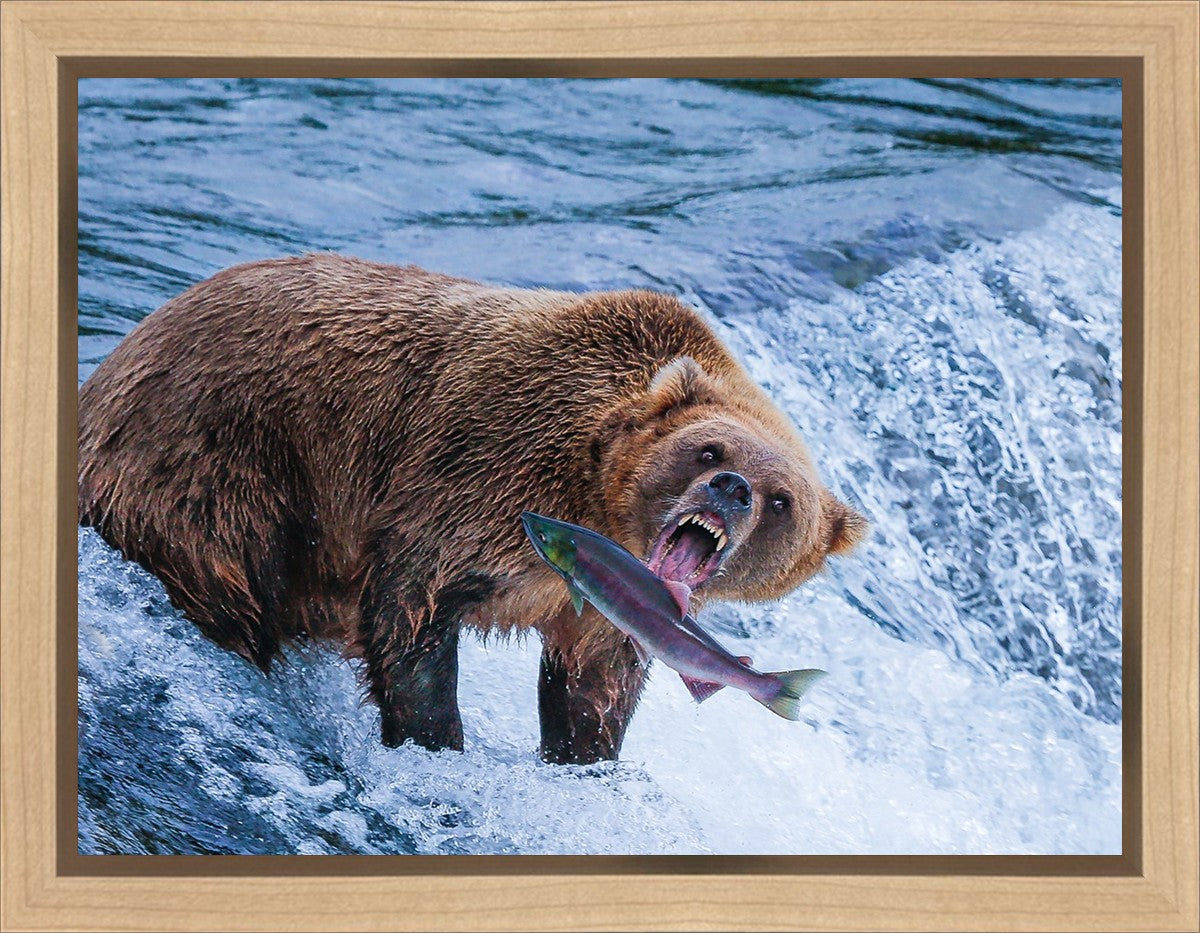 This grizzly bear strikes gold at Katmai National Park catching salmon swimming upstream