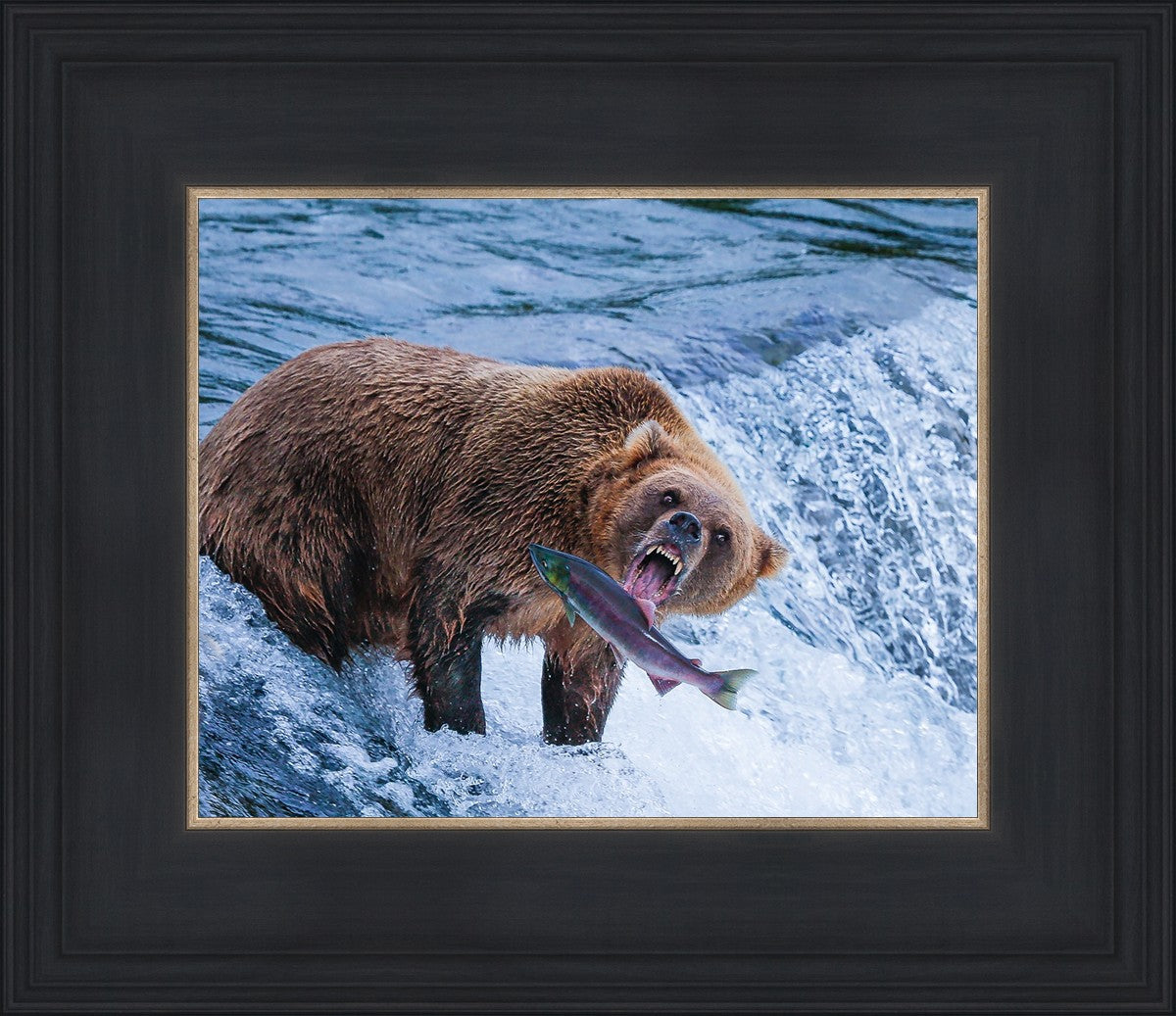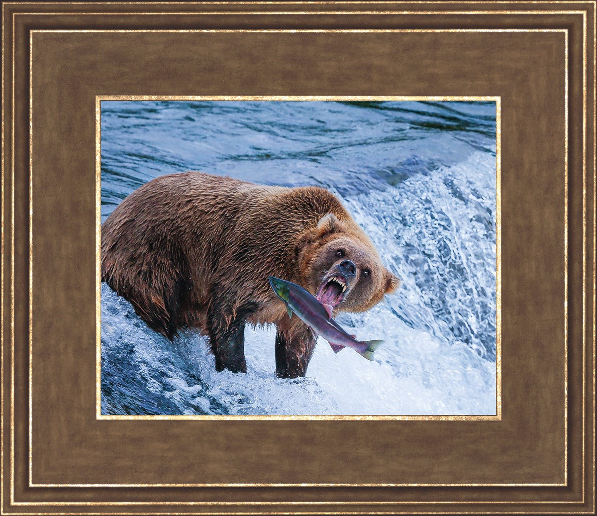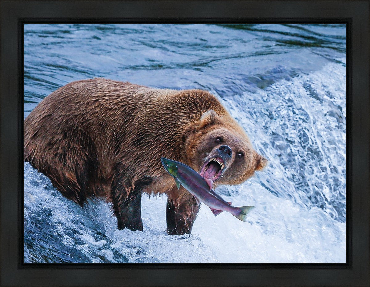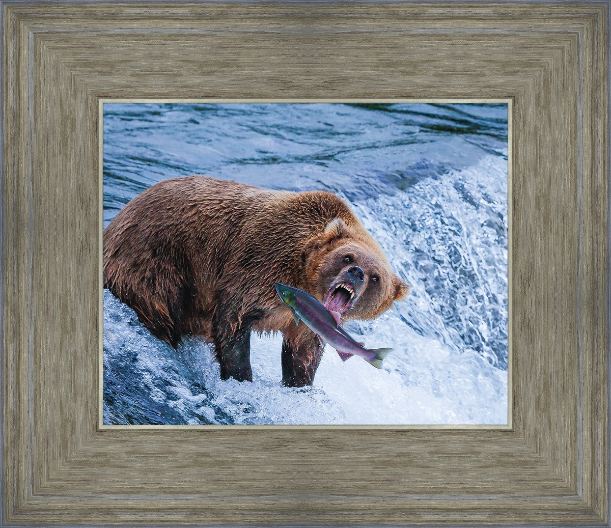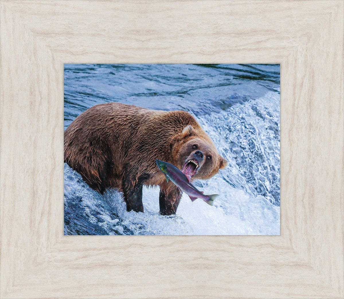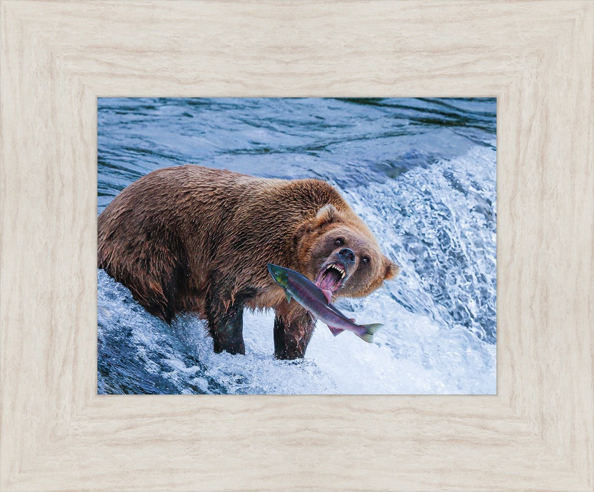 This grizzly bear strikes gold at Katmai National Park catching salmon swimming upstream