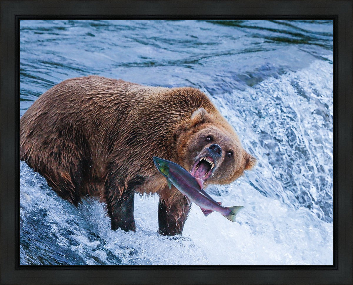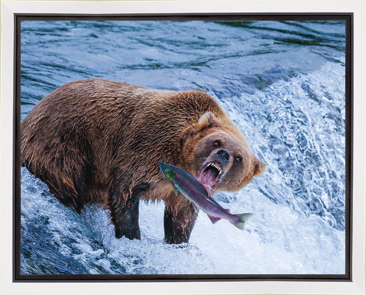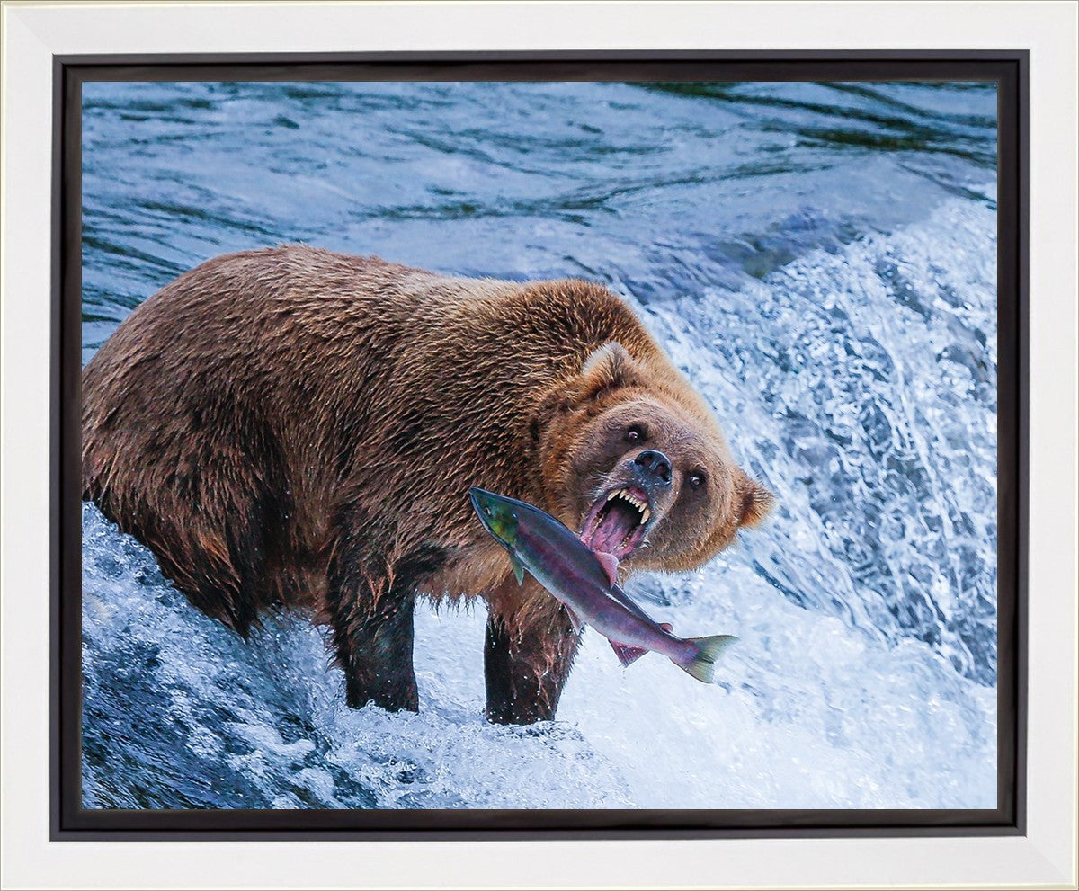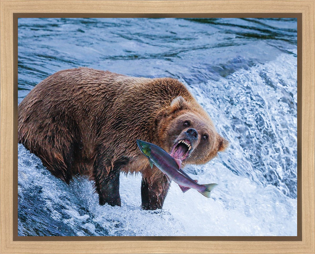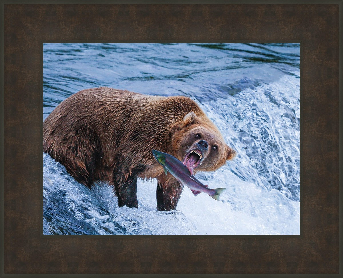 This grizzly bear strikes gold at Katmai National Park catching salmon swimming upstream