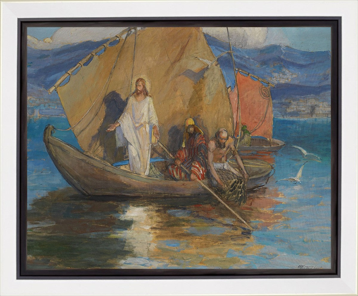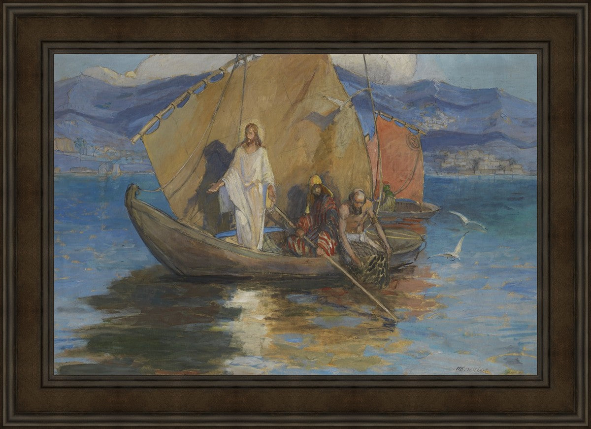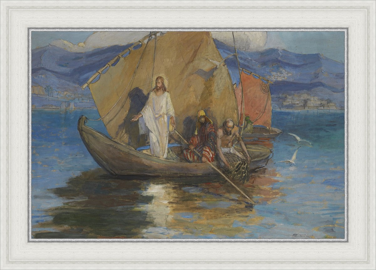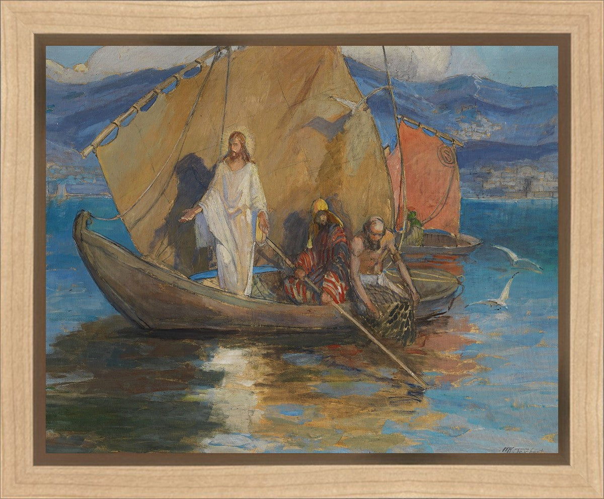 This beautiful painting shows a well-known scene of Christ, pushed back from the shore of the Sea of Galilee and preaching to the masses who have gathered along the water’s edge. As the people pressed further, Jesus stood on the deck of Peter’s ship and they rowed out a short distance so all could hear Him.