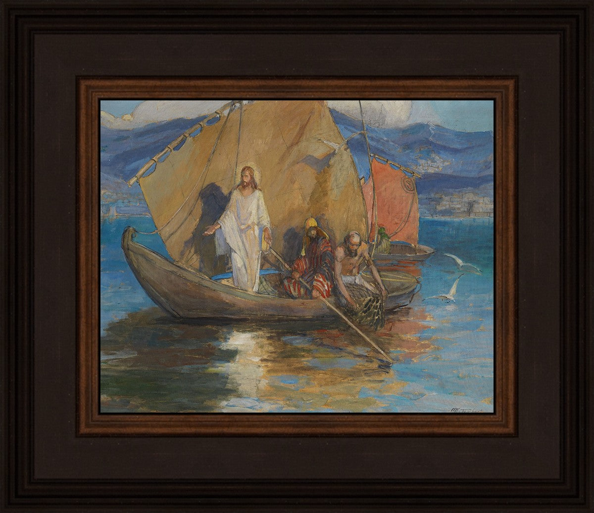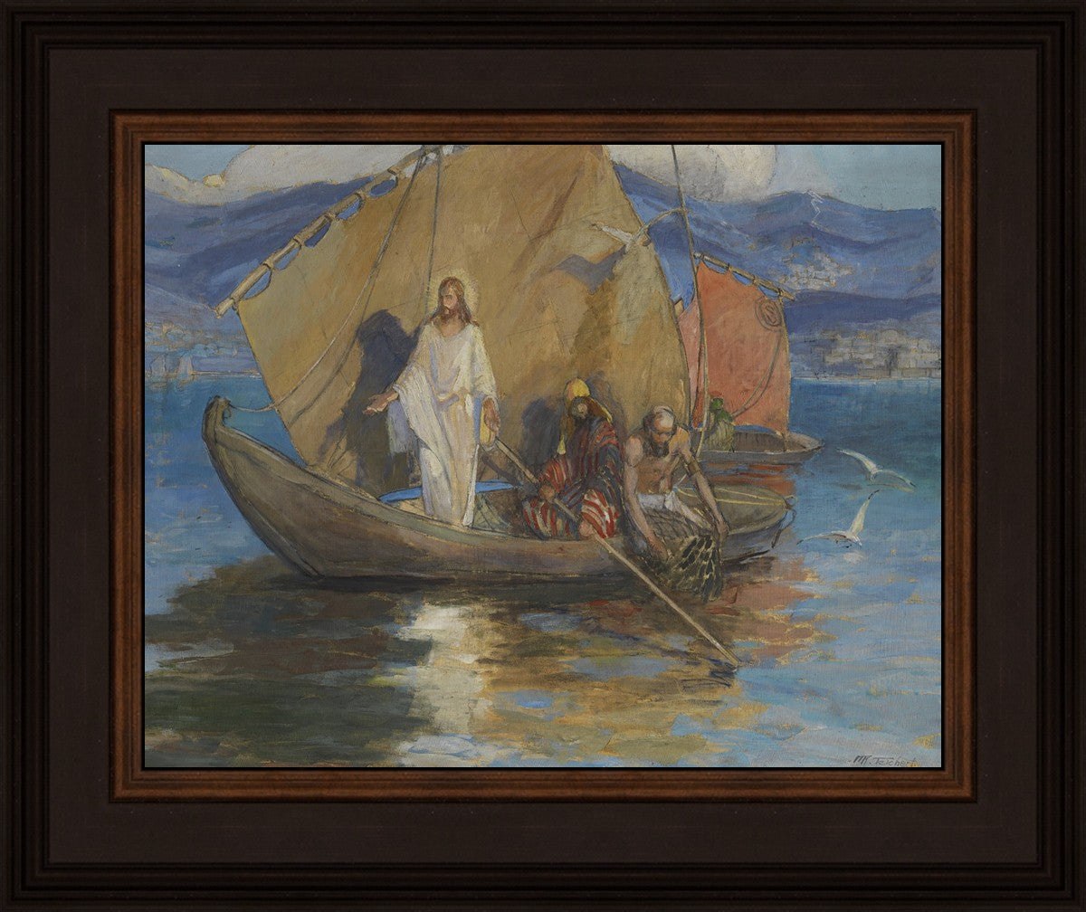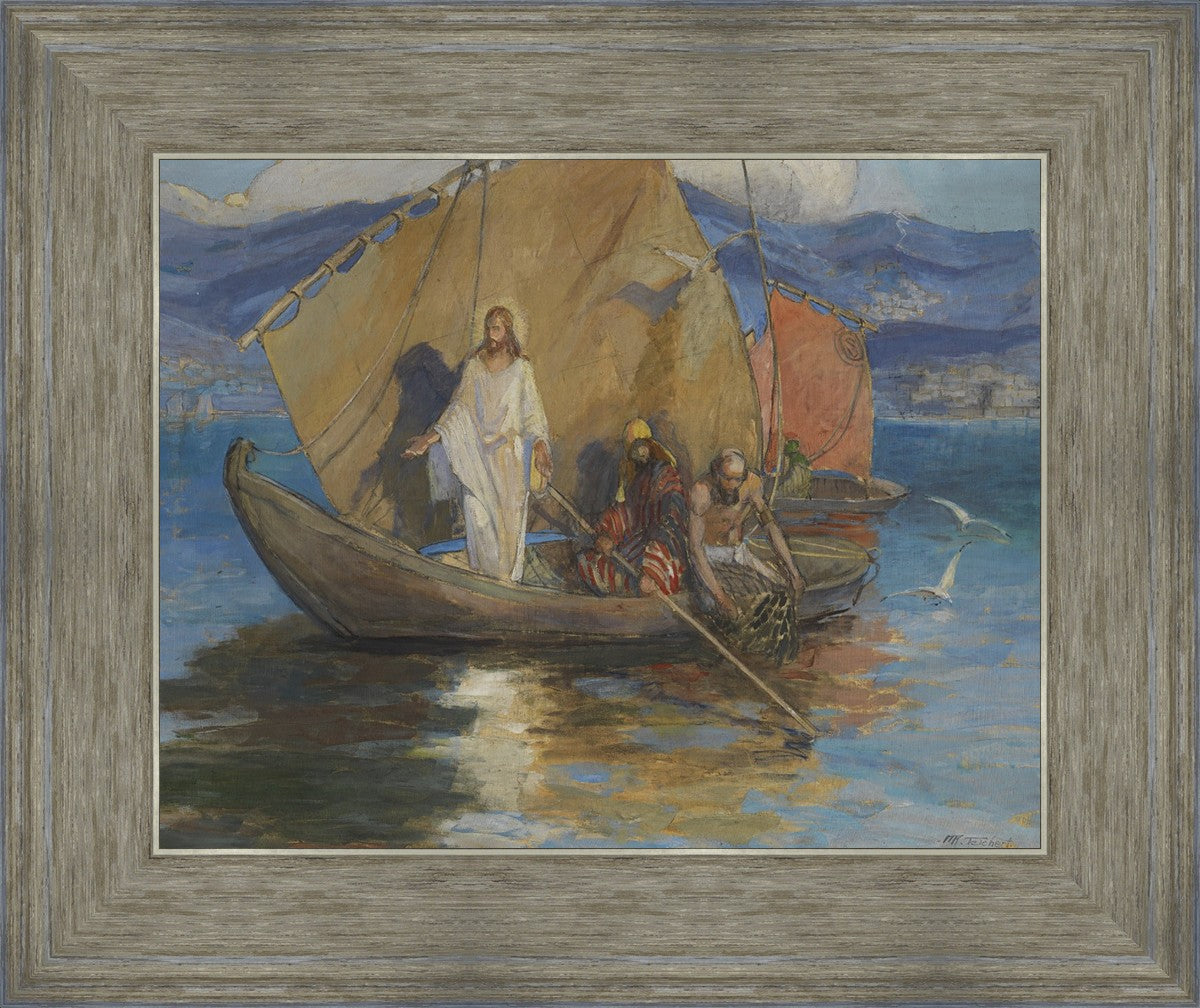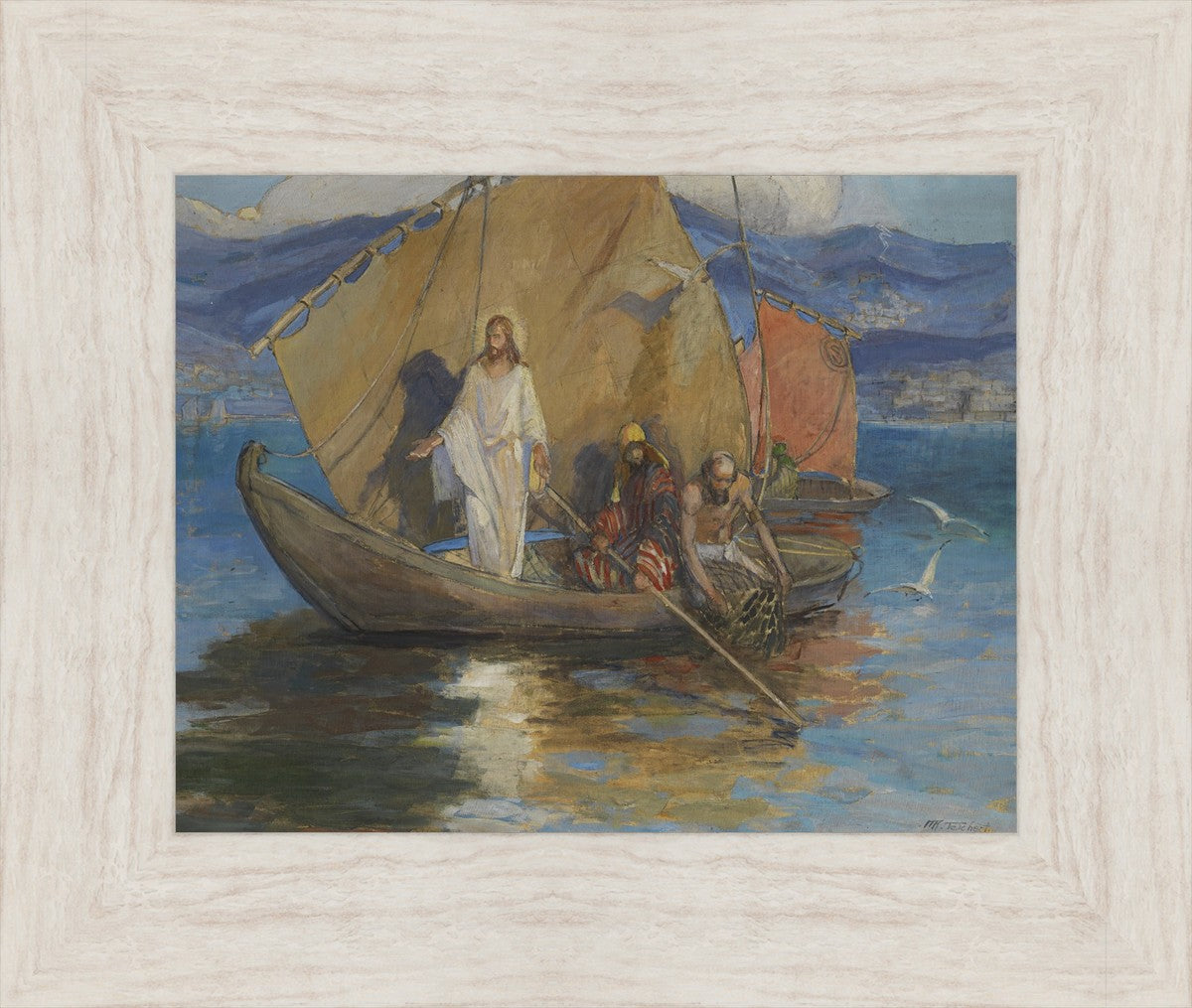 This beautiful painting shows a well-known scene of Christ, pushed back from the shore of the Sea of Galilee and preaching to the masses who have gathered along the water’s edge. As the people pressed further, Jesus stood on the deck of Peter’s ship and they rowed out a short distance so all could hear Him.