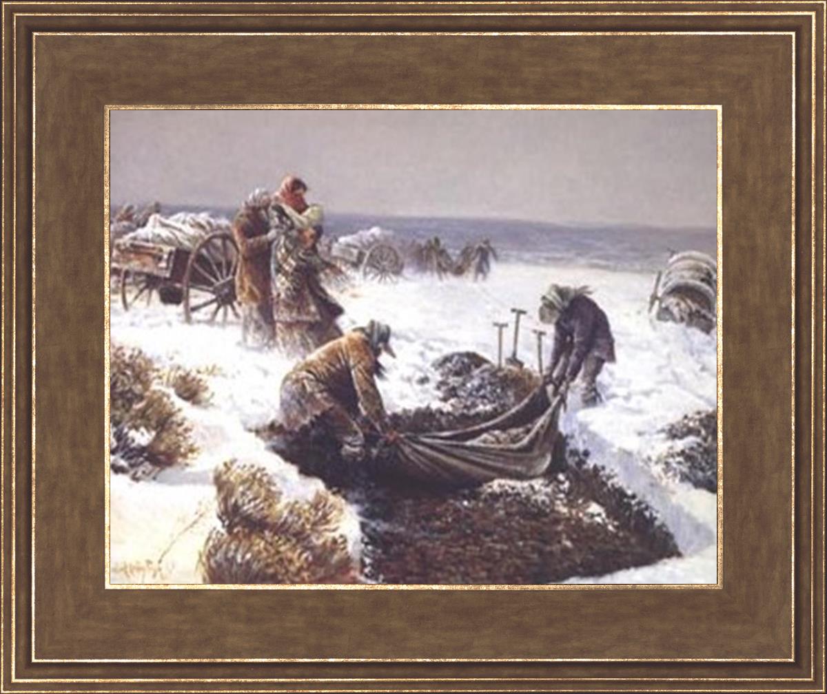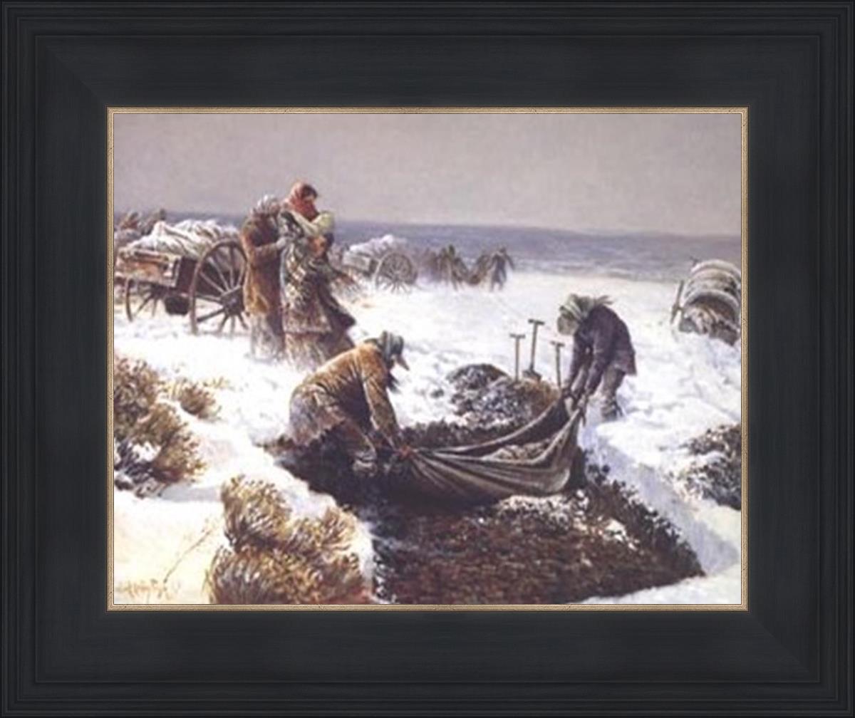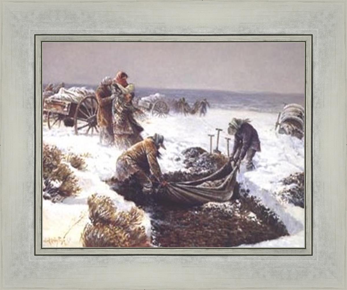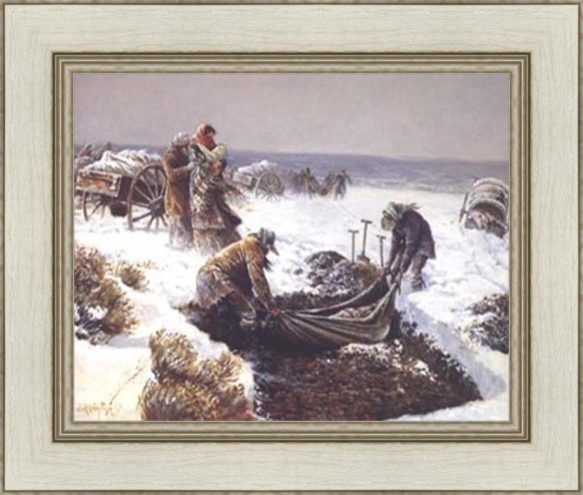 In the painting, I have pictured my relatives who were in the Martin Company. The woman holding the infant is my great great grandmother, Elizabeth Steele, from Scotland. The baby is James E. Steele, about one year old at that time. Her husband being buried is James Steele. They were converts and had just lately arrived in America in great expectation of a grand future in Zion. James had literally starved to death giving all his food to his children and wife. He died on the windswept plains, hundreds of miles from Zion, but it was in his heart and as the Savior said,