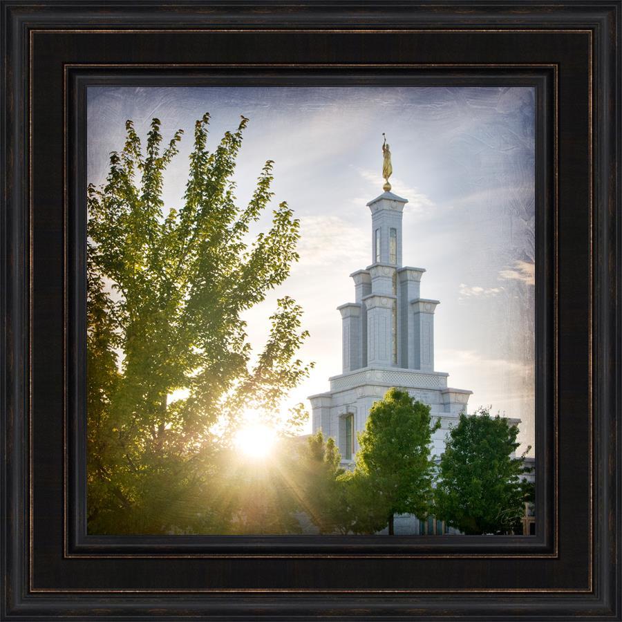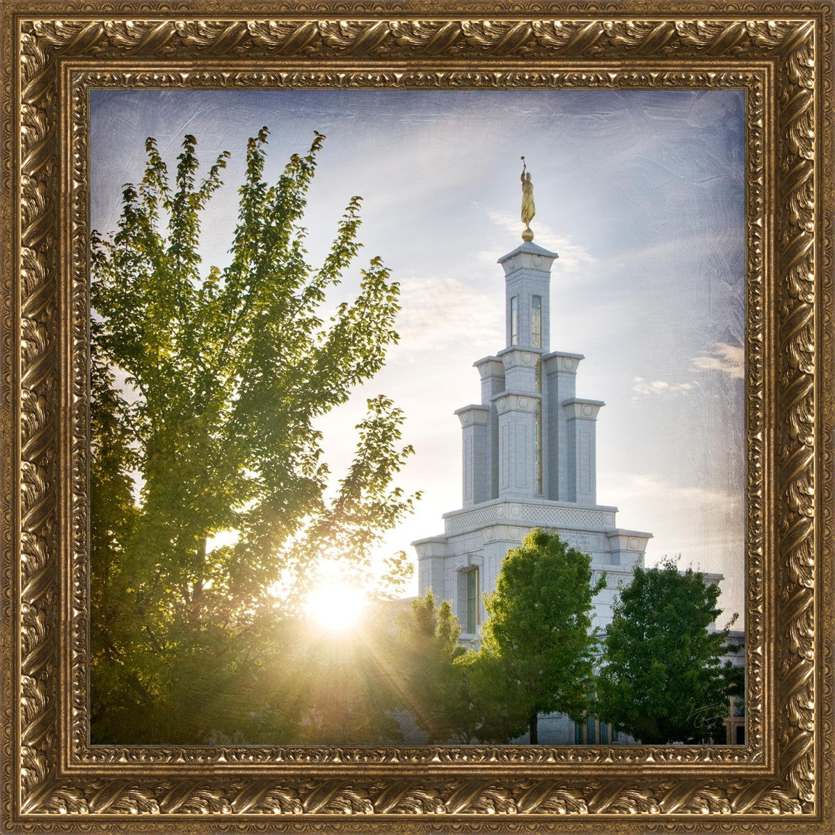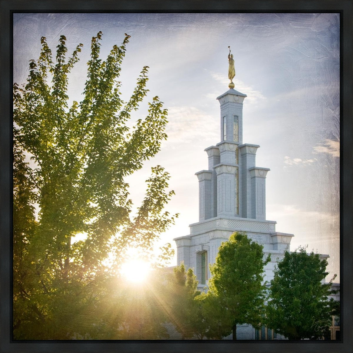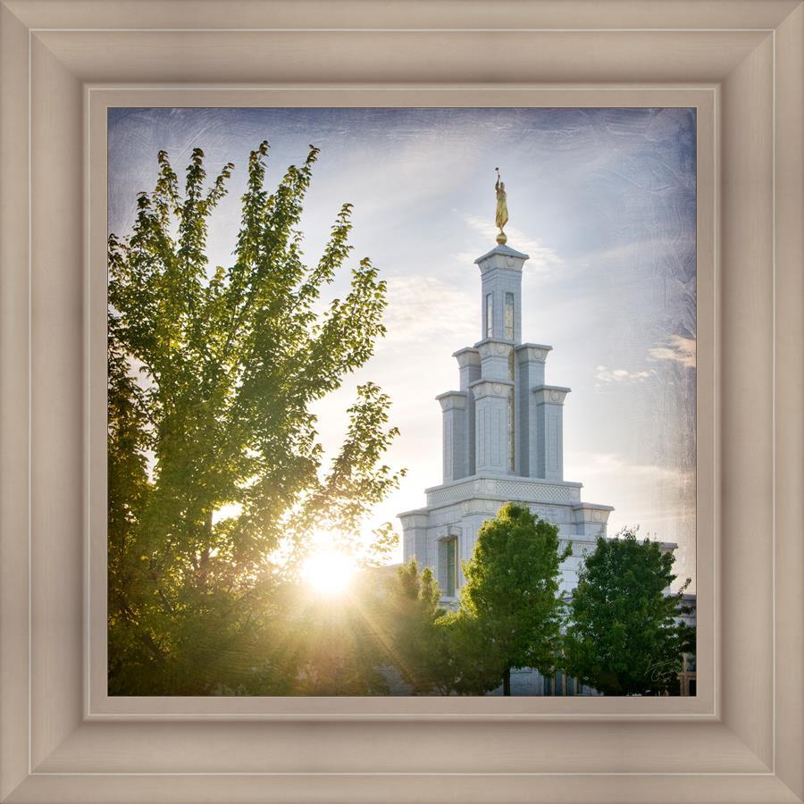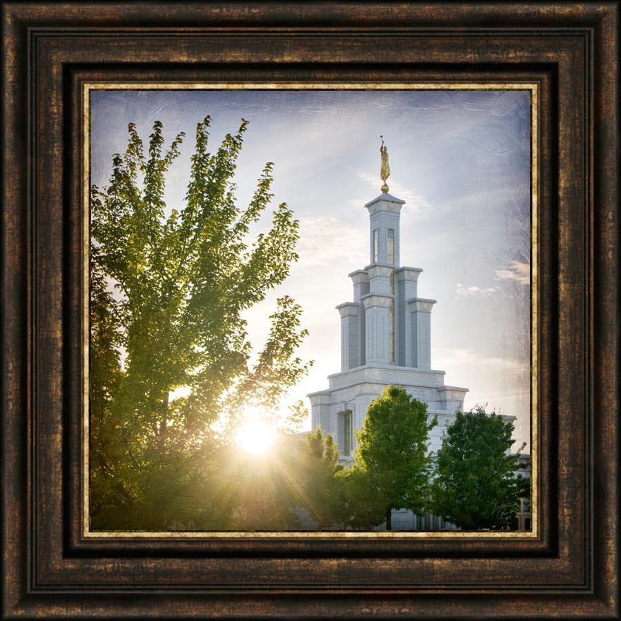 Since 1999 Landon has worked as an artisan in nearly 40 temples doing the decorative paint and gold leaf. He continues to do so as well as wood repair and graining. He was married in 2001 to Jacey Thomas in the Manti Utah temple. When she couldn’t find an image of the temple that she liked enough to purchase for their home, he decided to take one himself. That desire to create something original and different inspired his current series of temple art. They are taken from a panoramic viewpoint and stylized with an artistic border that reflect his paintings. All modern structures apart from the temple have been omitted.