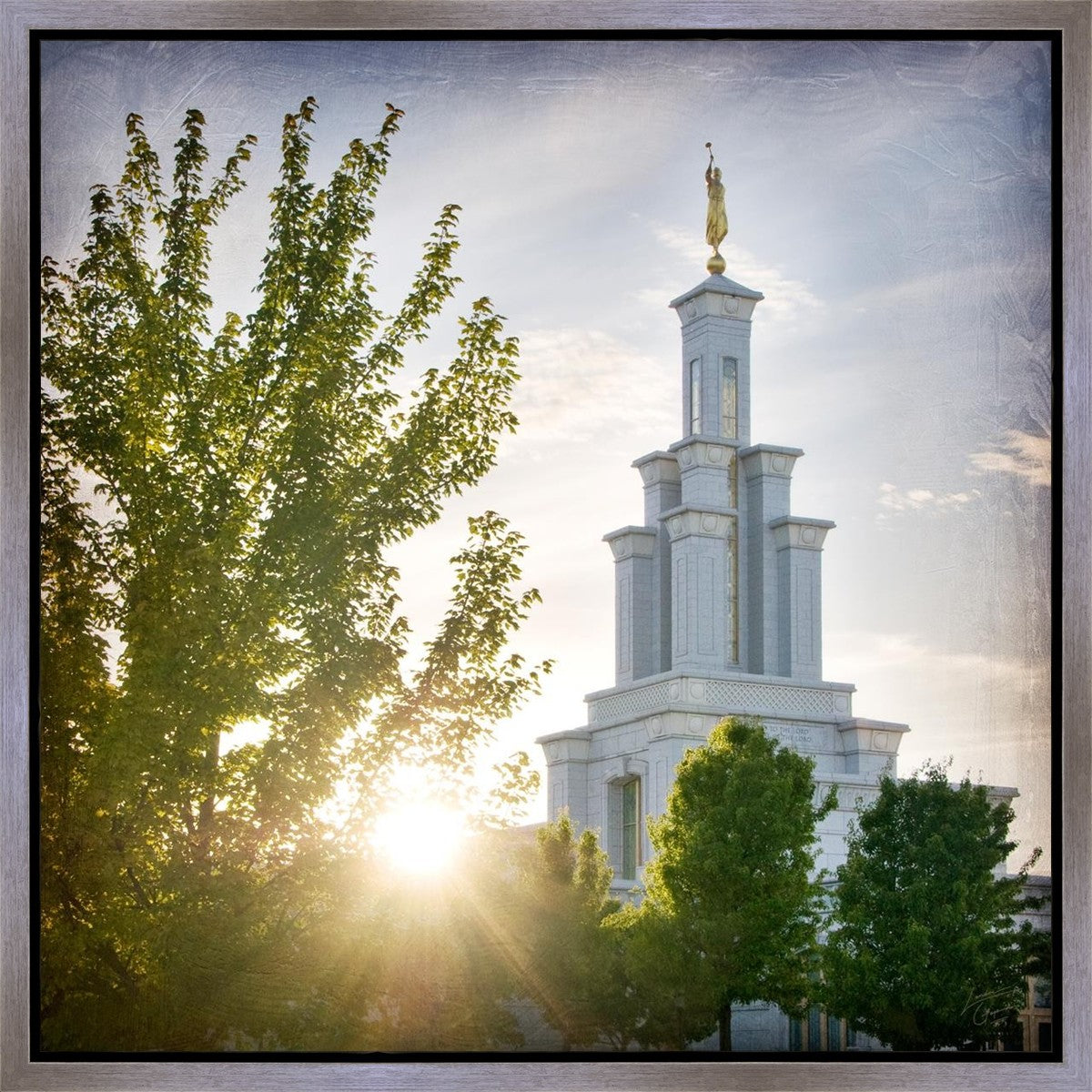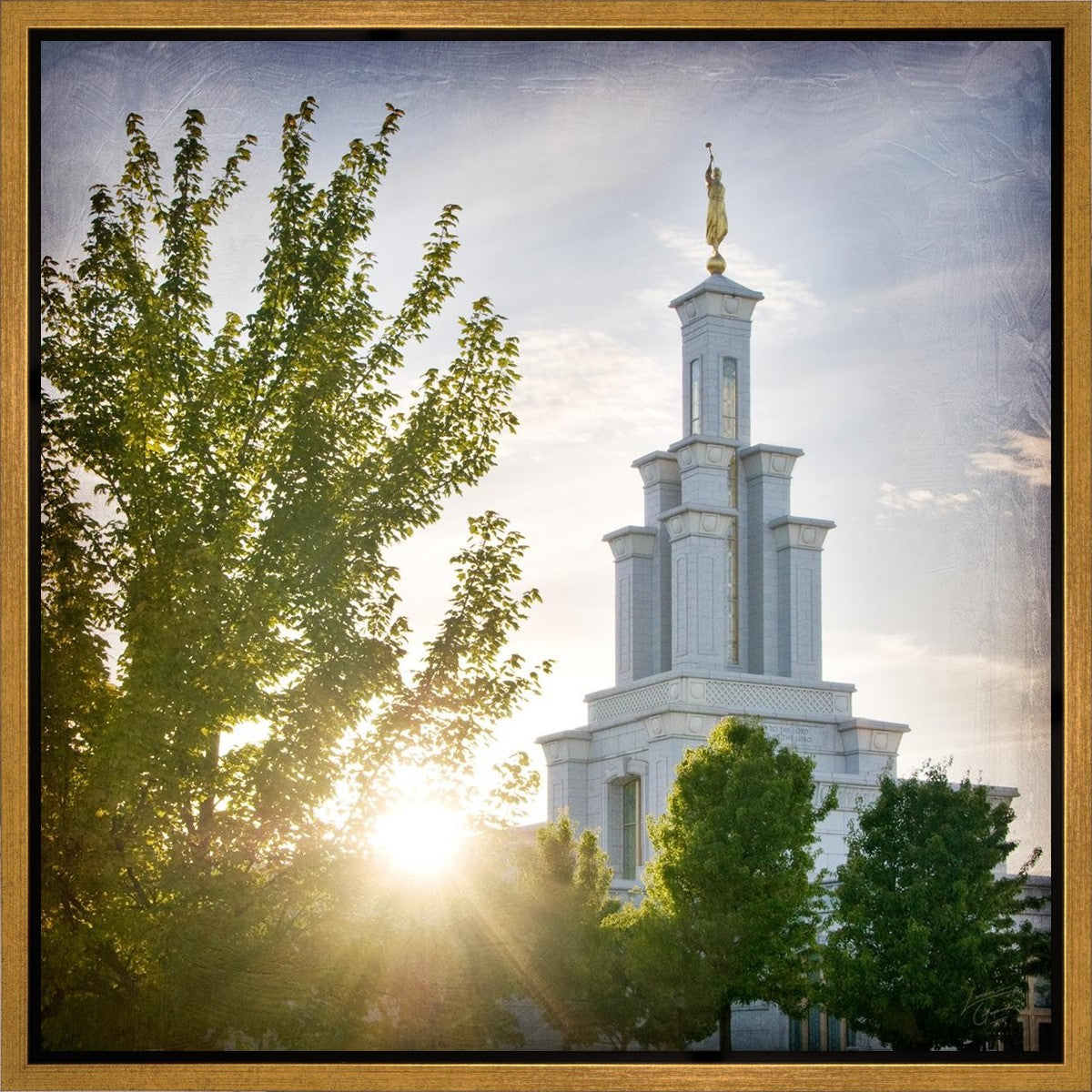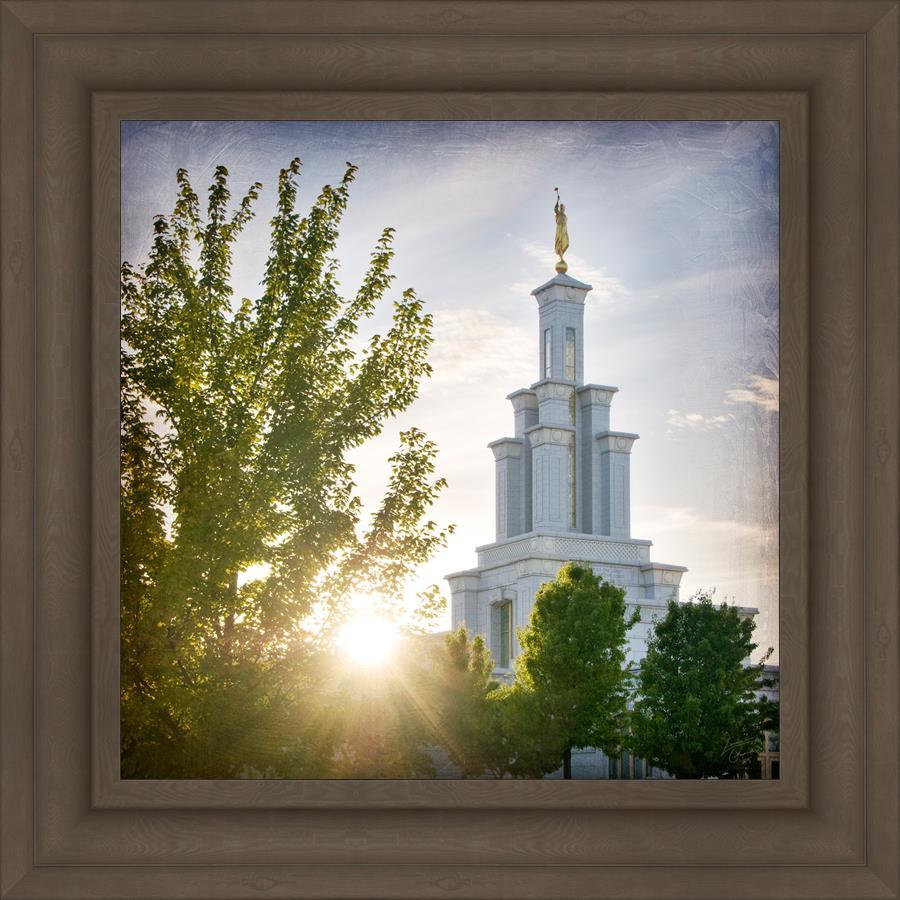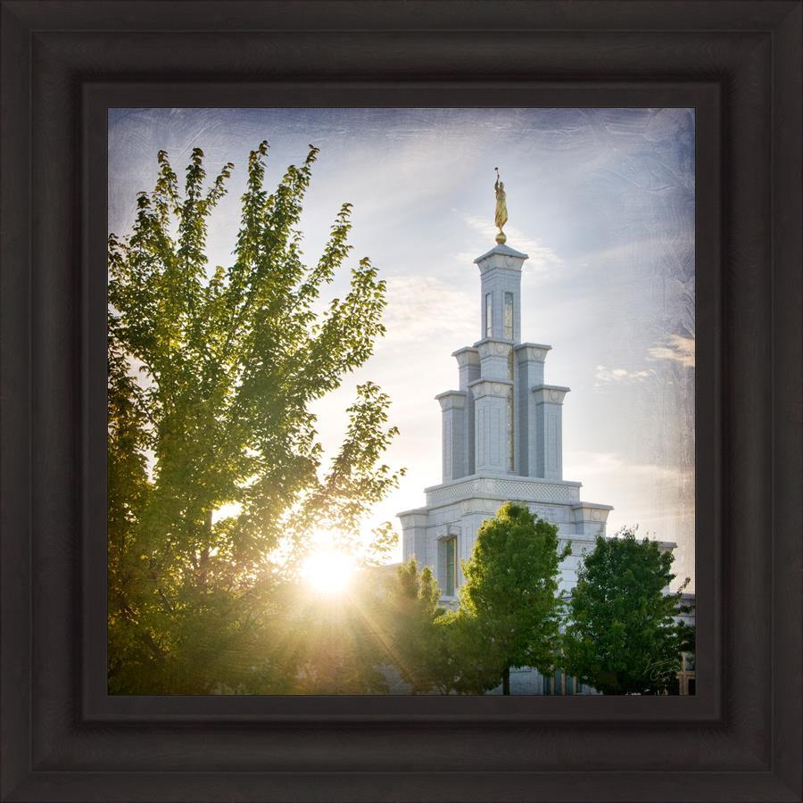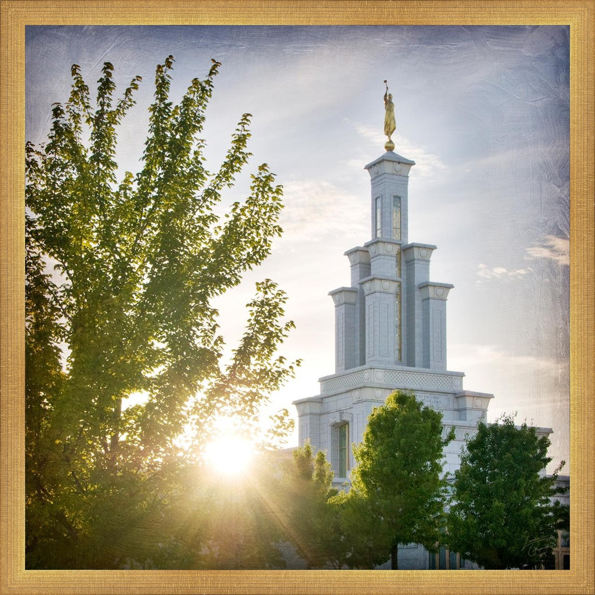 Since 1999 Landon has worked as an artisan in nearly 40 temples doing the decorative paint and gold leaf. He continues to do so as well as wood repair and graining. He was married in 2001 to Jacey Thomas in the Manti Utah temple. When she couldn’t find an image of the temple that she liked enough to purchase for their home, he decided to take one himself. That desire to create something original and different inspired his current series of temple art. They are taken from a panoramic viewpoint and stylized with an artistic border that reflect his paintings. All modern structures apart from the temple have been omitted.