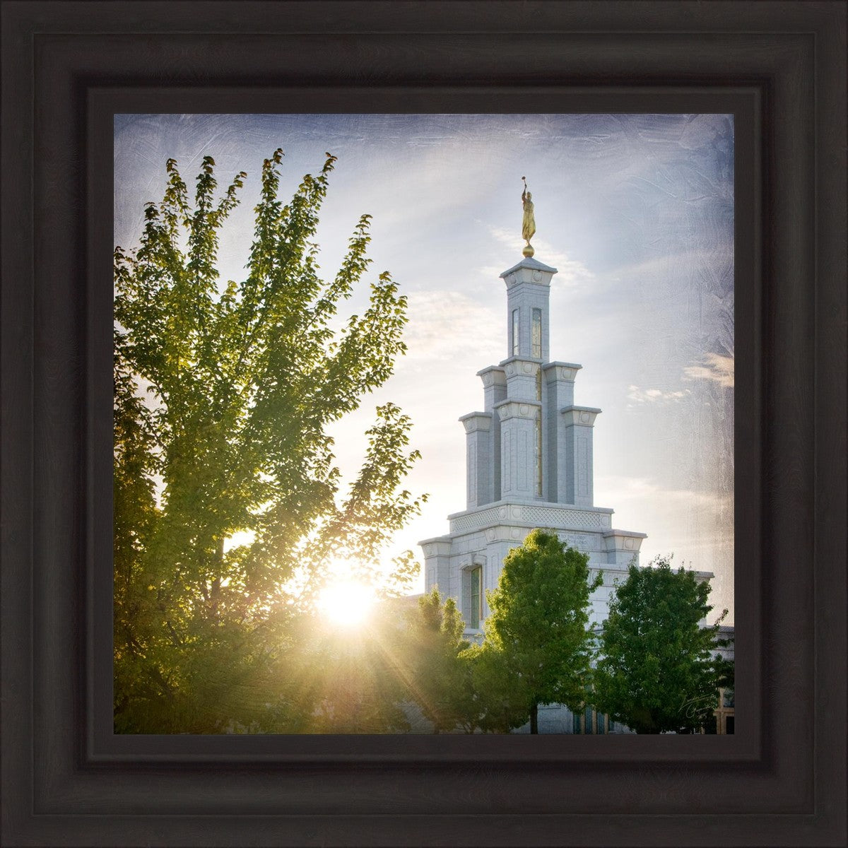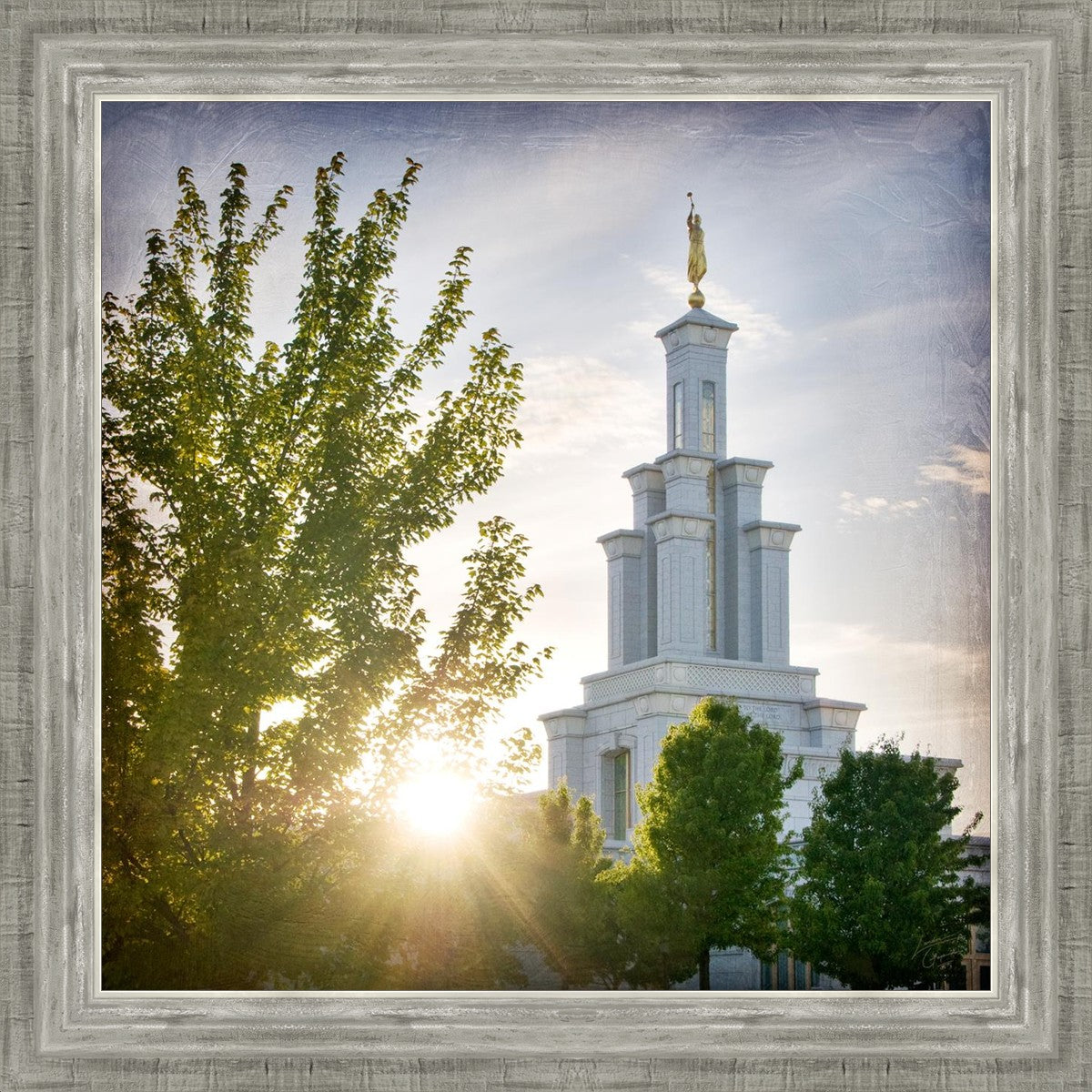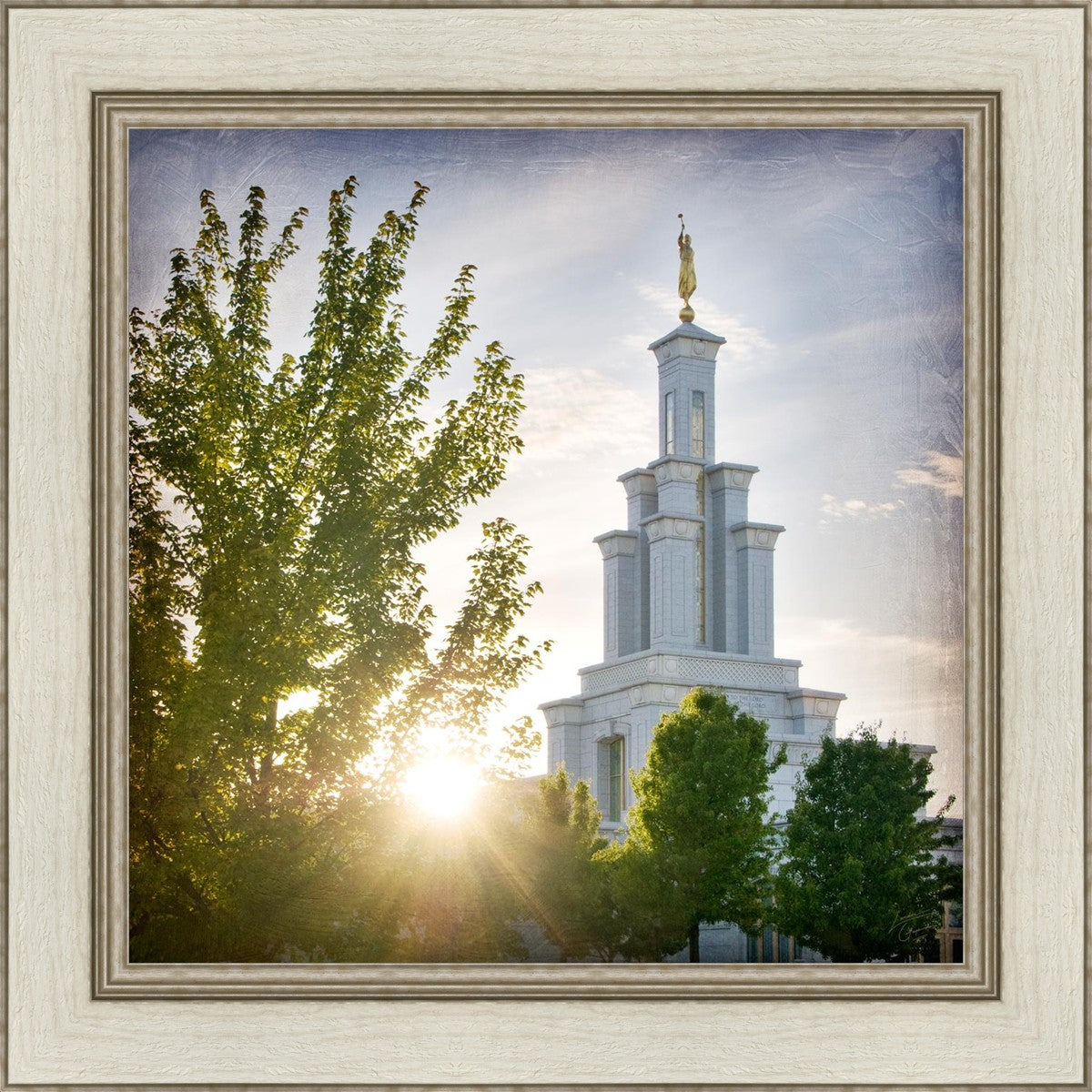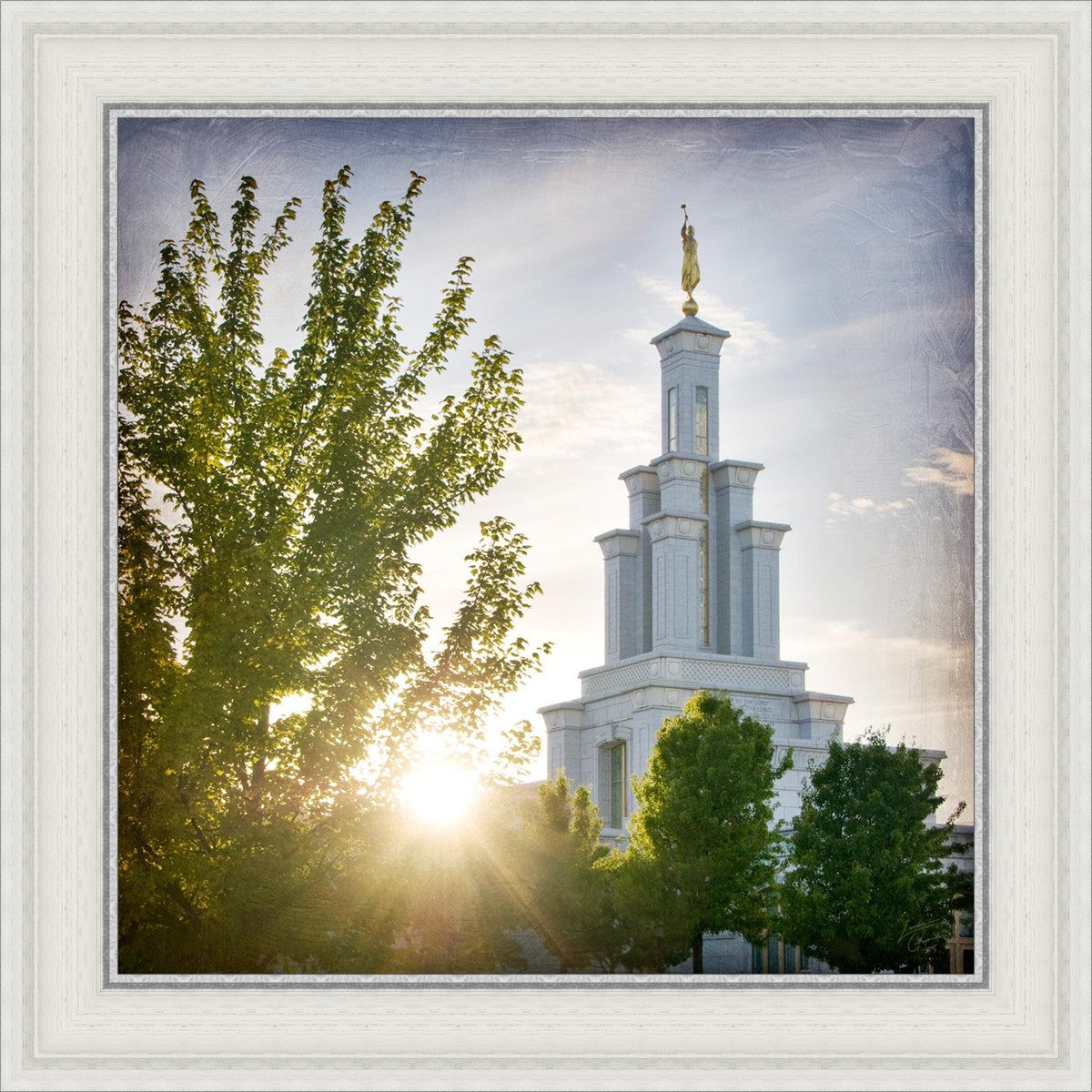 Since 1999 Landon has worked as an artisan in nearly 40 temples doing the decorative paint and gold leaf. He continues to do so as well as wood repair and graining. He was married in 2001 to Jacey Thomas in the Manti Utah temple. When she couldn’t find an image of the temple that she liked enough to purchase for their home, he decided to take one himself. That desire to create something original and different inspired his current series of temple art. They are taken from a panoramic viewpoint and stylized with an artistic border that reflect his paintings. All modern structures apart from the temple have been omitted.