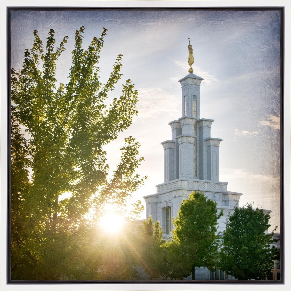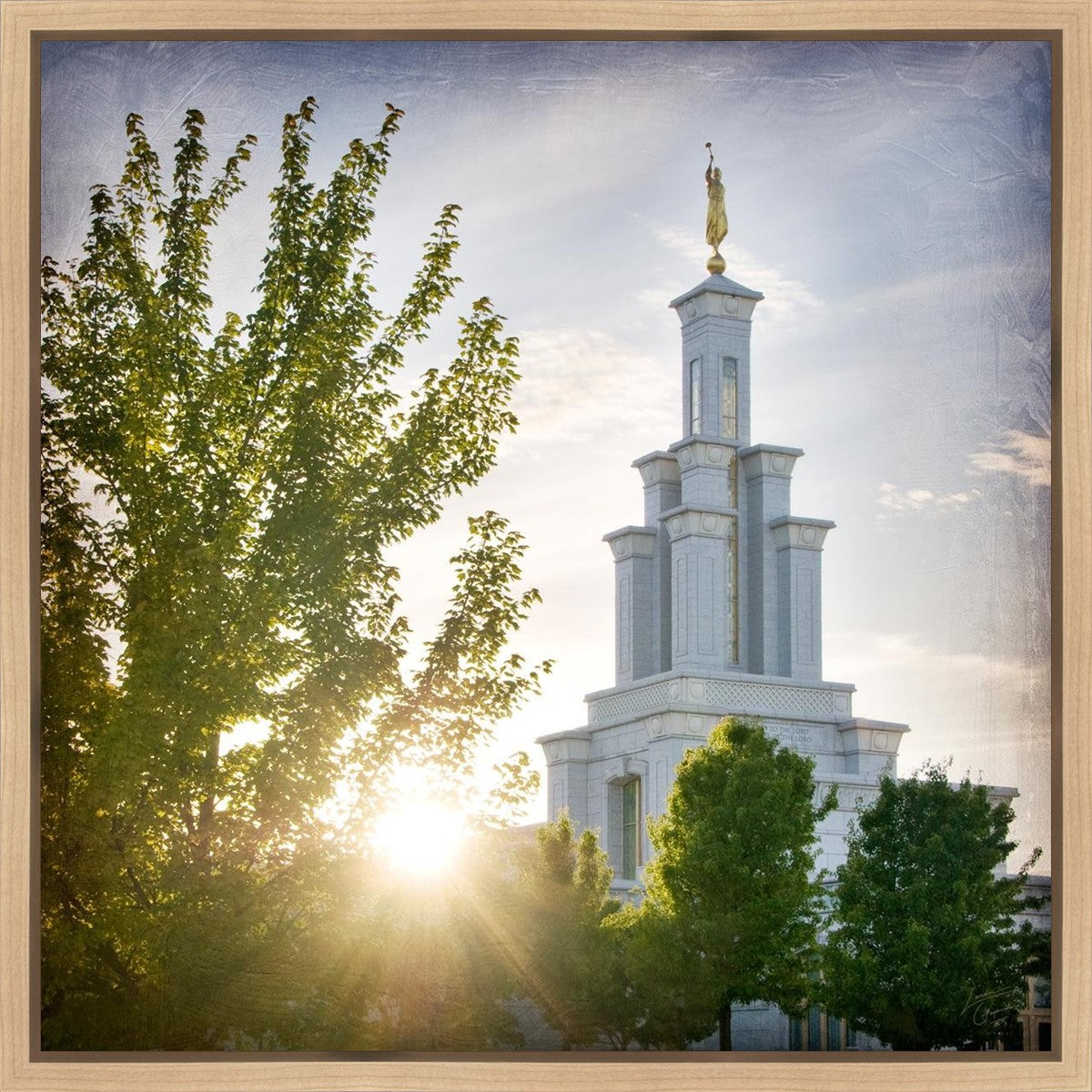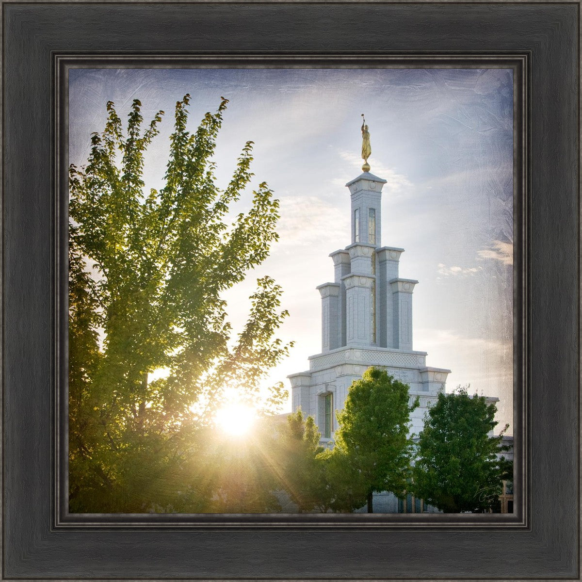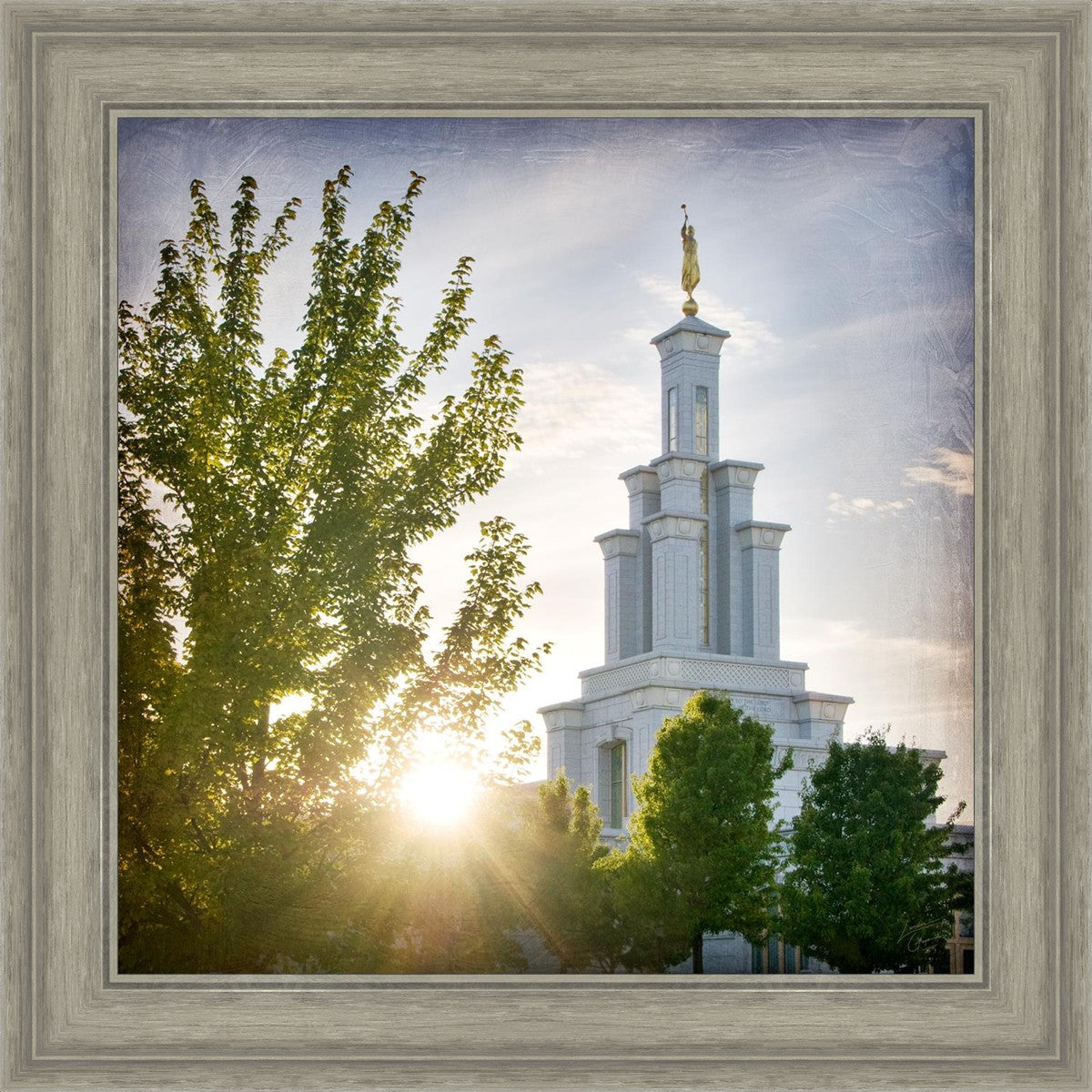 Since 1999 Landon has worked as an artisan in nearly 40 temples doing the decorative paint and gold leaf. He continues to do so as well as wood repair and graining. He was married in 2001 to Jacey Thomas in the Manti Utah temple. When she couldn’t find an image of the temple that she liked enough to purchase for their home, he decided to take one himself. That desire to create something original and different inspired his current series of temple art. They are taken from a panoramic viewpoint and stylized with an artistic border that reflect his paintings. All modern structures apart from the temple have been omitted.