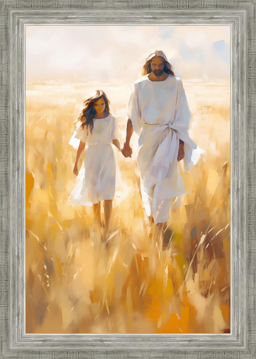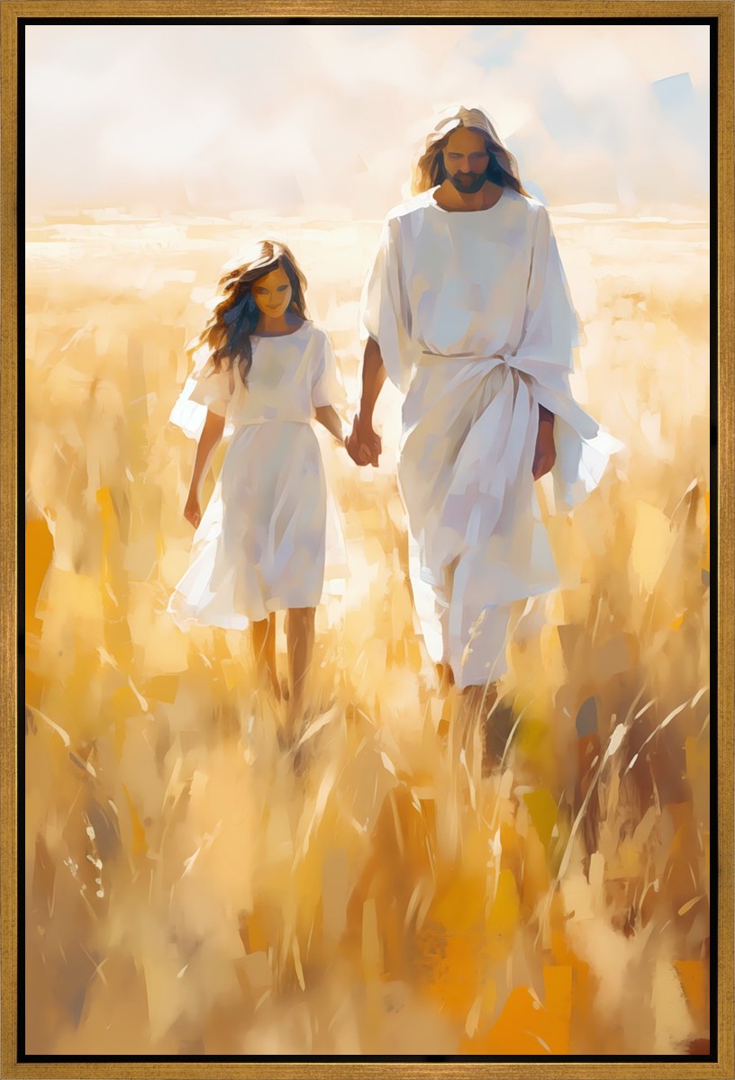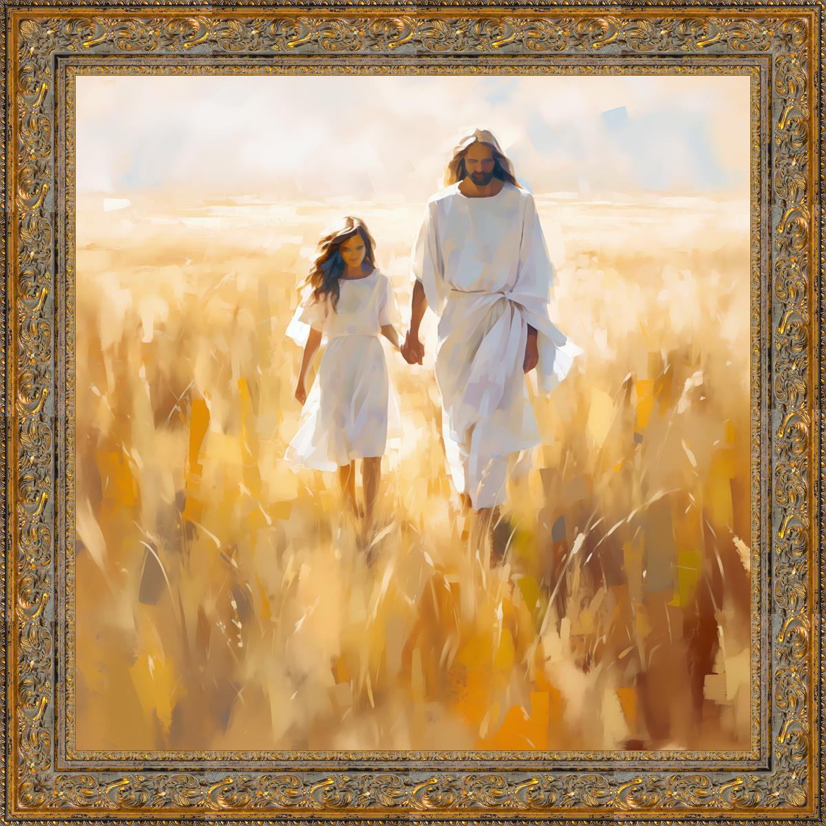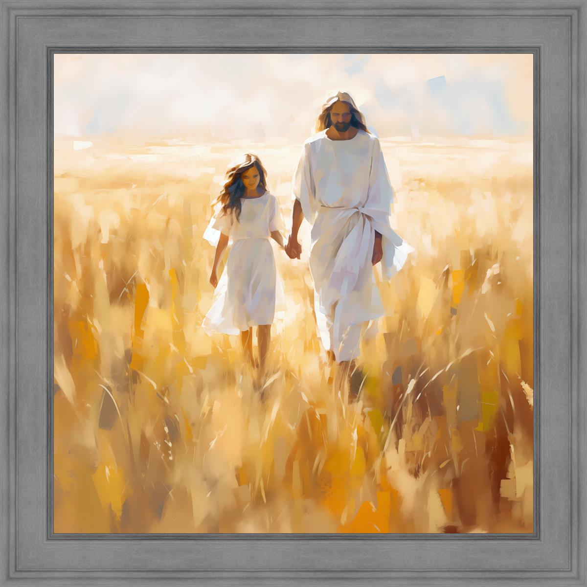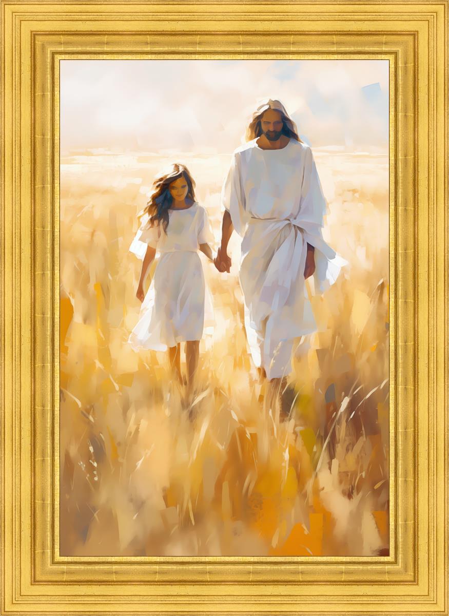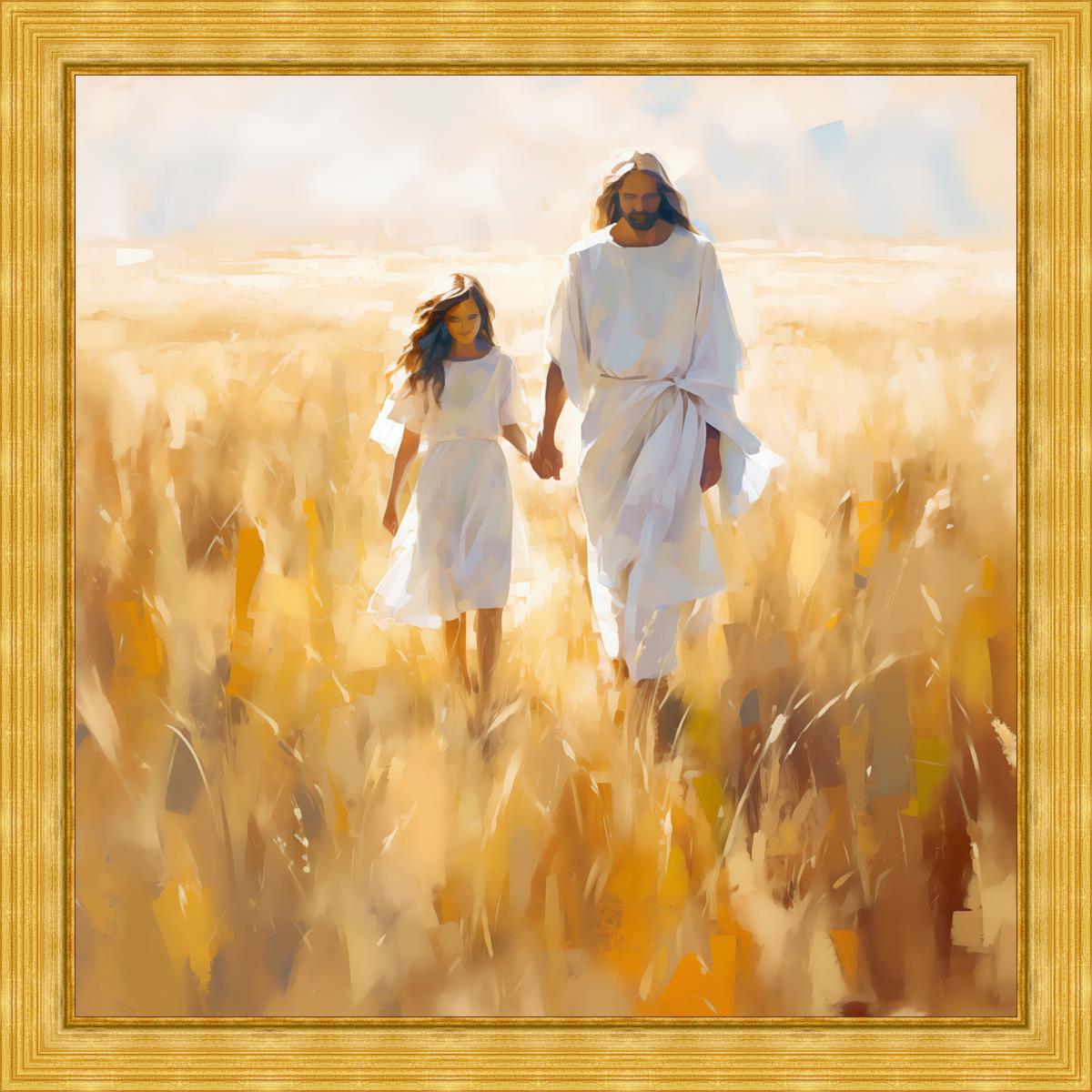 This piece was meant to be more abstract with a modern look. I love the bright golden field that reminds us of the beauty we are striving towards in our lives and the lives afterward. A walk with Christ produces that beauty and will eternally propel that beauty into the next life.