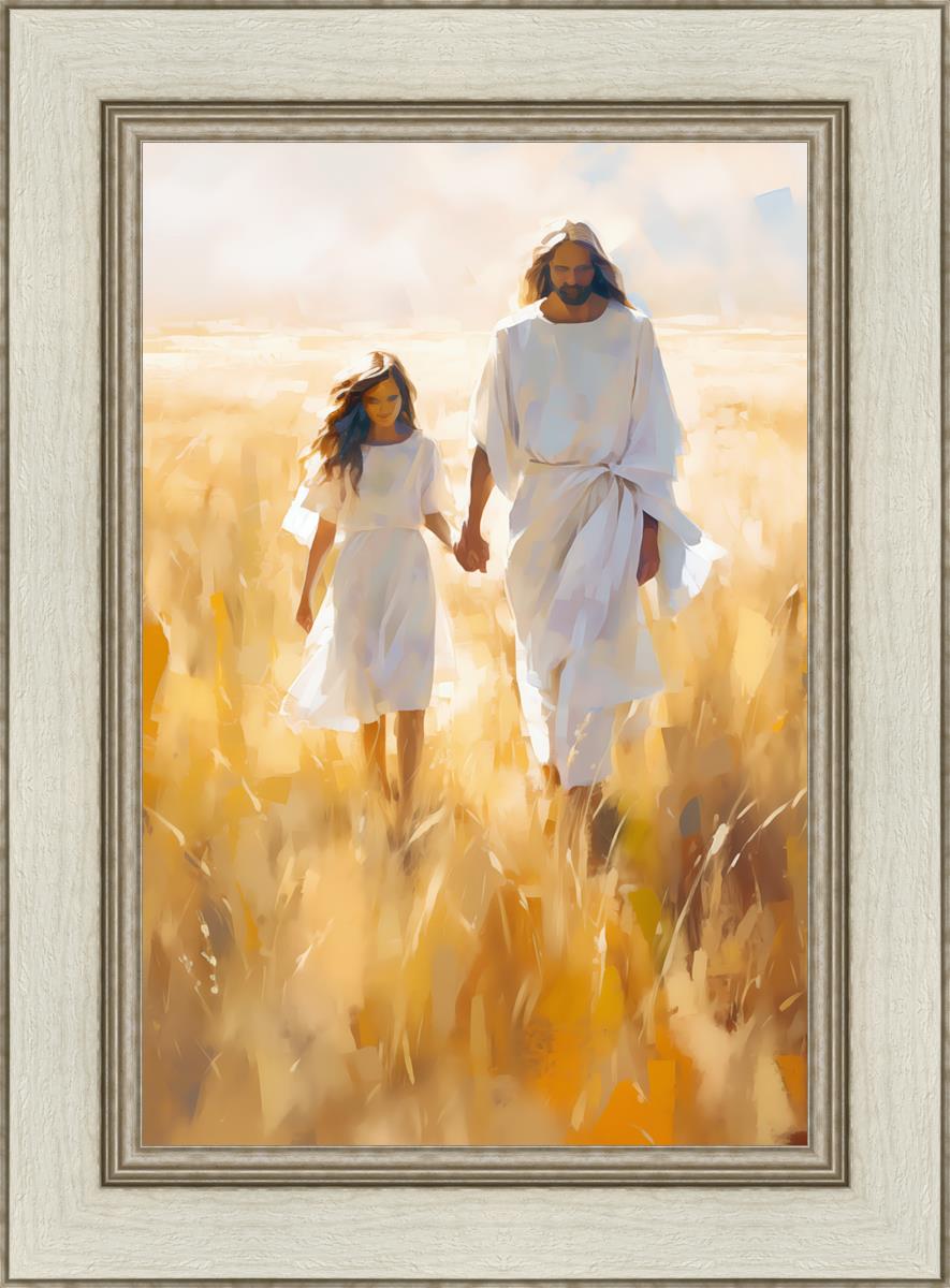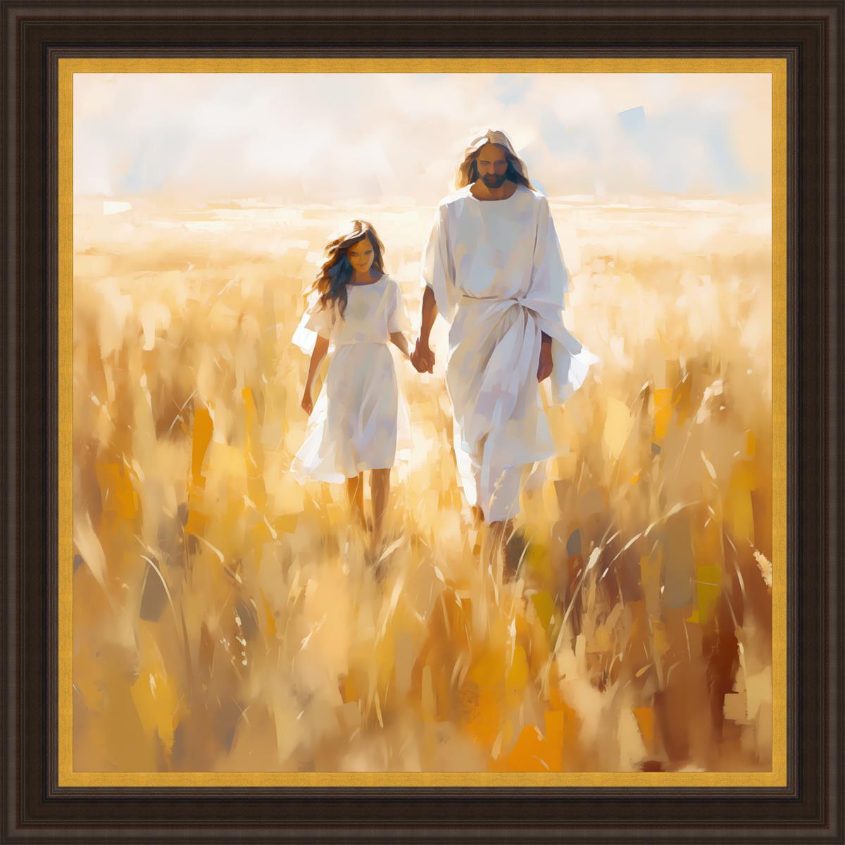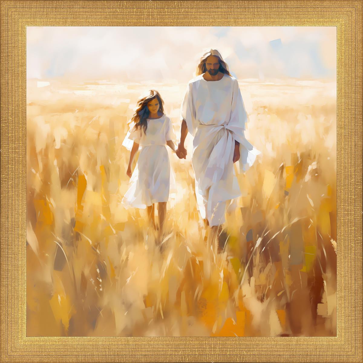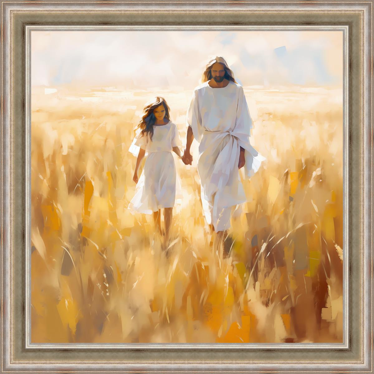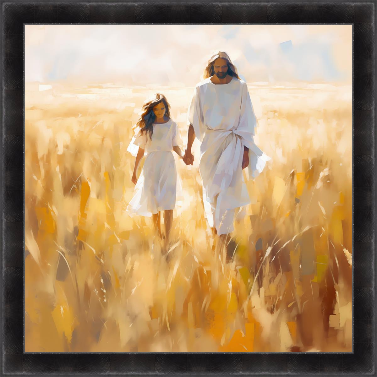 This piece was meant to be more abstract with a modern look. I love the bright golden field that reminds us of the beauty we are striving towards in our lives and the lives afterward. A walk with Christ produces that beauty and will eternally propel that beauty into the next life.