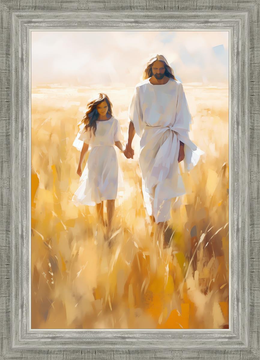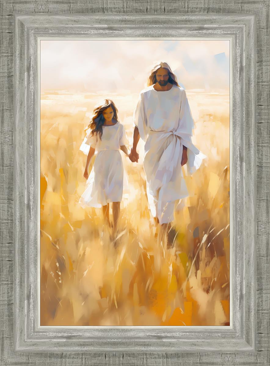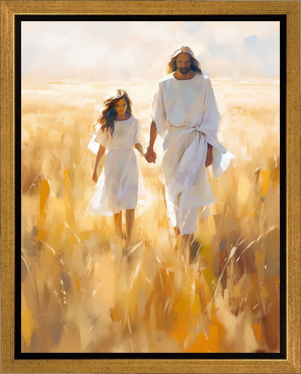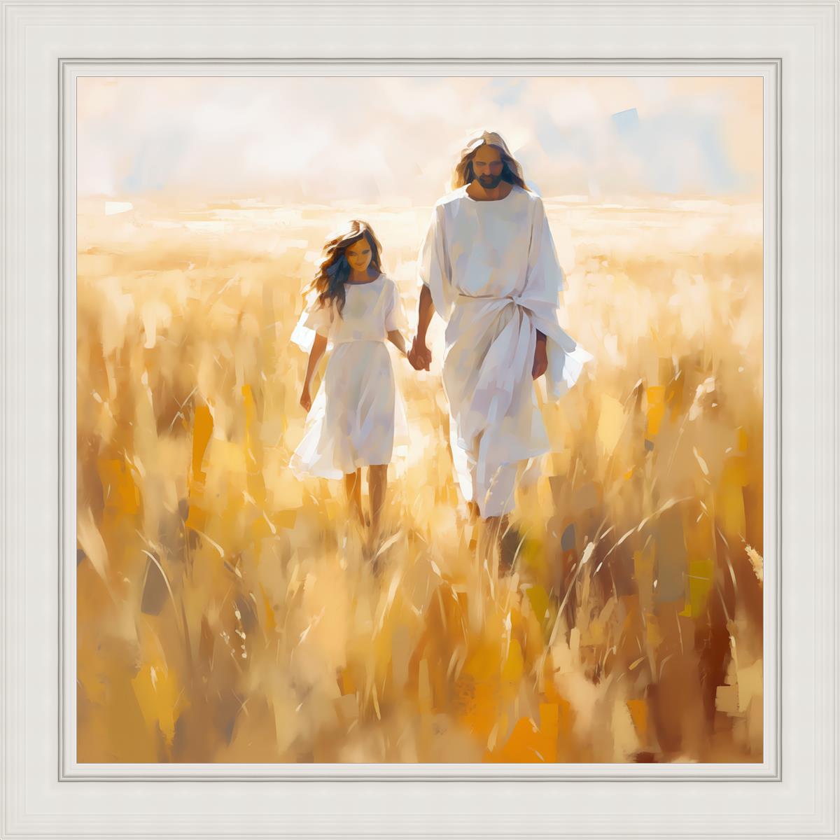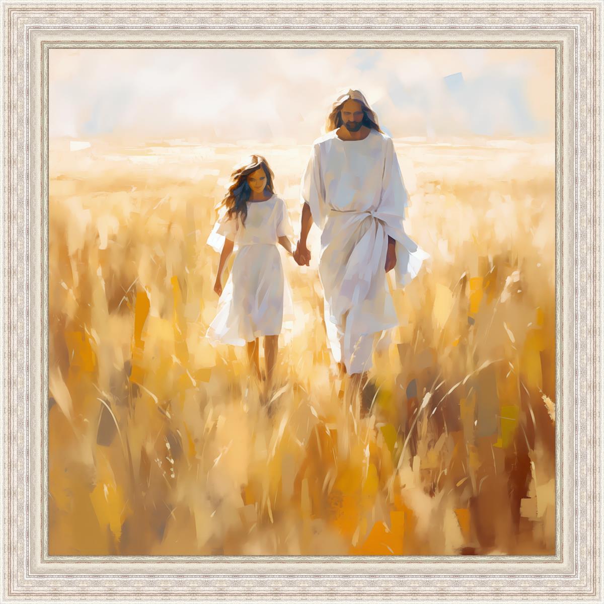 This piece was meant to be more abstract with a modern look. I love the bright golden field that reminds us of the beauty we are striving towards in our lives and the lives afterward. A walk with Christ produces that beauty and will eternally propel that beauty into the next life.