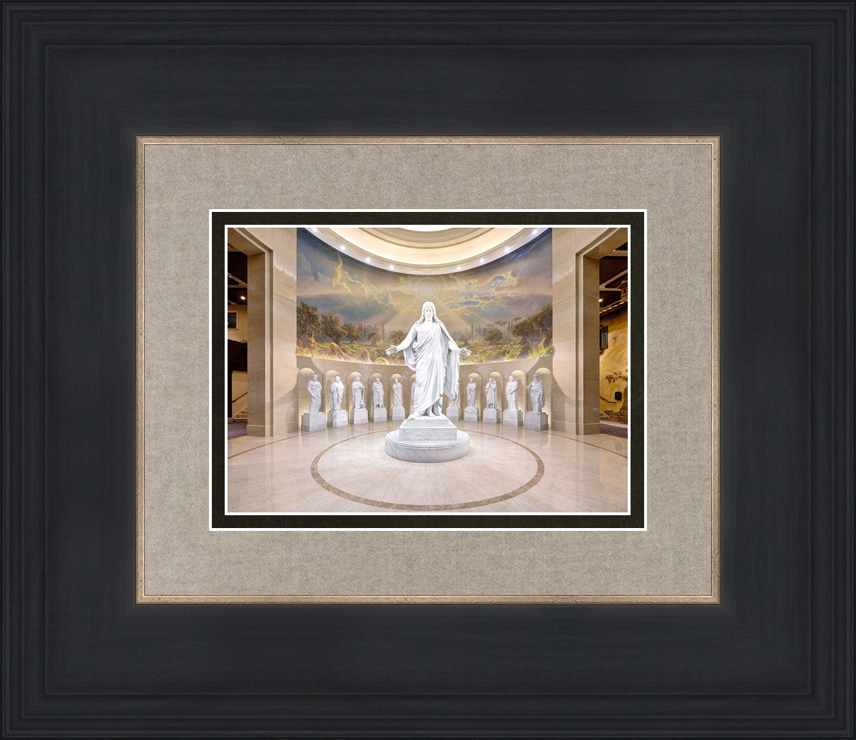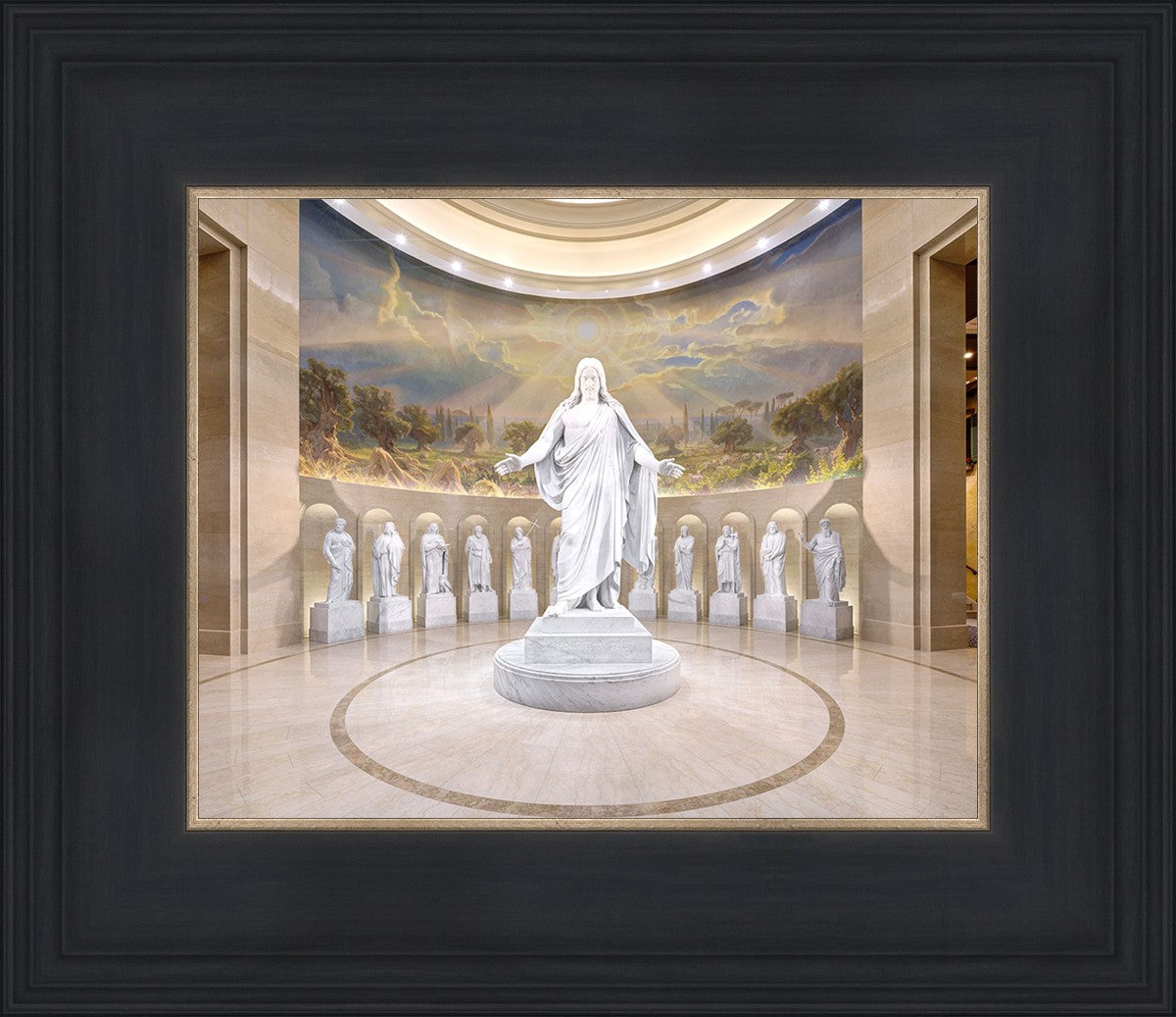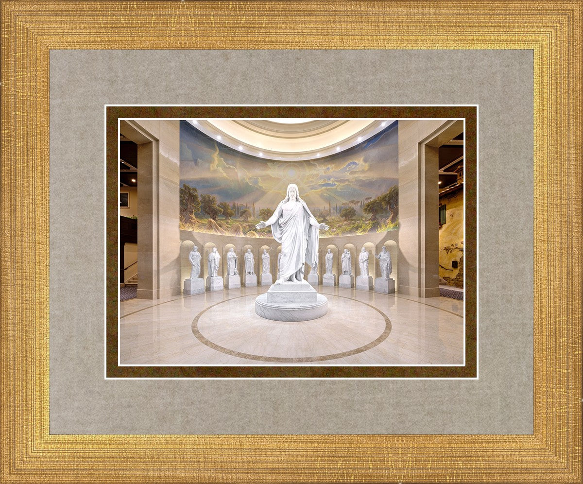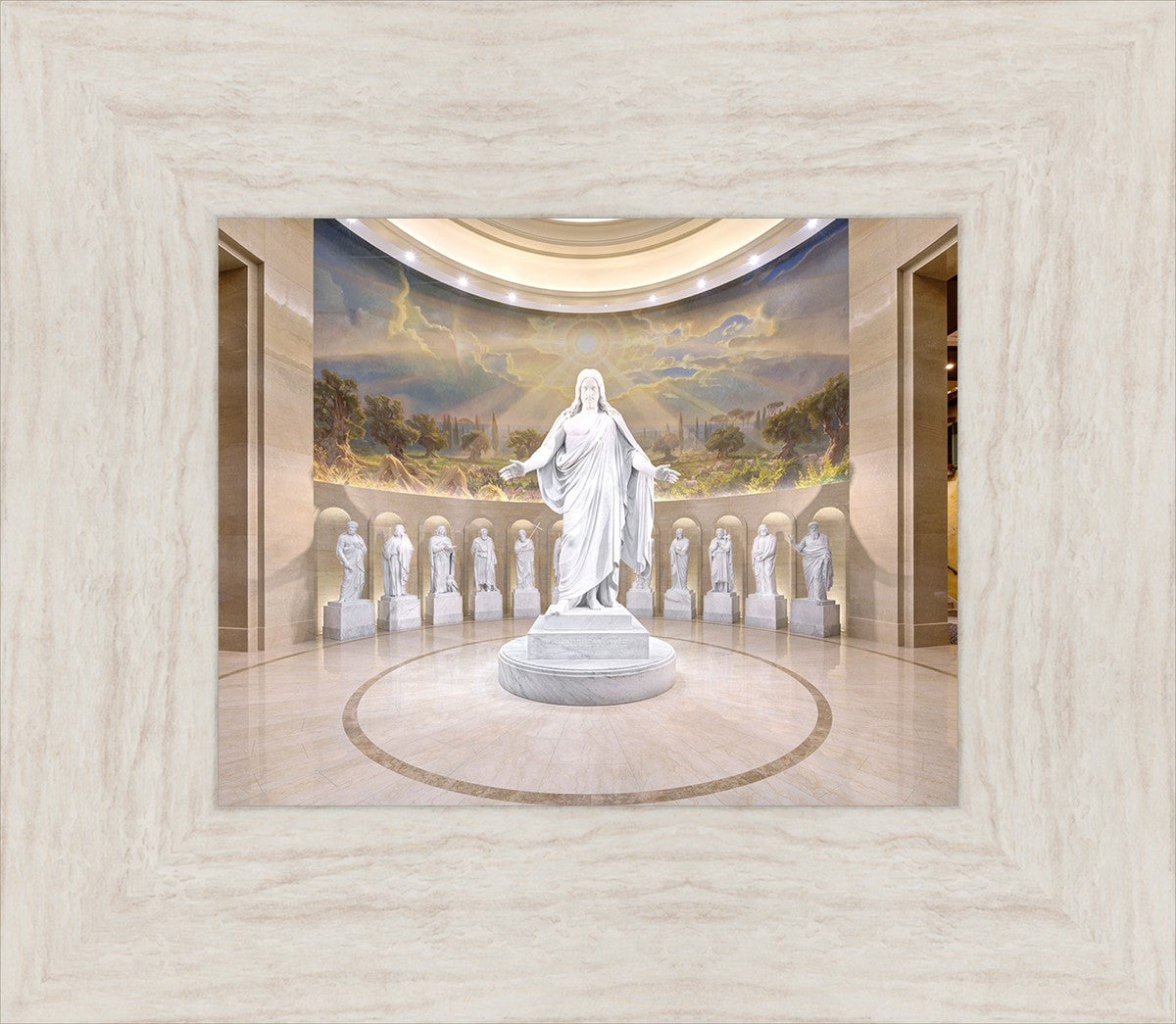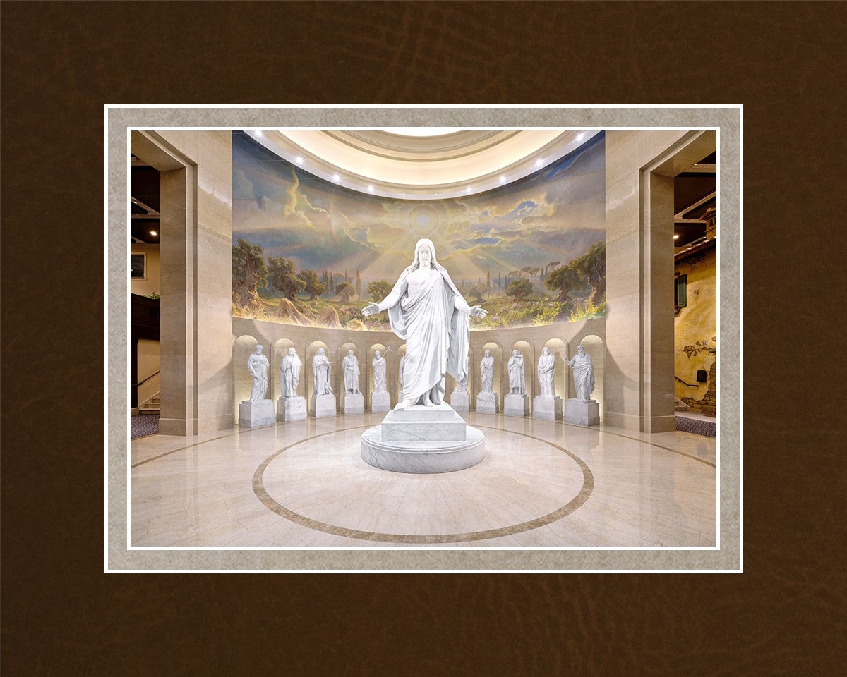 This is the Christus statue found in the Rome Temple Visitor's Center. In the background, statues can be found of each of the 12 disciples.