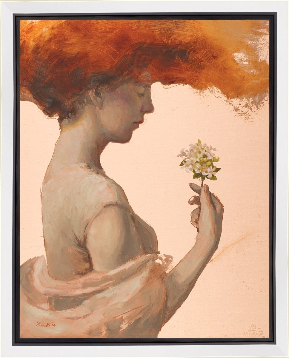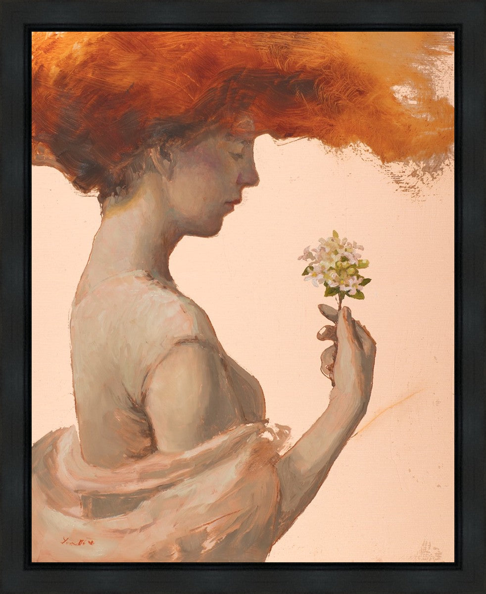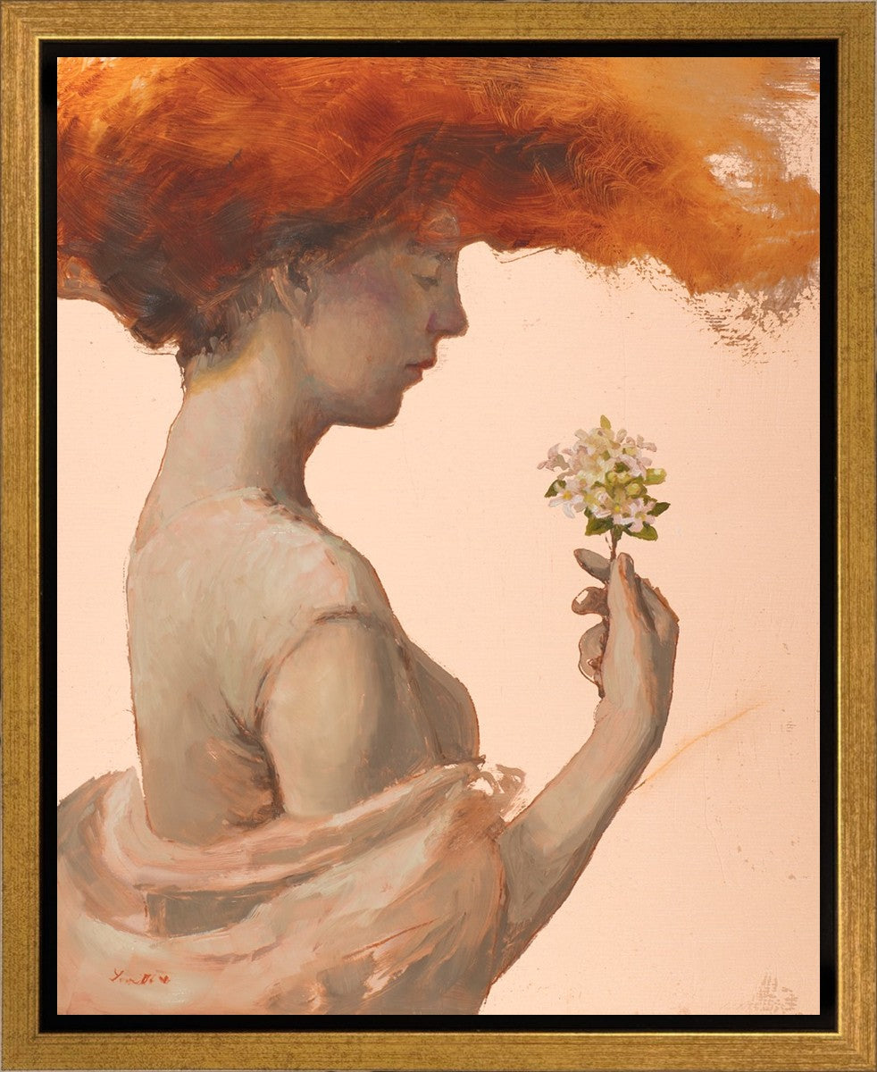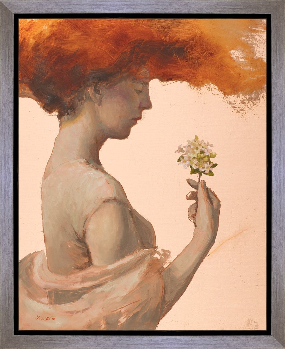 In order to believe in a loving God, I have been forced to grapple with the complex paradox of the existence of divine love and the presence of evil, death, and sin. The jasmine flowers in this painting represent the love of God, and the woman directs her attention to them. The fragile blooms are contrasted with her red hair which resembles fire and represents the Holy Spirit and a refiners fire.