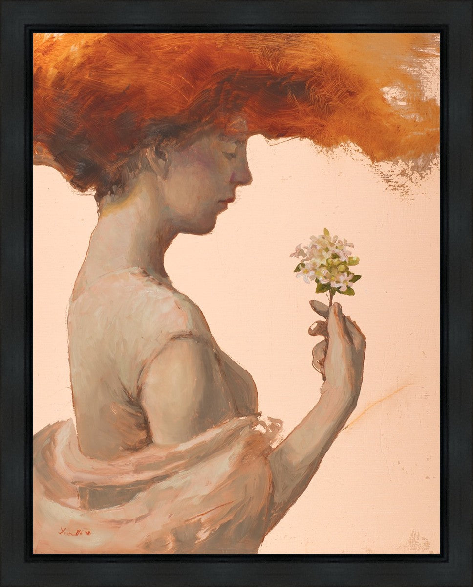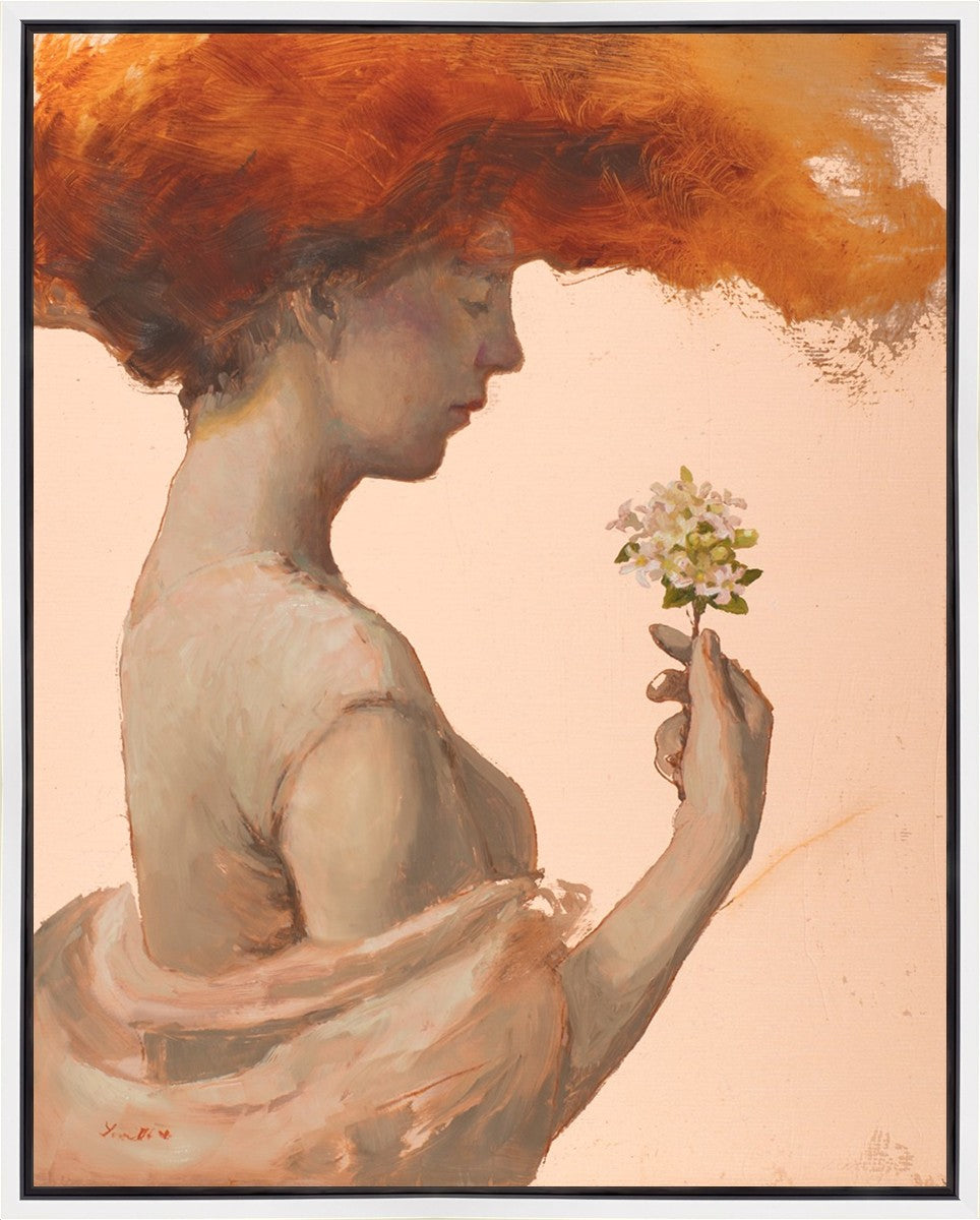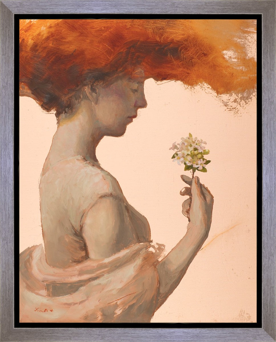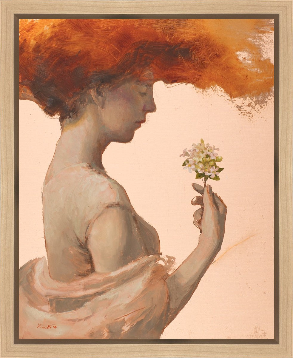 In order to believe in a loving God, I have been forced to grapple with the complex paradox of the existence of divine love and the presence of evil, death, and sin. The jasmine flowers in this painting represent the love of God, and the woman directs her attention to them. The fragile blooms are contrasted with her red hair which resembles fire and represents the Holy Spirit and a refiners fire.