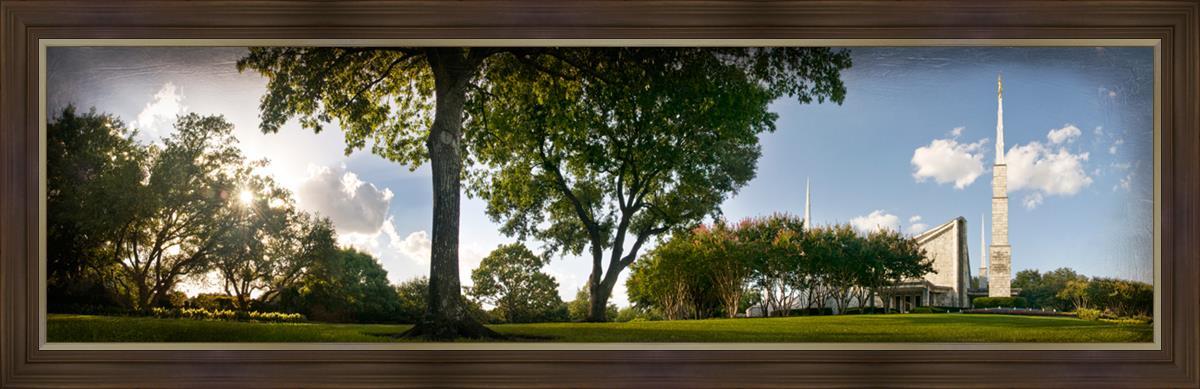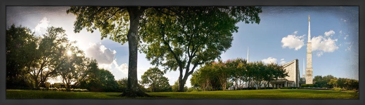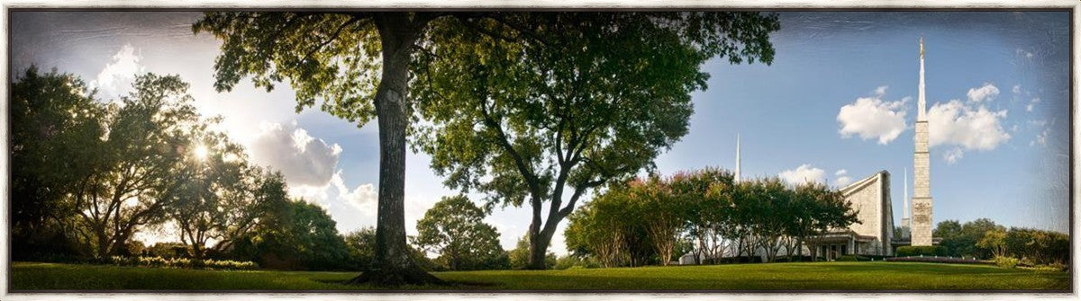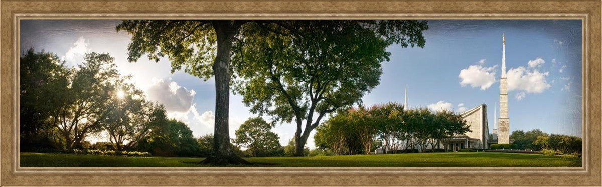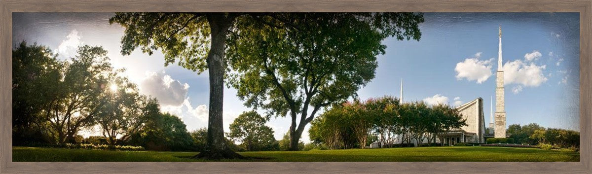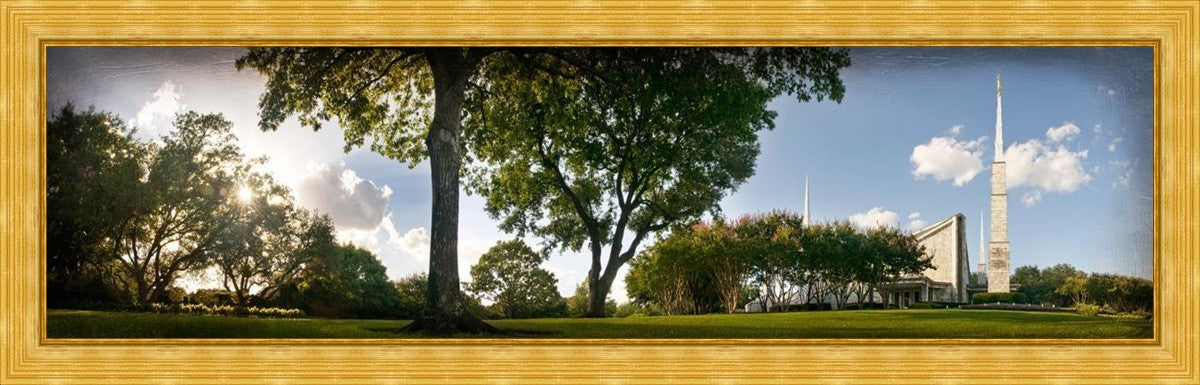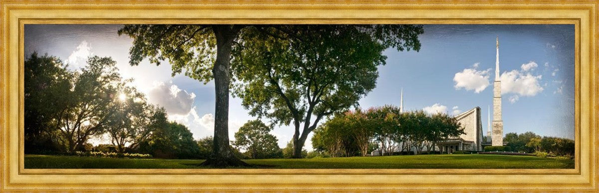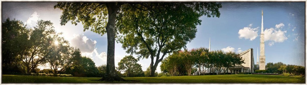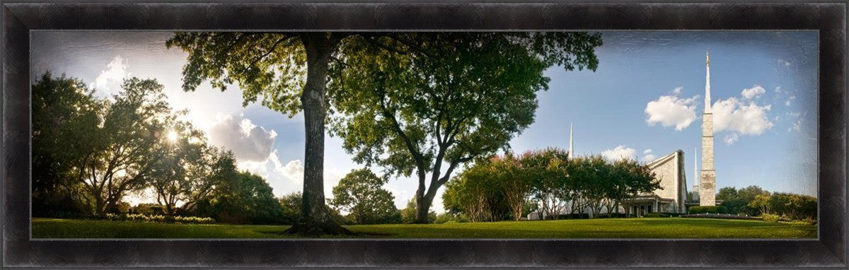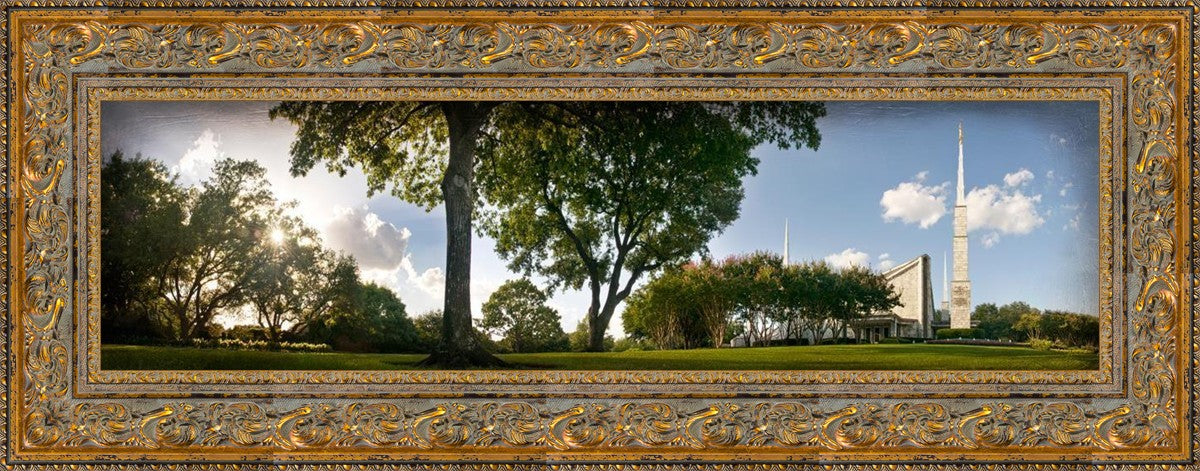Since 1999 Landon has worked as an artisan in nearly 40 temples doing the decorative paint and gold leaf. He continues to do so as well as wood repair and graining. He was married in 2001 to Jacey Thomas in the Manti Utah temple. When she couldn’t find an image of the temple that she liked enough to purchase for their home, he decided to take one himself. That desire to create something original and different inspired his current series of temple art. They are taken from a panoramic viewpoint and stylized with an artistic border that reflect his paintings. All modern structures apart from the temple have been omitted.