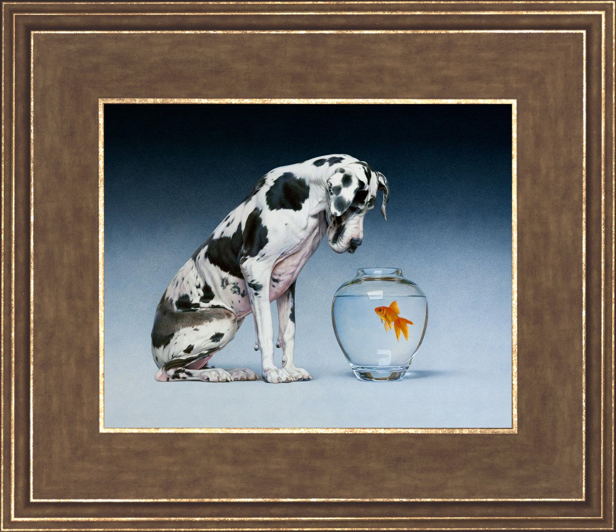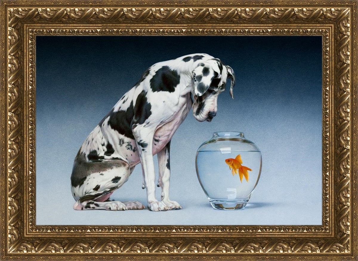 For Dane and Fish Chris chose to replace the Greyhound with a Great Dane for the juxtaposition and impact of both size and color. Not only are we attracted to the work by the stunning visual he has created, but also by the fact that we see a little bit of ourselves in this encounter.
