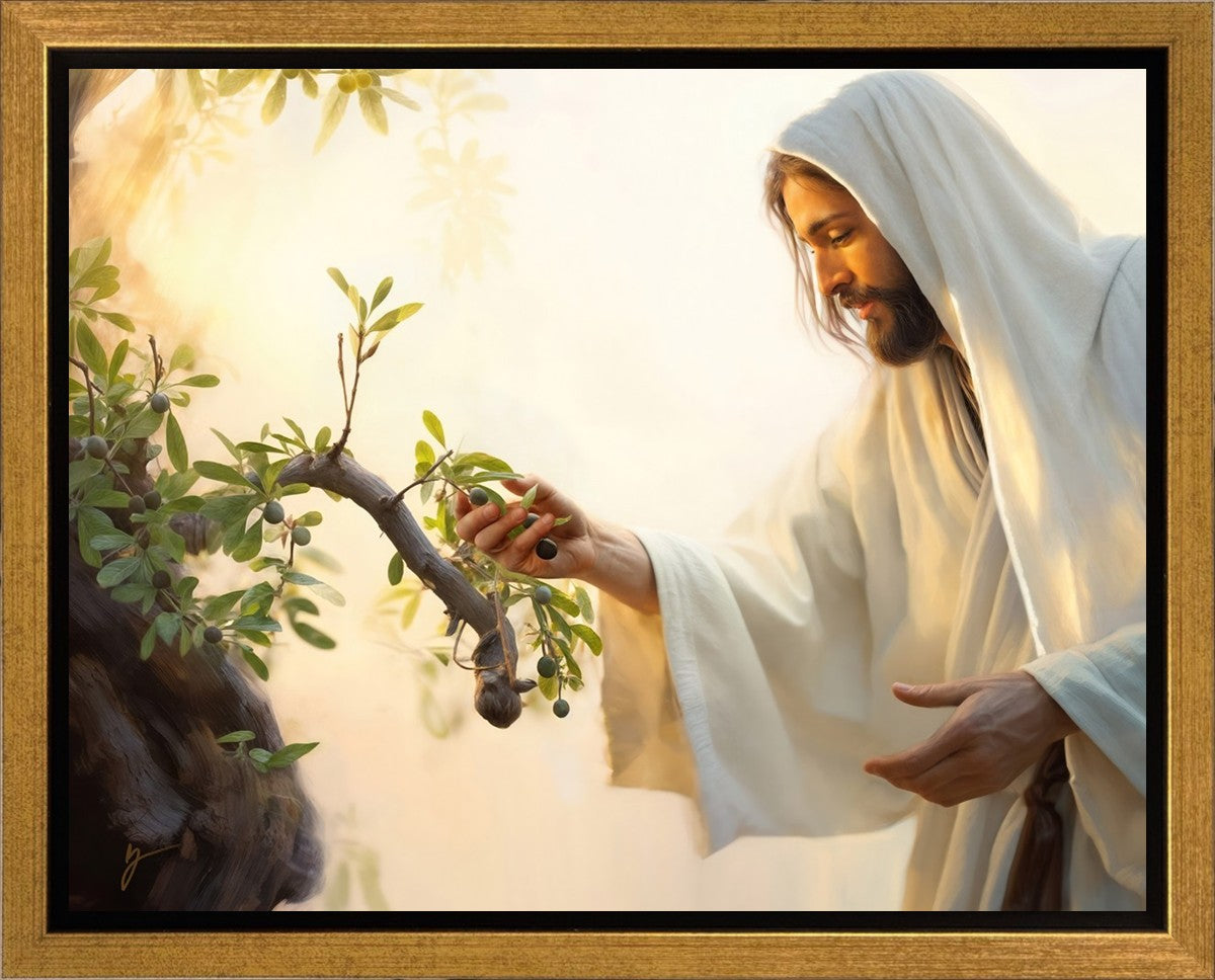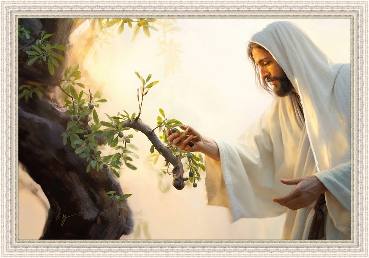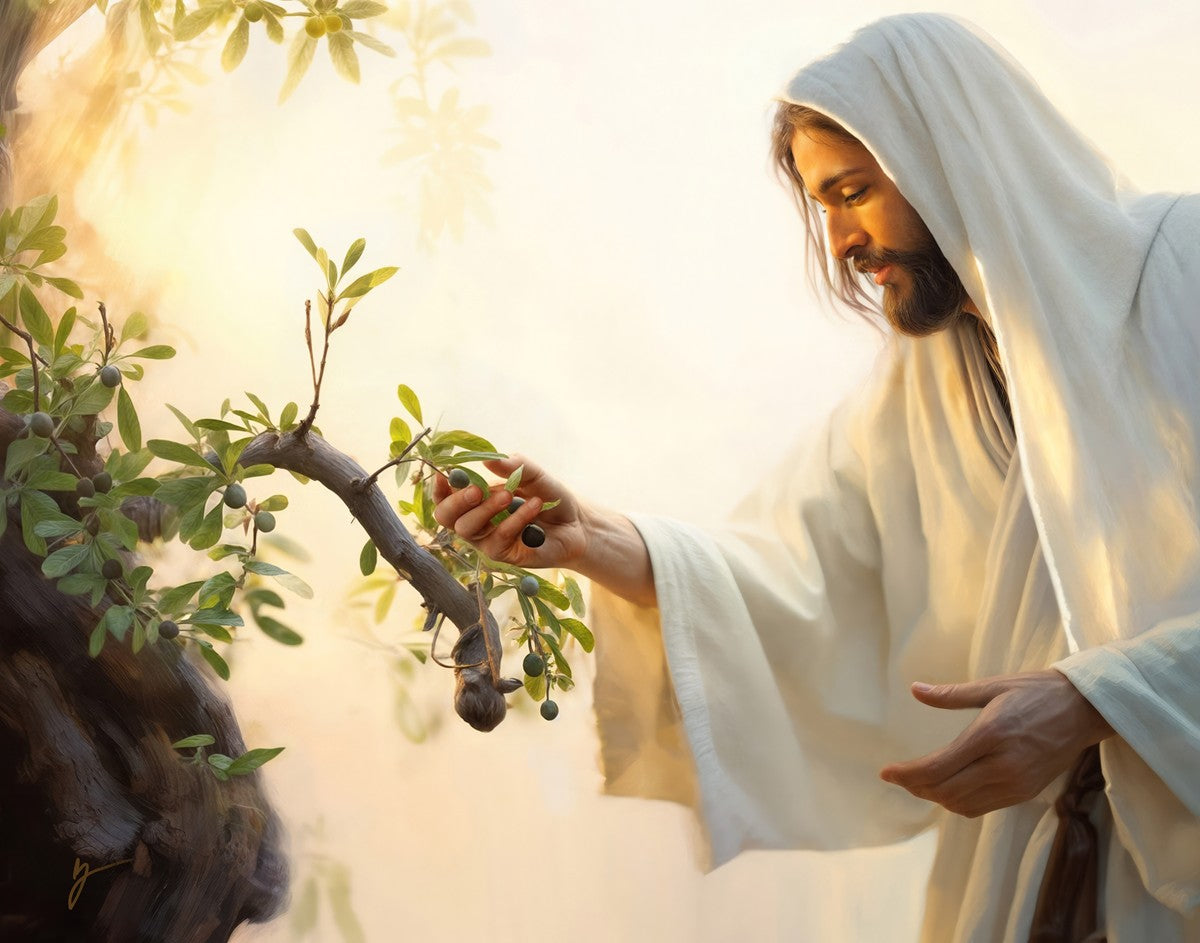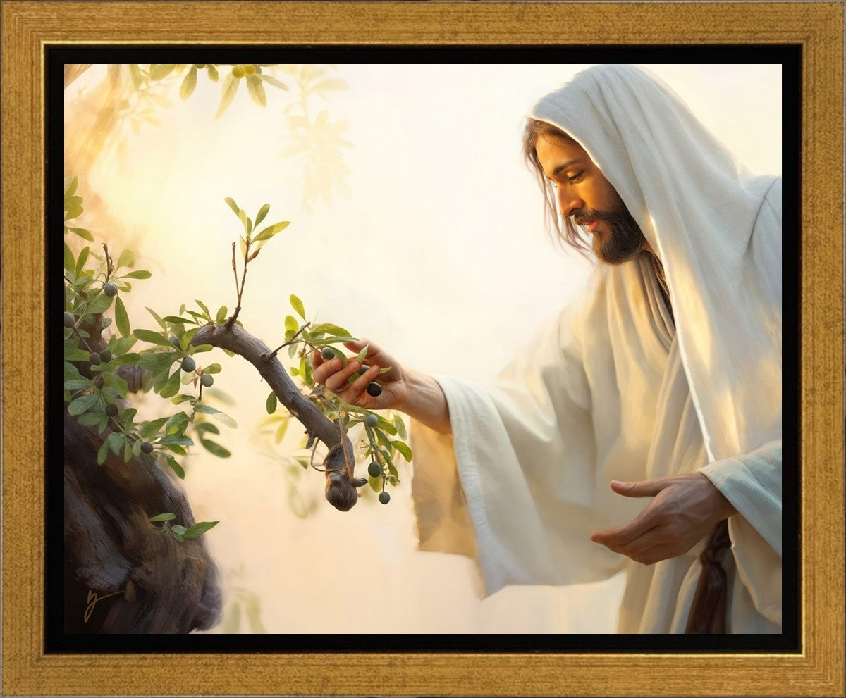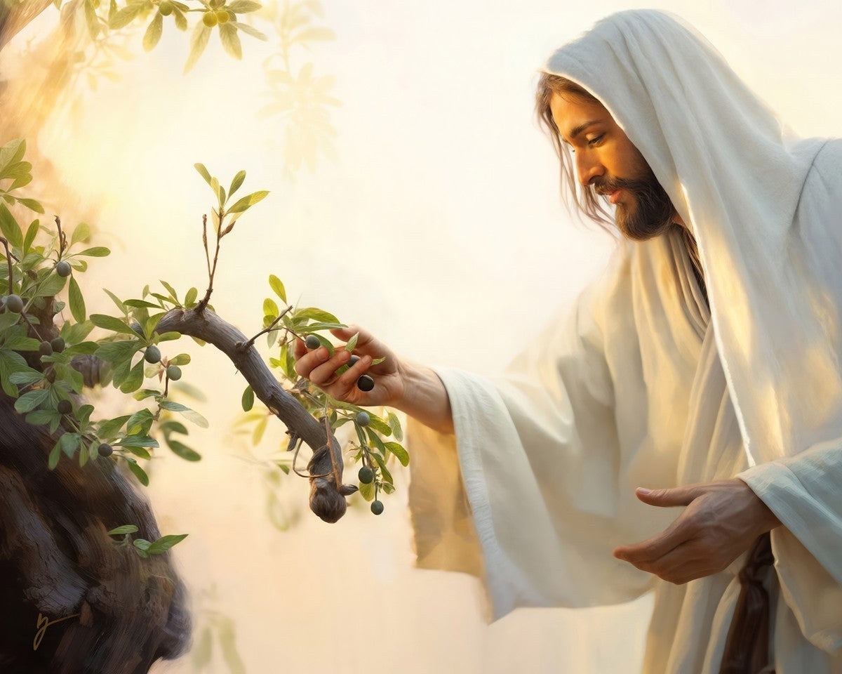 In this captivating moment, Jesus gathers olives from the branches, each fruit representing a soul chosen to be gathered unto Him. The radiant sun heralds the arrival of a new day, symbolizing the dawn of the final harvest where faithful saints are gathered in with the Lord. His head is veiled, a sign of His humility and devotion to the sacred task at hand.