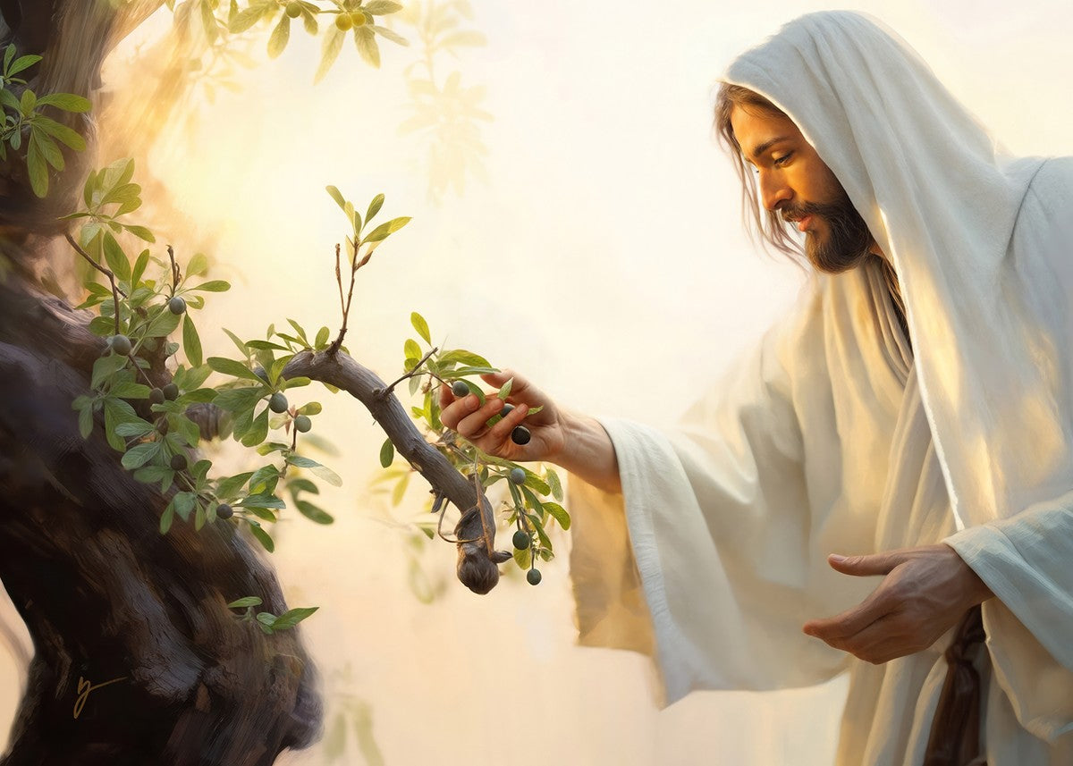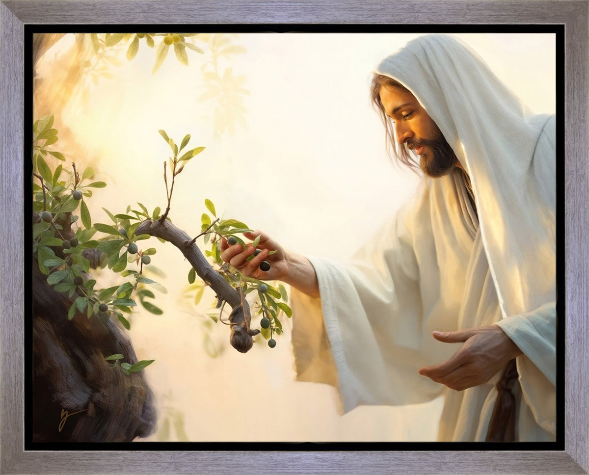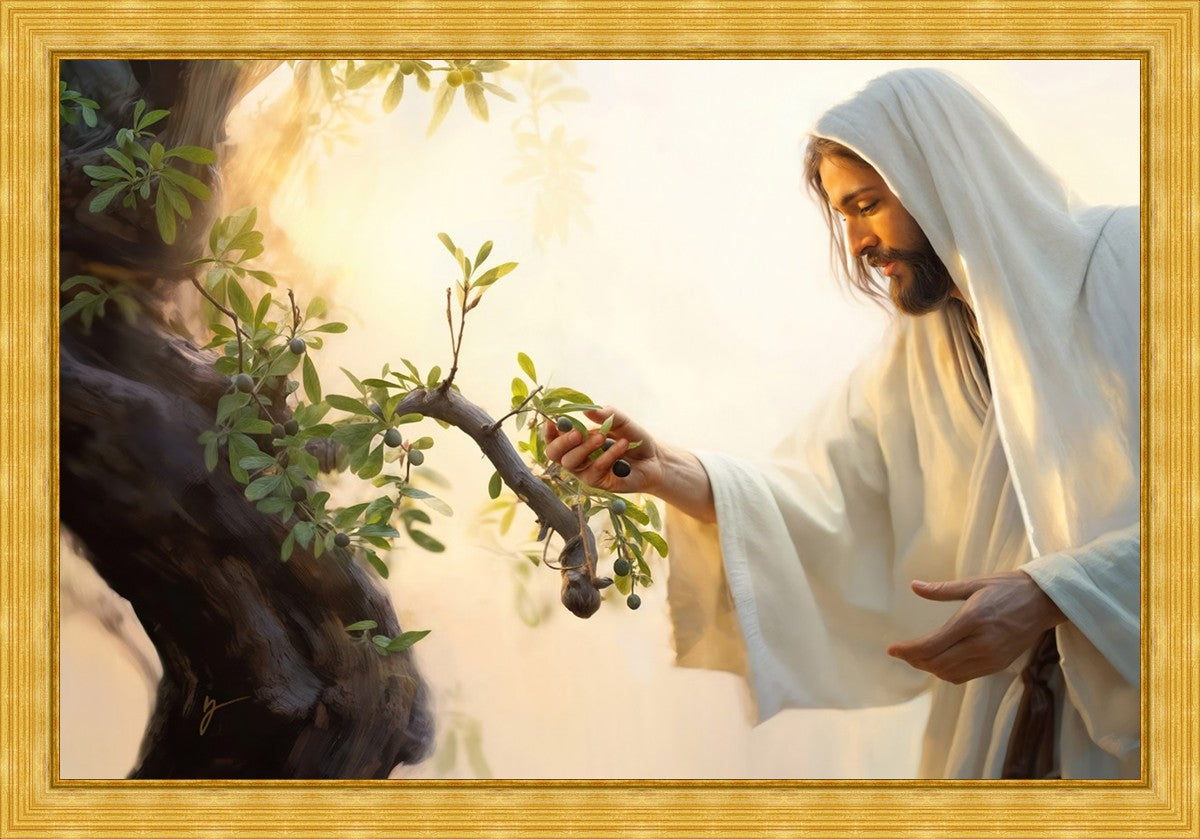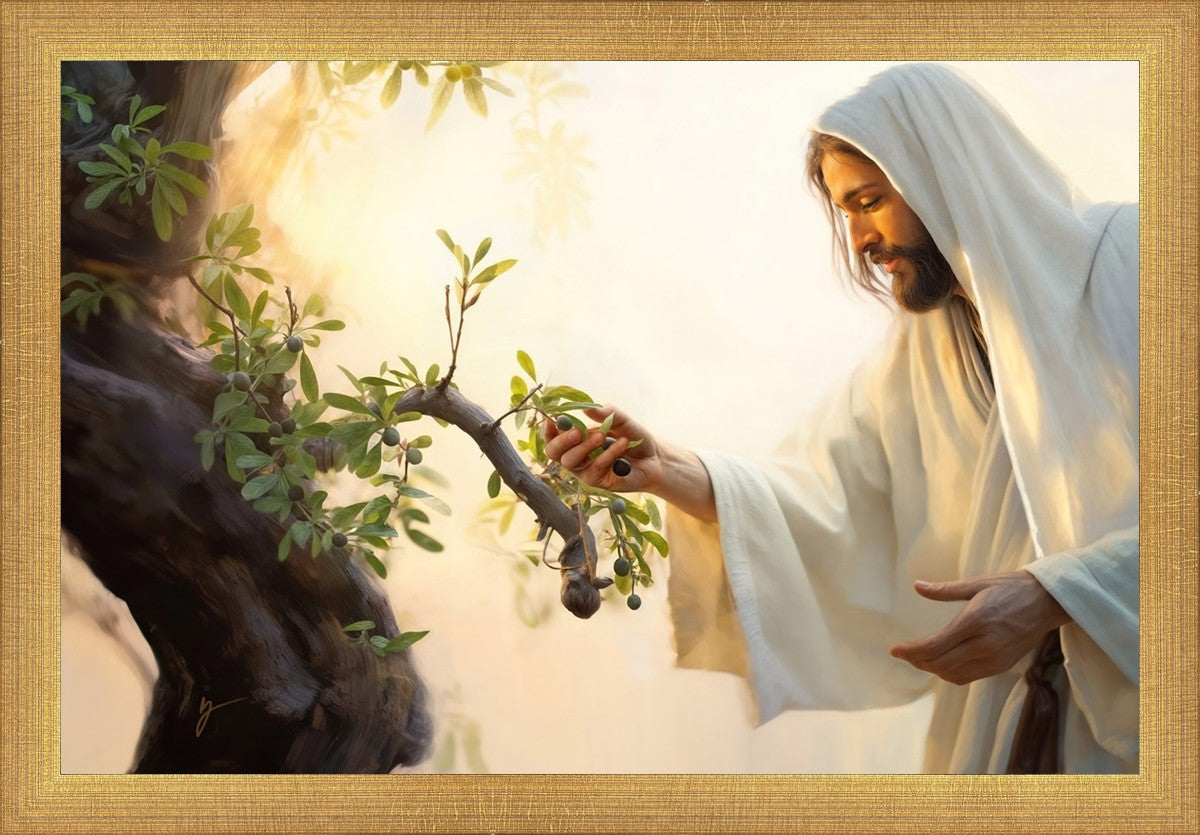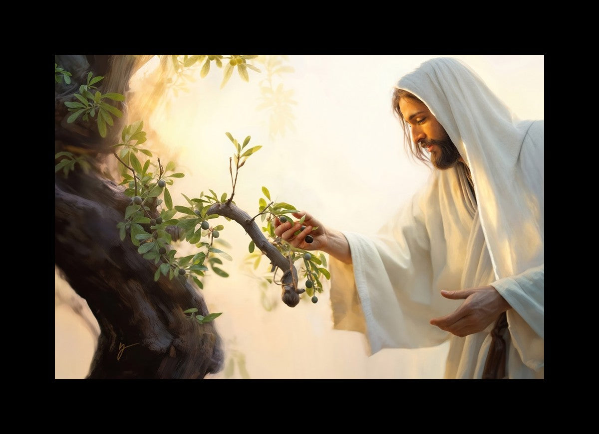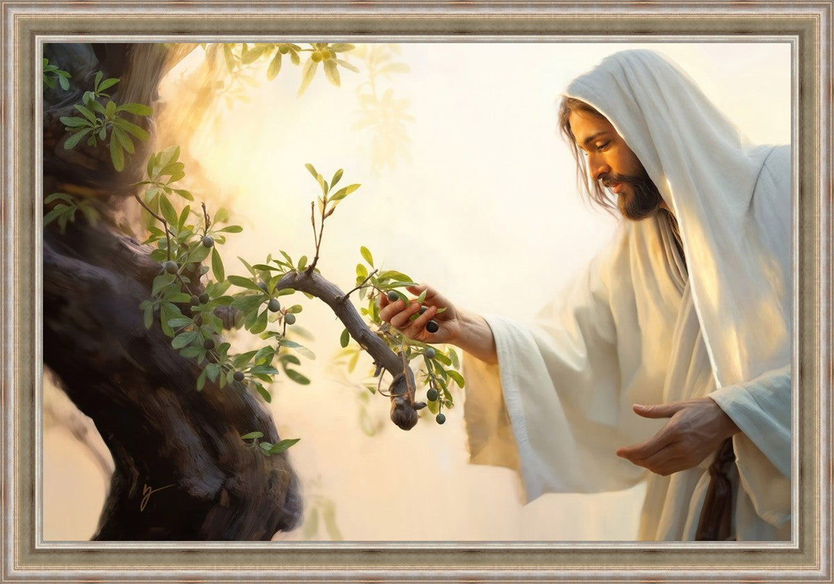 In this captivating moment, Jesus gathers olives from the branches, each fruit representing a soul chosen to be gathered unto Him. The radiant sun heralds the arrival of a new day, symbolizing the dawn of the final harvest where faithful saints are gathered in with the Lord. His head is veiled, a sign of His humility and devotion to the sacred task at hand.