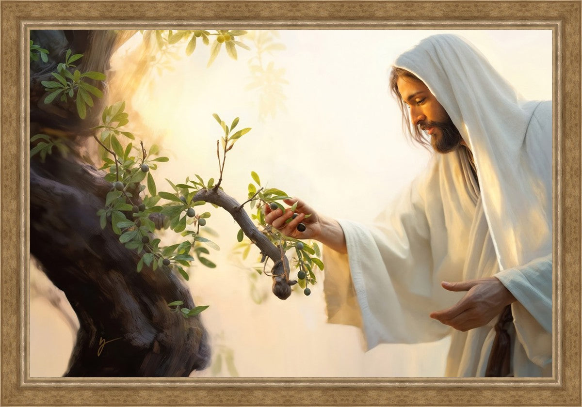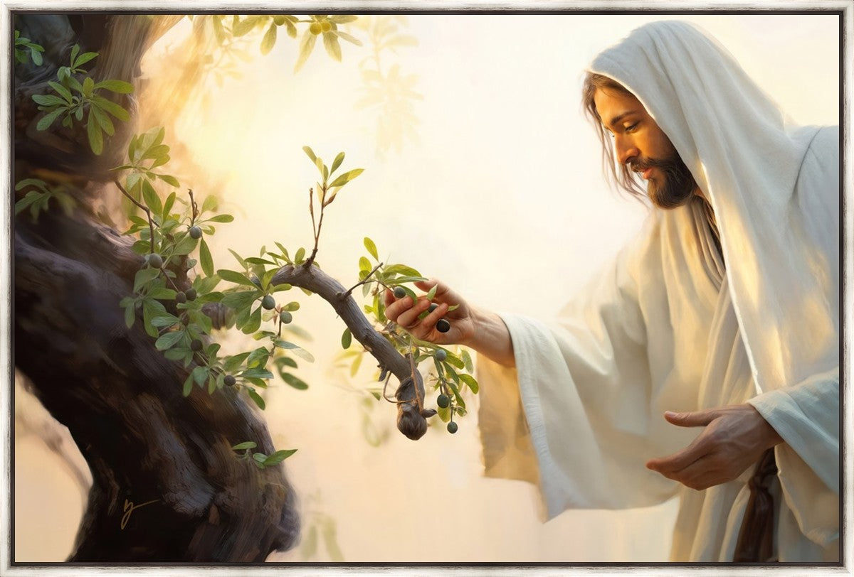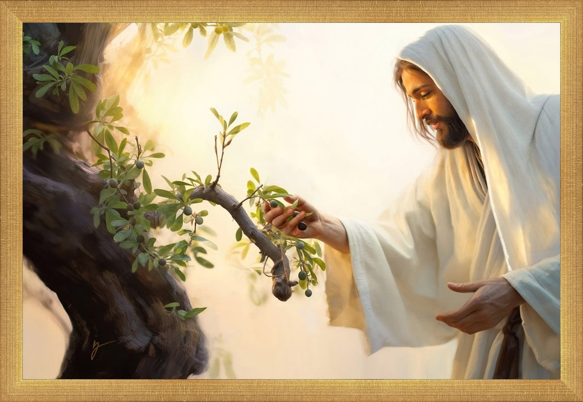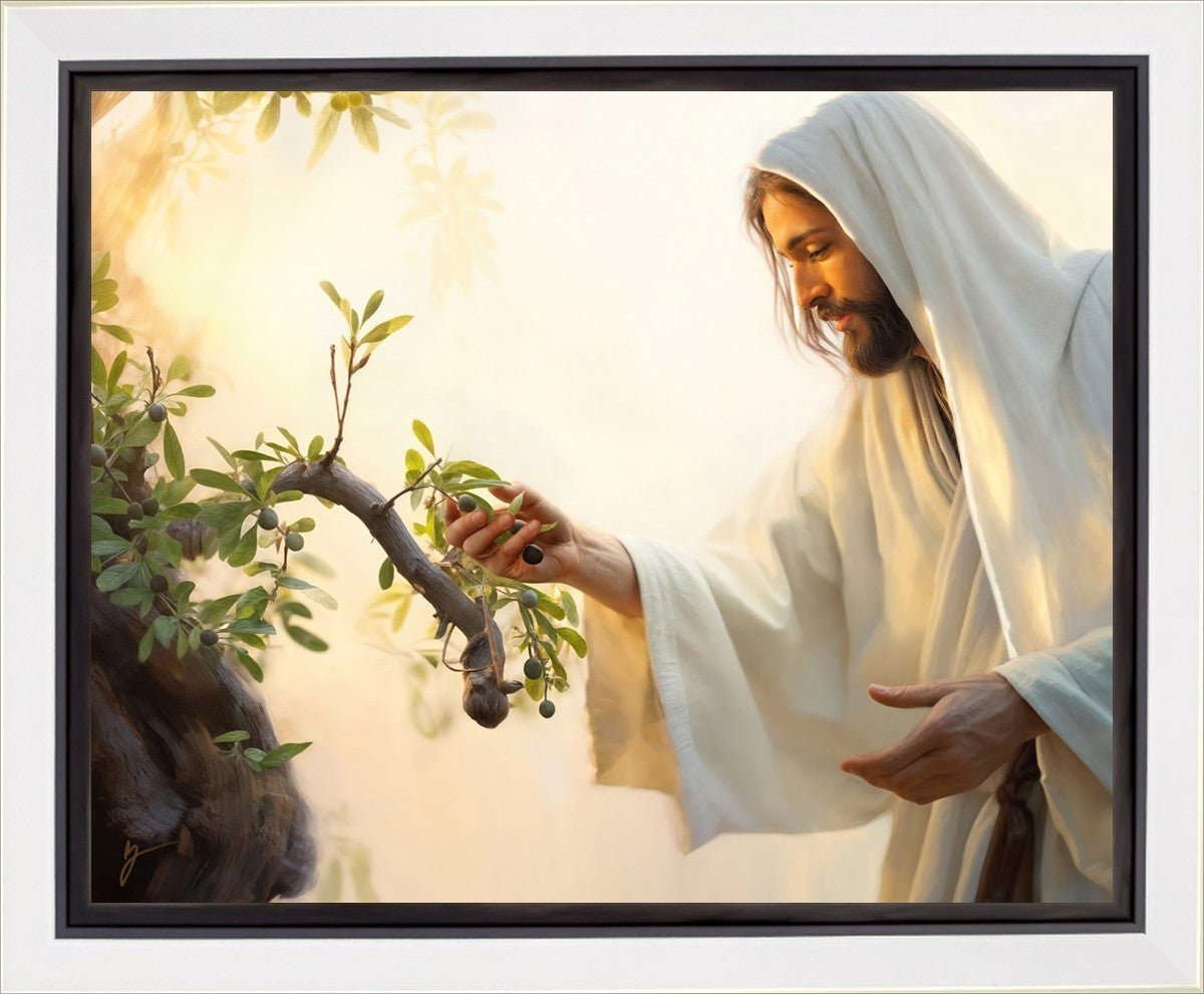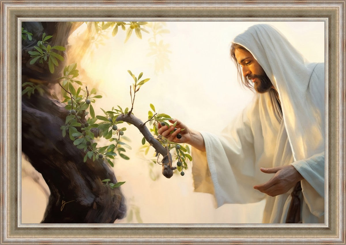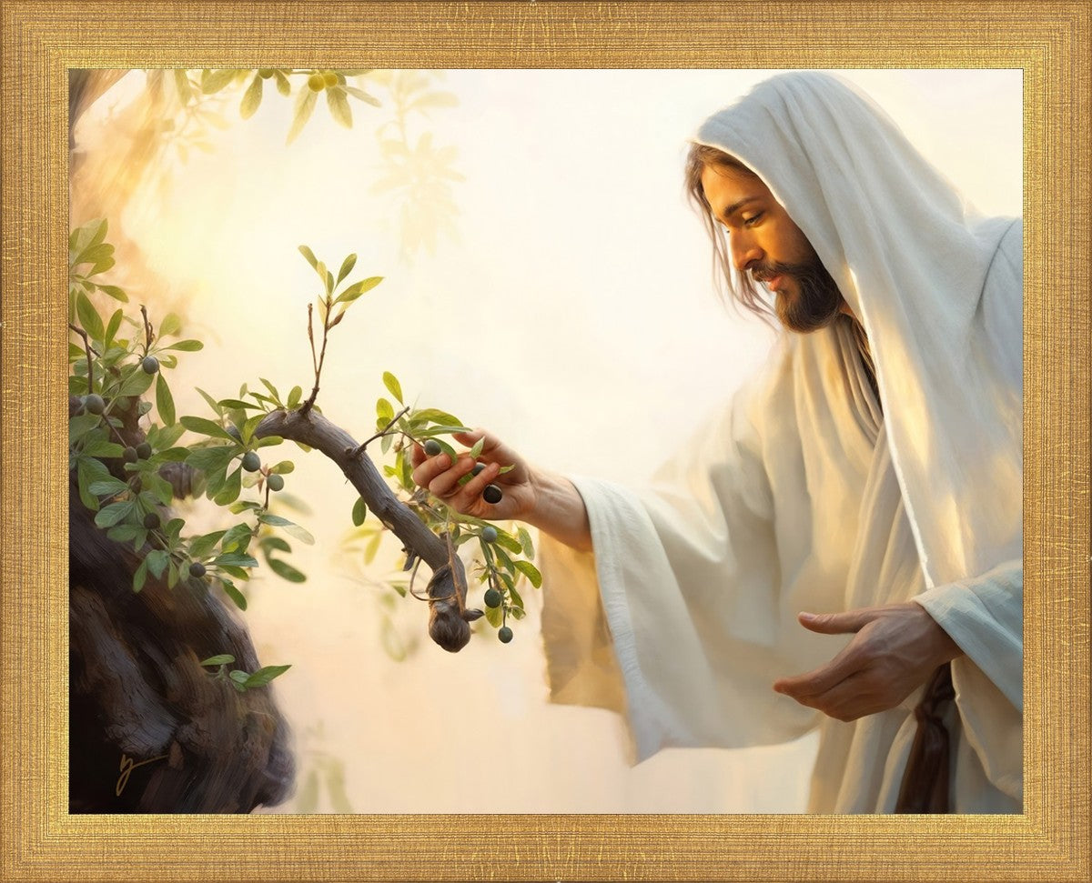 In this captivating moment, Jesus gathers olives from the branches, each fruit representing a soul chosen to be gathered unto Him. The radiant sun heralds the arrival of a new day, symbolizing the dawn of the final harvest where faithful saints are gathered in with the Lord. His head is veiled, a sign of His humility and devotion to the sacred task at hand.