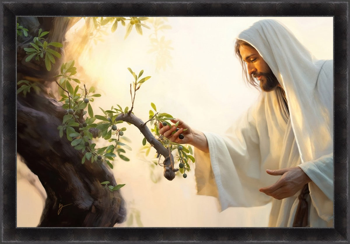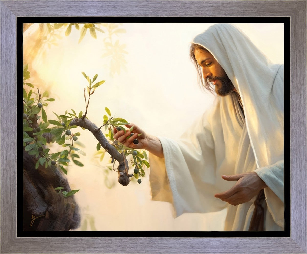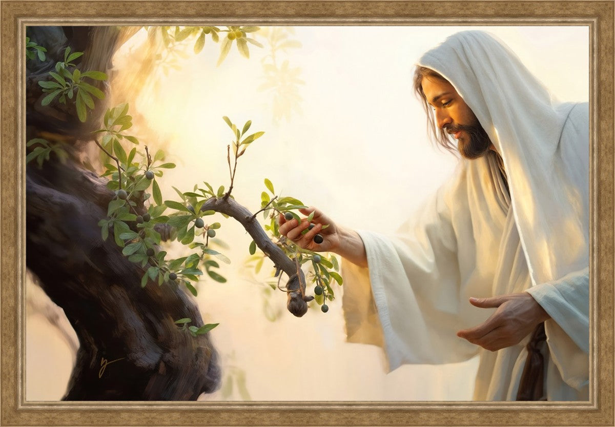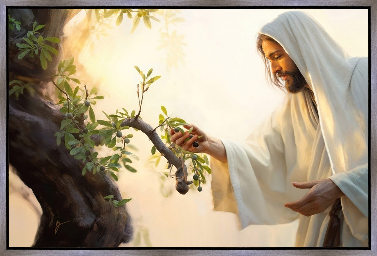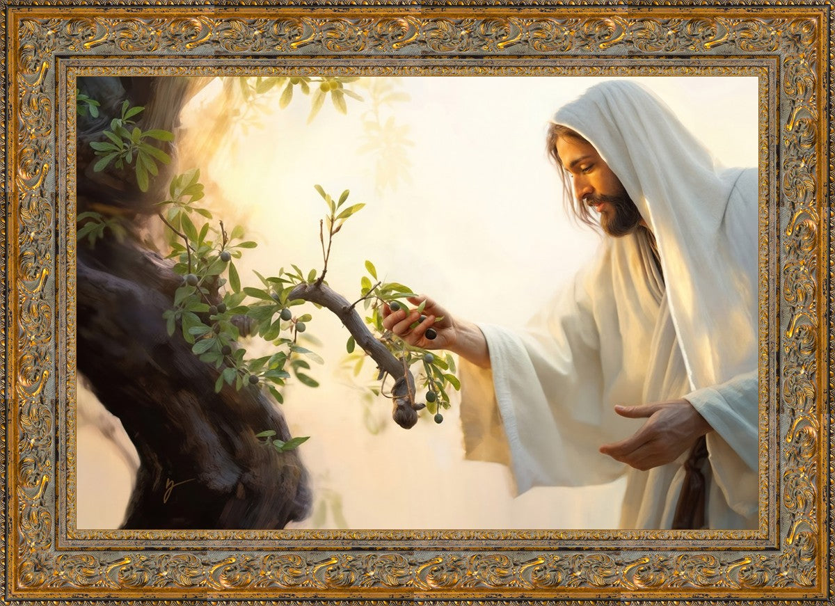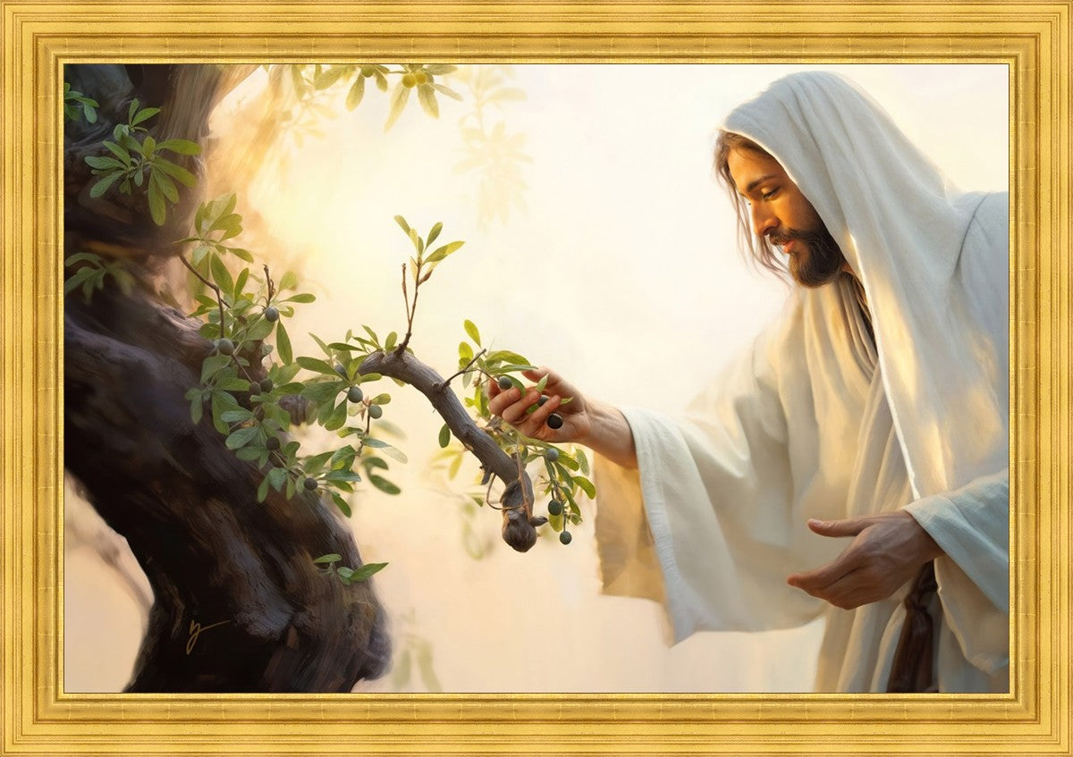 In this captivating moment, Jesus gathers olives from the branches, each fruit representing a soul chosen to be gathered unto Him. The radiant sun heralds the arrival of a new day, symbolizing the dawn of the final harvest where faithful saints are gathered in with the Lord. His head is veiled, a sign of His humility and devotion to the sacred task at hand.