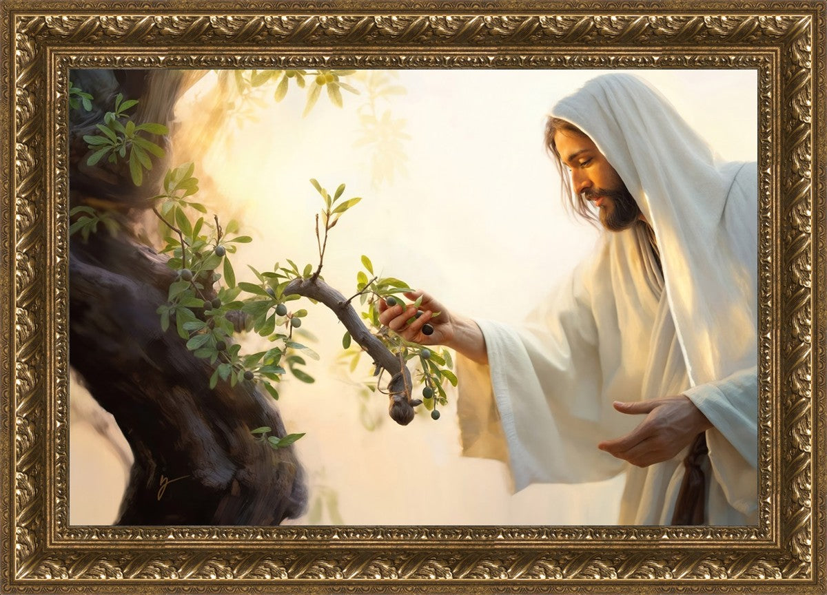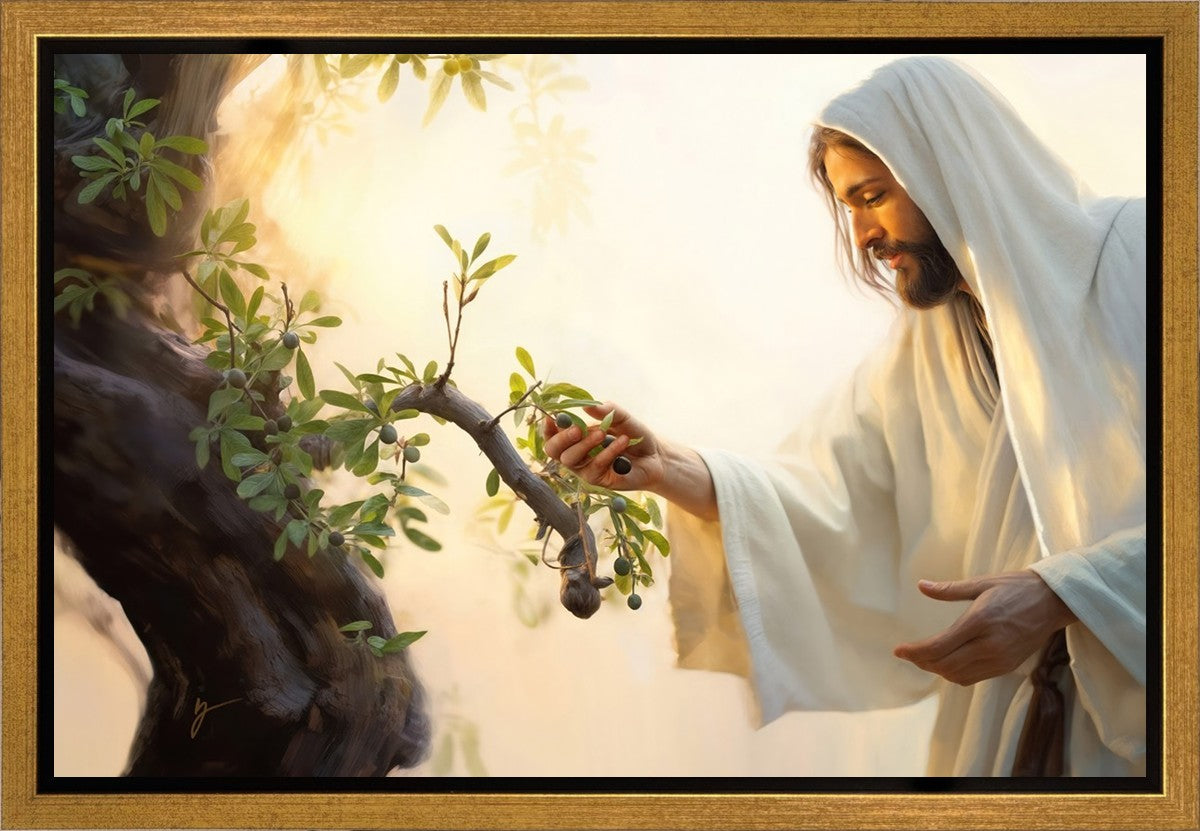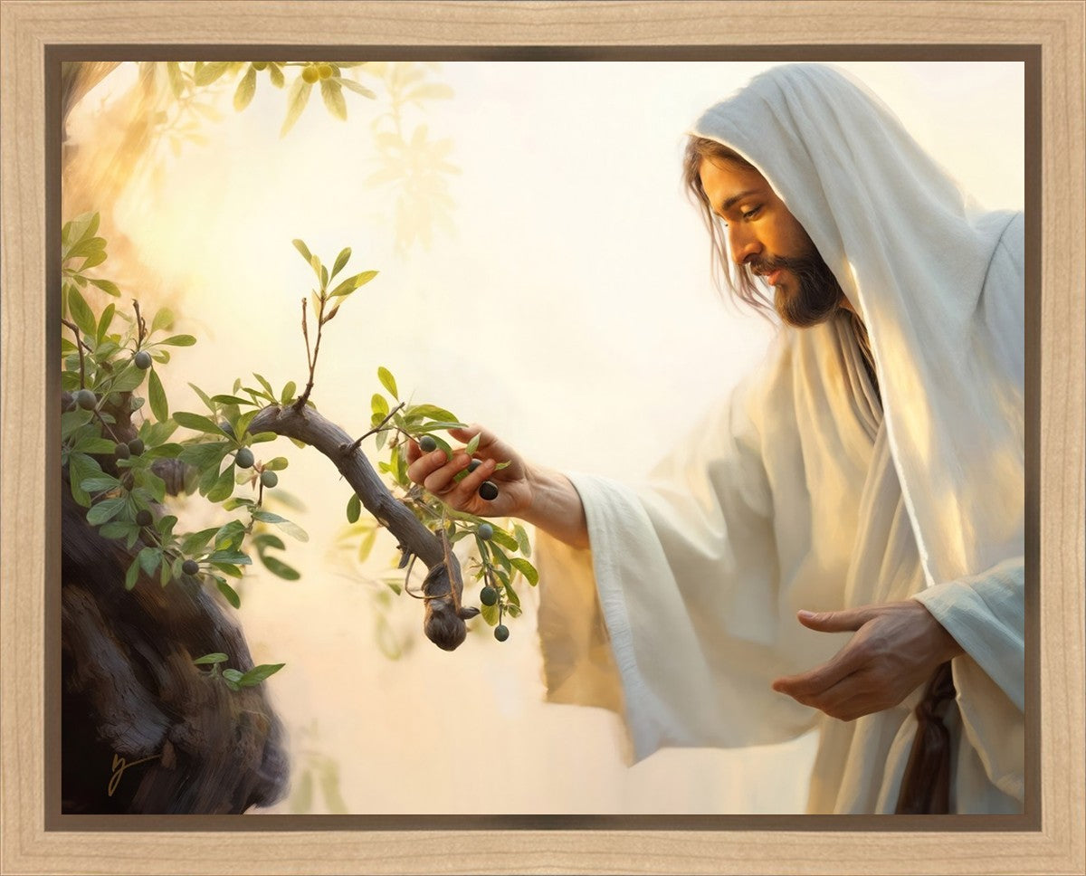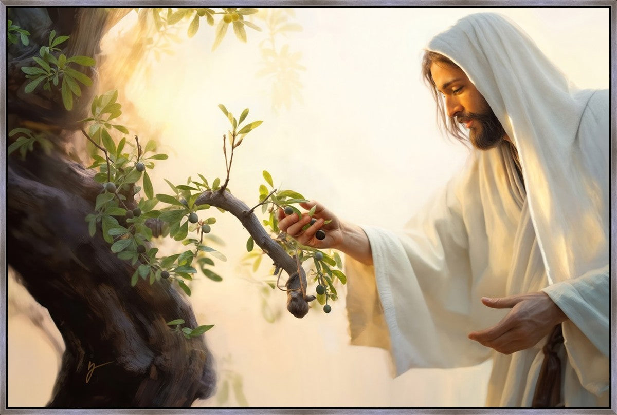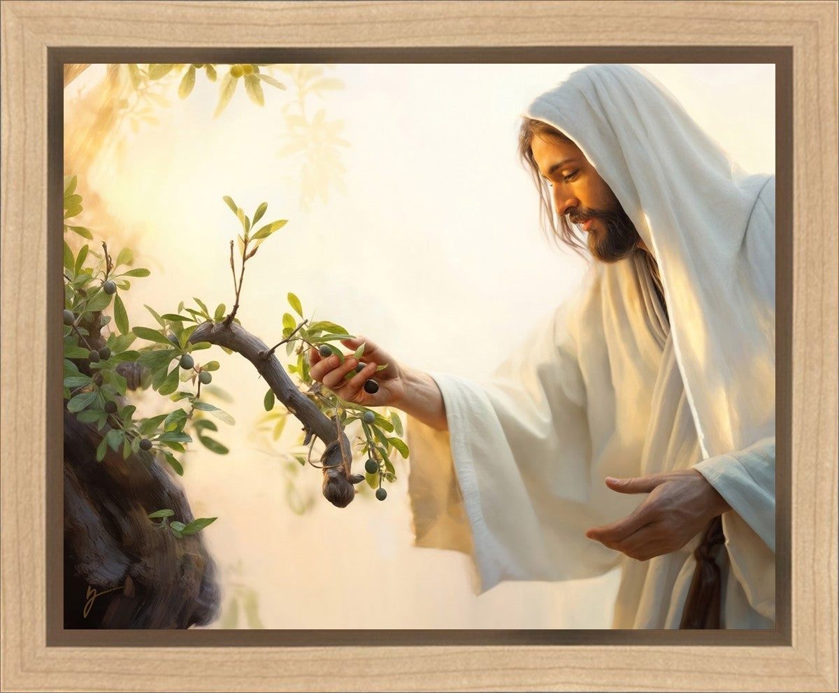 In this captivating moment, Jesus gathers olives from the branches, each fruit representing a soul chosen to be gathered unto Him. The radiant sun heralds the arrival of a new day, symbolizing the dawn of the final harvest where faithful saints are gathered in with the Lord. His head is veiled, a sign of His humility and devotion to the sacred task at hand.