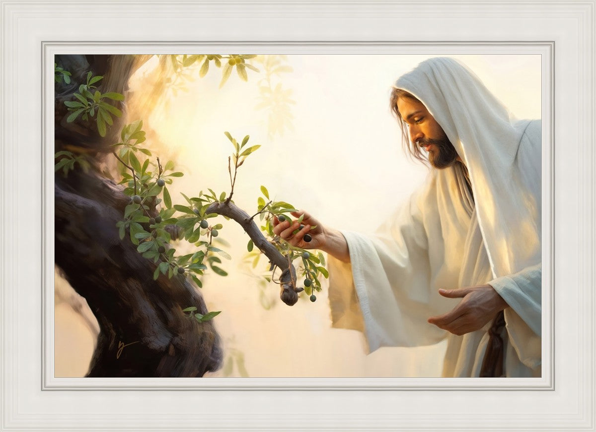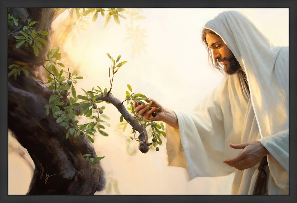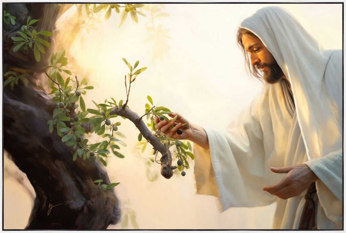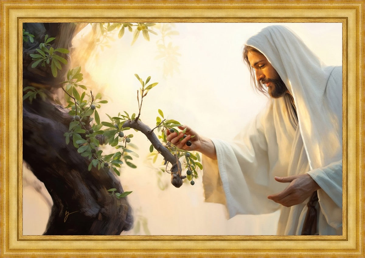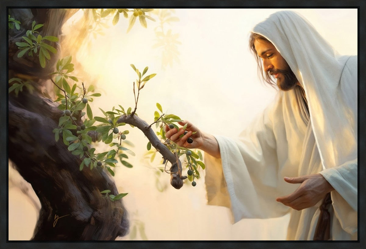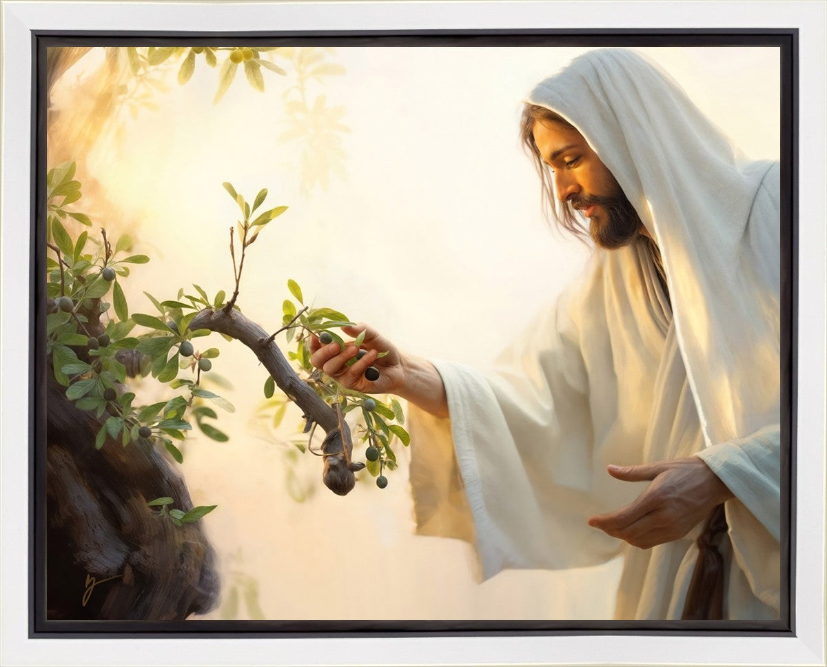 In this captivating moment, Jesus gathers olives from the branches, each fruit representing a soul chosen to be gathered unto Him. The radiant sun heralds the arrival of a new day, symbolizing the dawn of the final harvest where faithful saints are gathered in with the Lord. His head is veiled, a sign of His humility and devotion to the sacred task at hand.