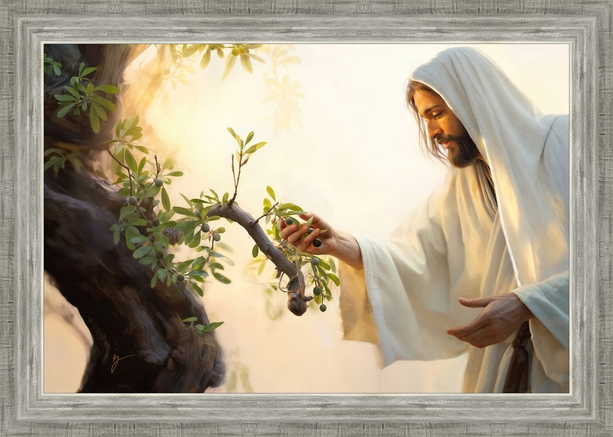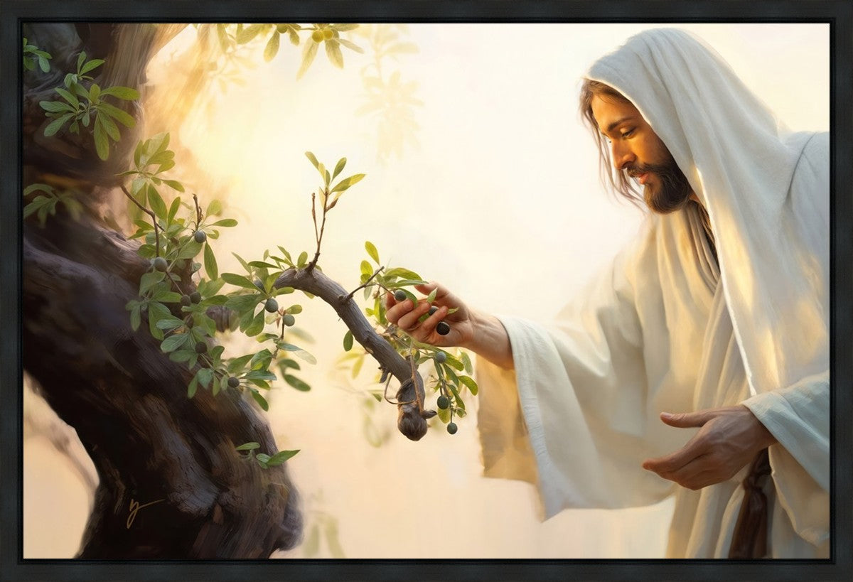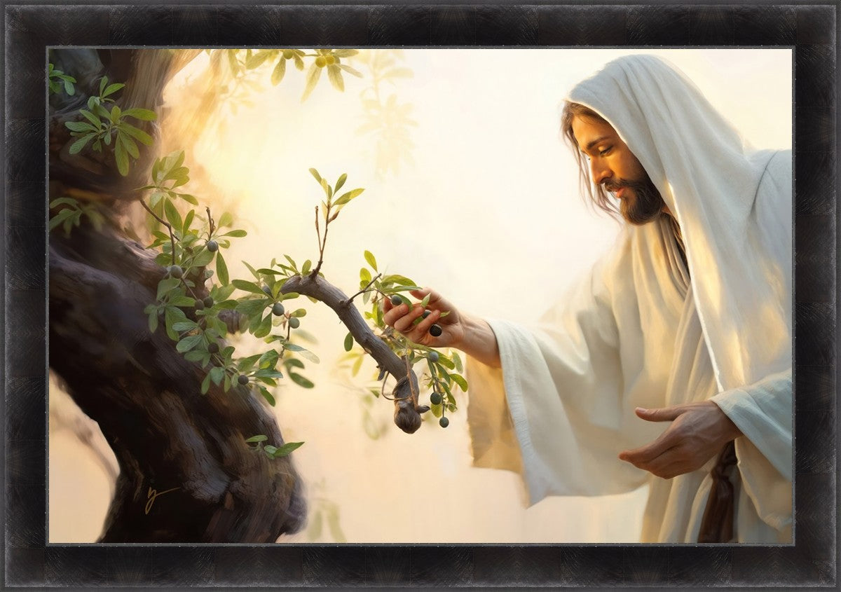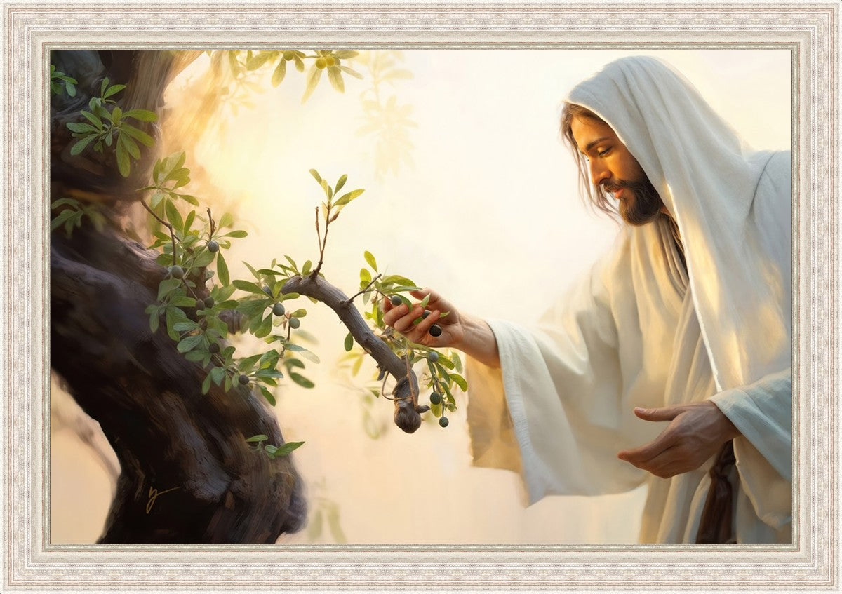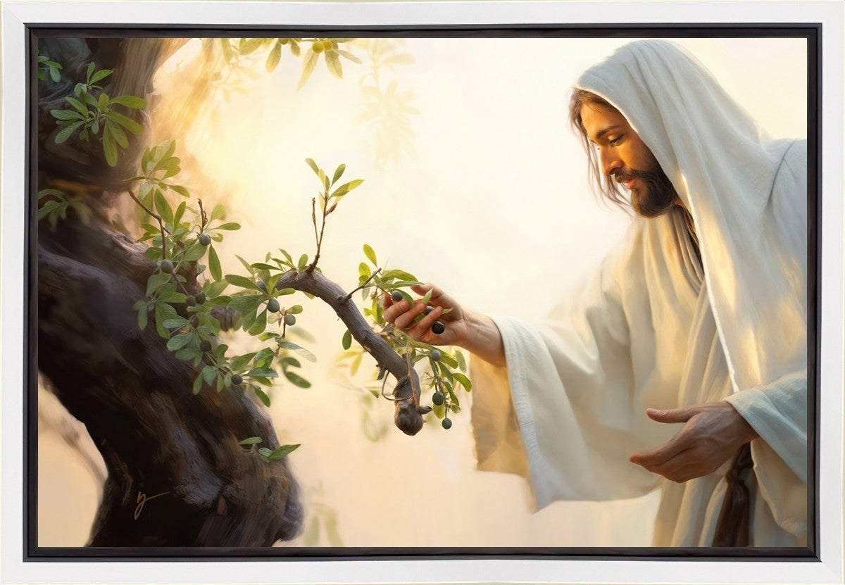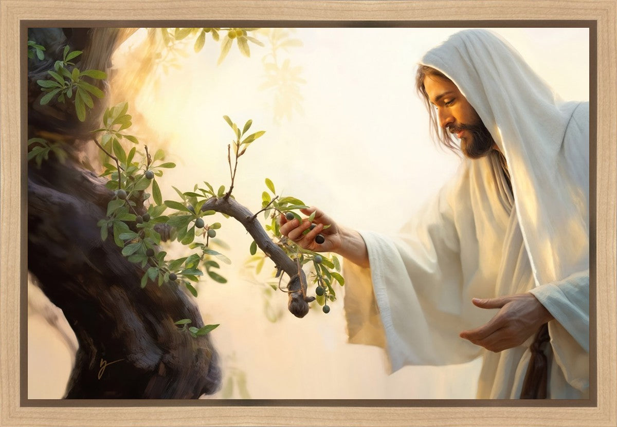 In this captivating moment, Jesus gathers olives from the branches, each fruit representing a soul chosen to be gathered unto Him. The radiant sun heralds the arrival of a new day, symbolizing the dawn of the final harvest where faithful saints are gathered in with the Lord. His head is veiled, a sign of His humility and devotion to the sacred task at hand.