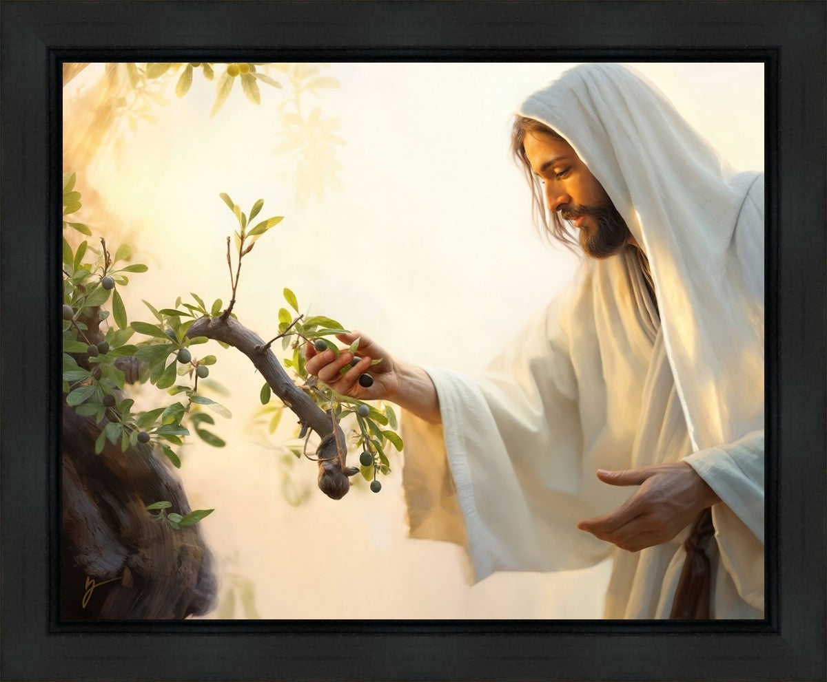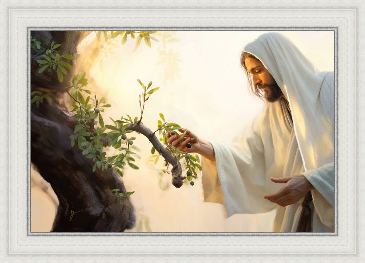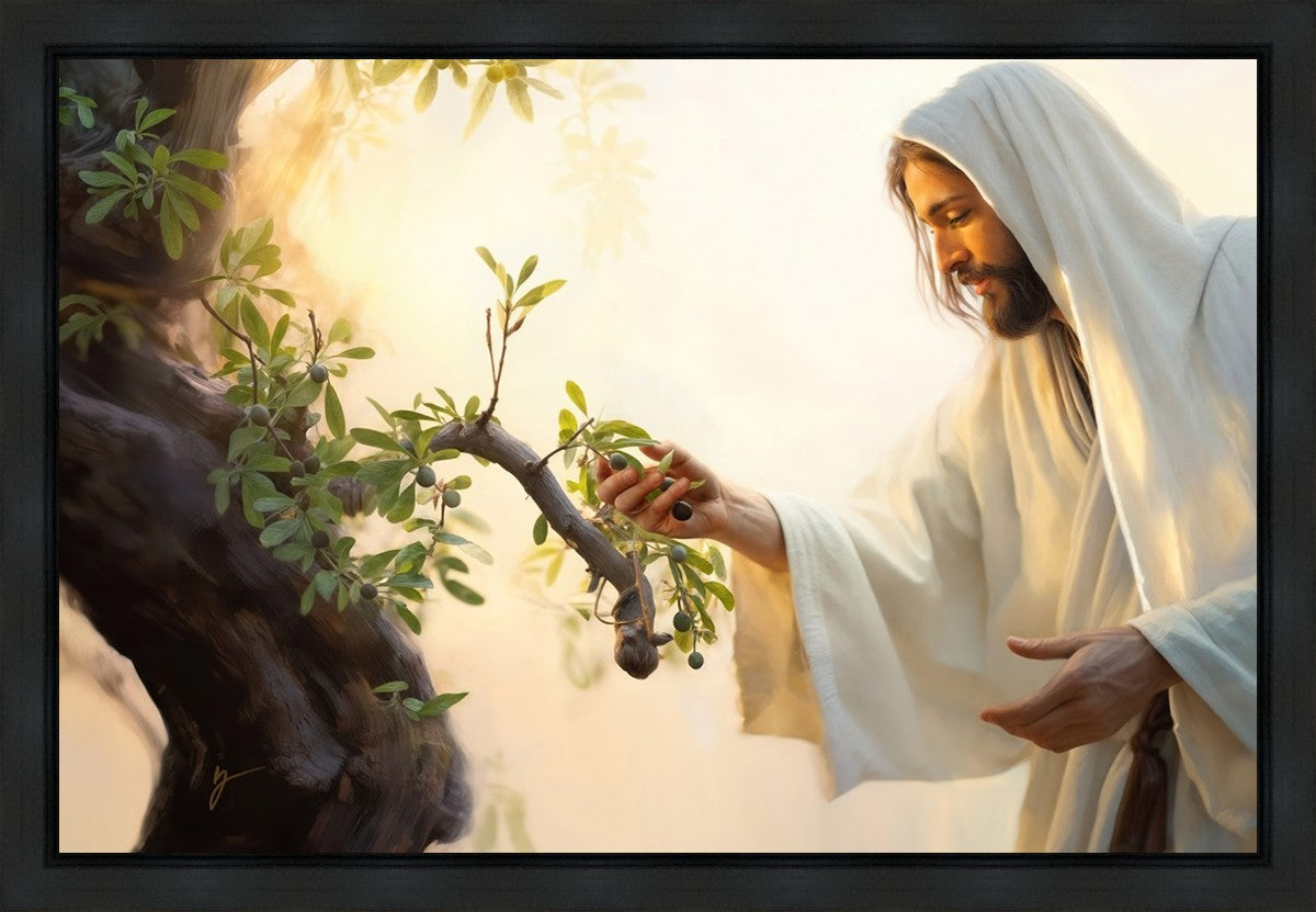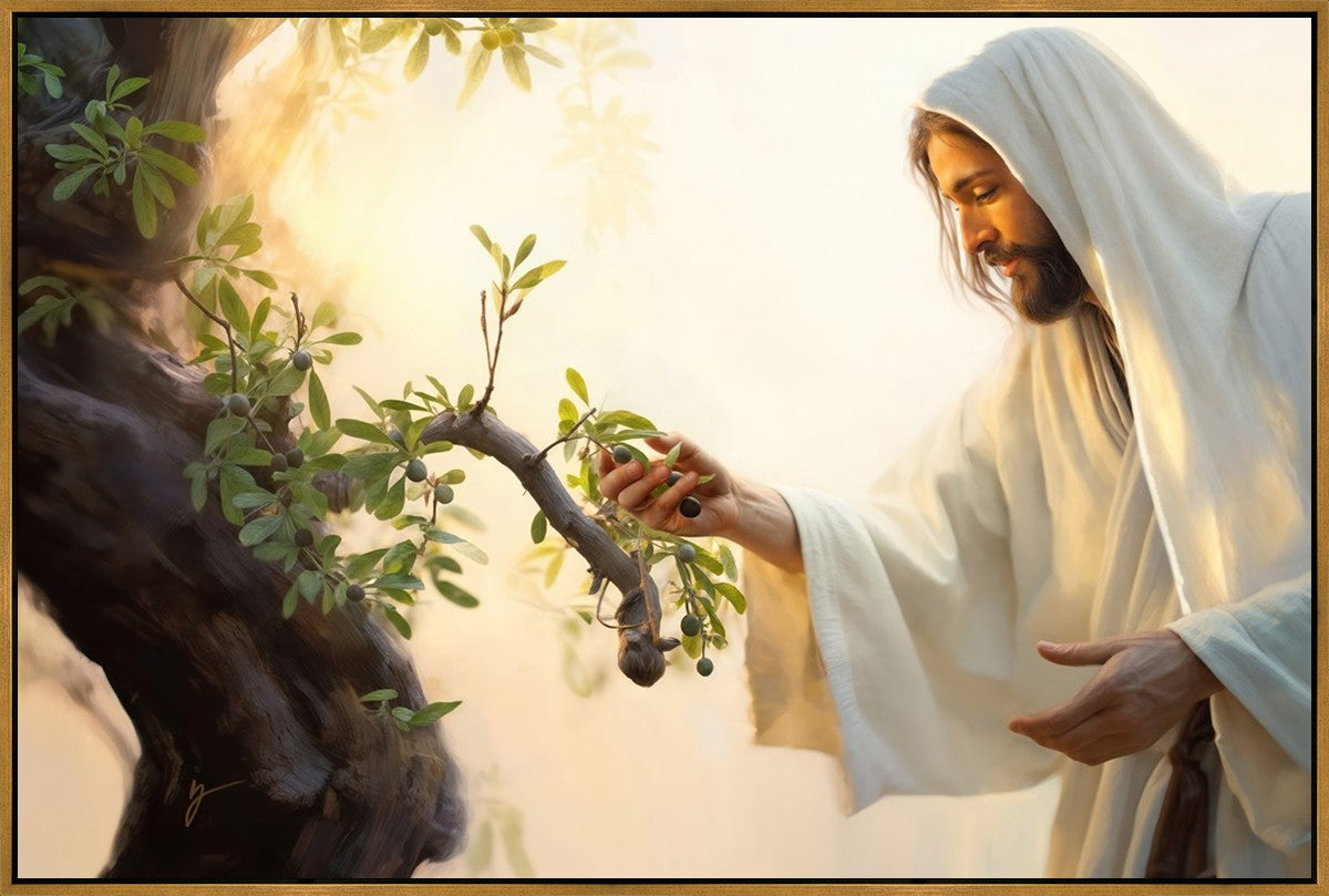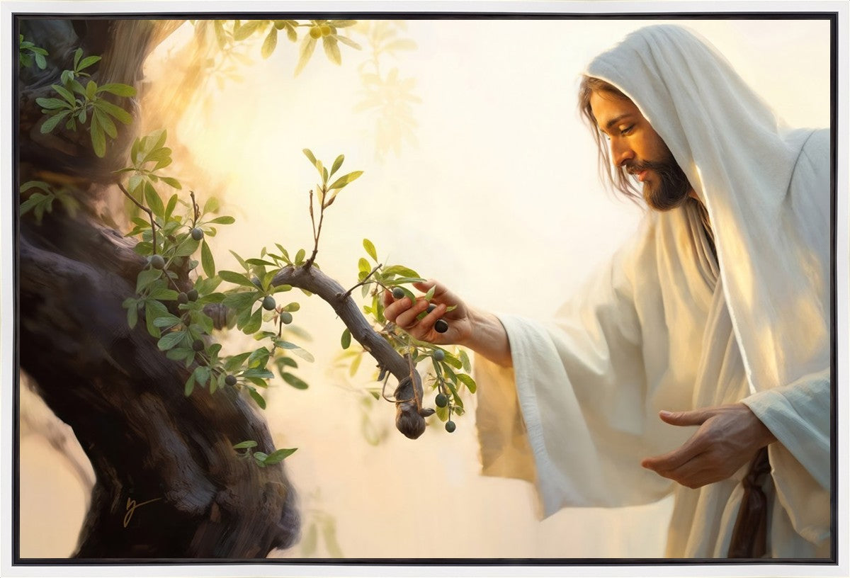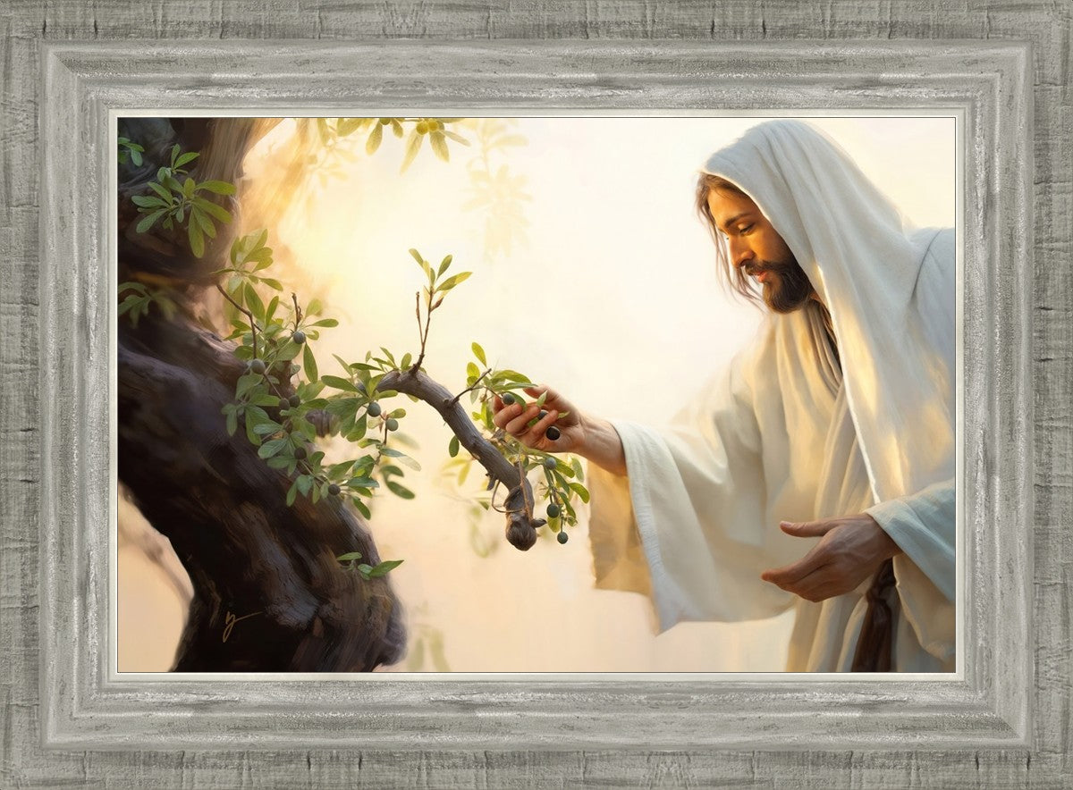 In this captivating moment, Jesus gathers olives from the branches, each fruit representing a soul chosen to be gathered unto Him. The radiant sun heralds the arrival of a new day, symbolizing the dawn of the final harvest where faithful saints are gathered in with the Lord. His head is veiled, a sign of His humility and devotion to the sacred task at hand.