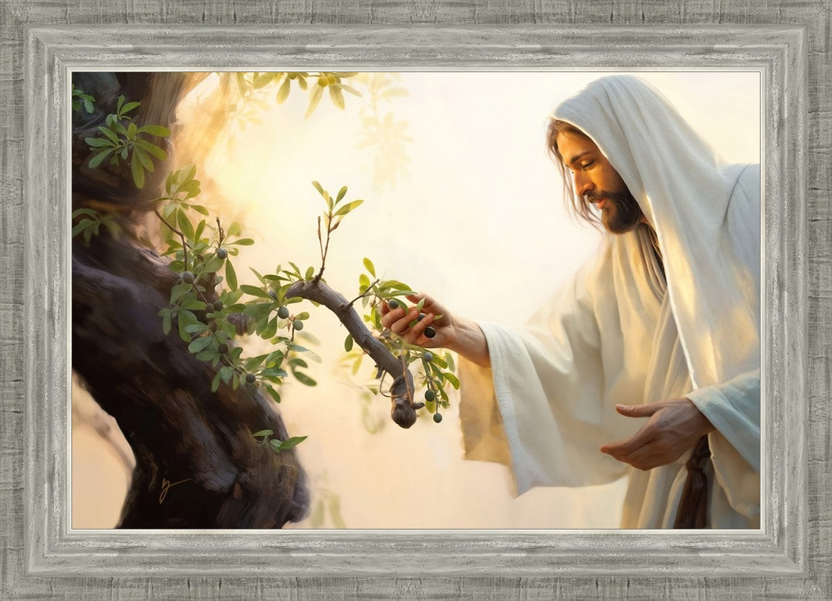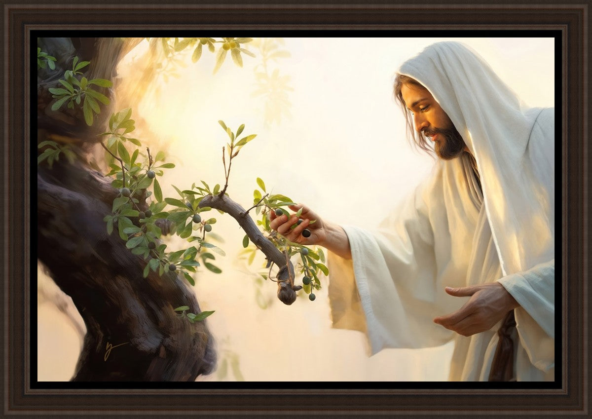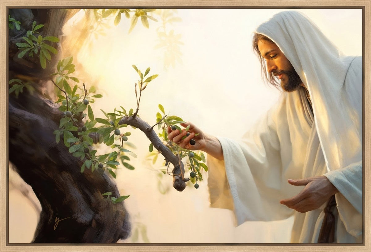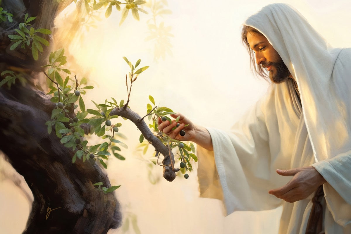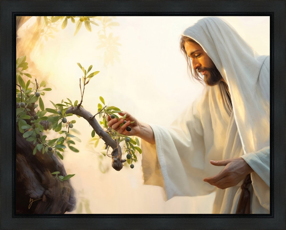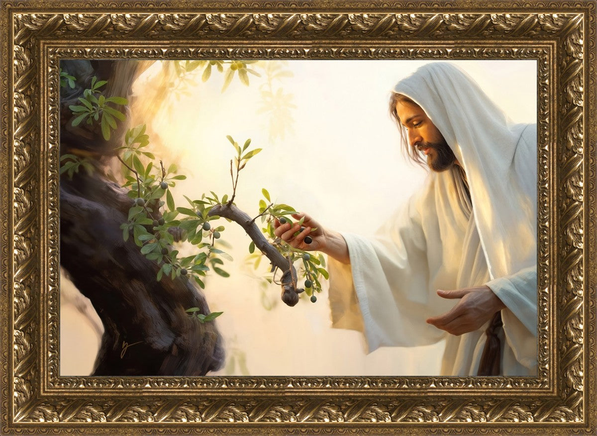 In this captivating moment, Jesus gathers olives from the branches, each fruit representing a soul chosen to be gathered unto Him. The radiant sun heralds the arrival of a new day, symbolizing the dawn of the final harvest where faithful saints are gathered in with the Lord. His head is veiled, a sign of His humility and devotion to the sacred task at hand.